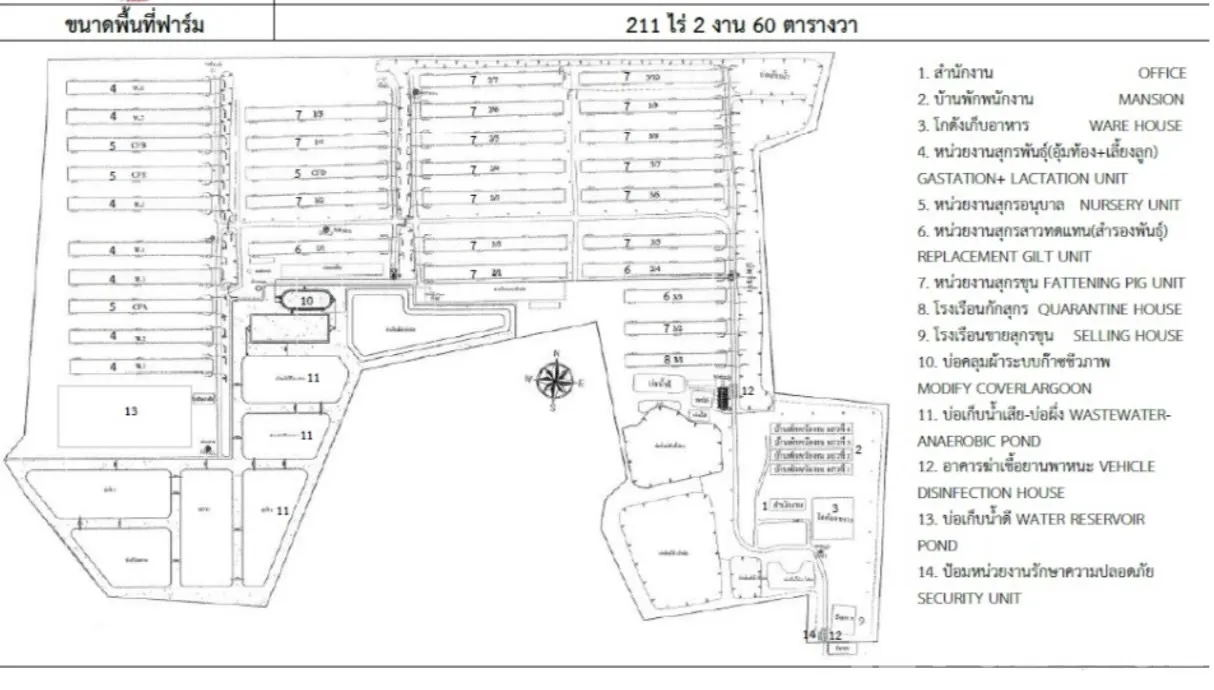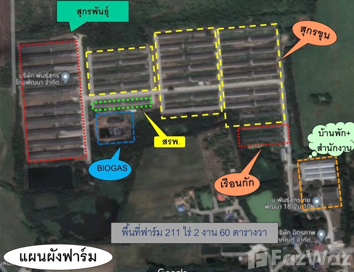• พื้นที่ ที่ดินพร้อมสิ่งปลูกสร้างฟาร์มสุกร พื้นที่ 211 ไร่ 2 งาน 60 ตรว