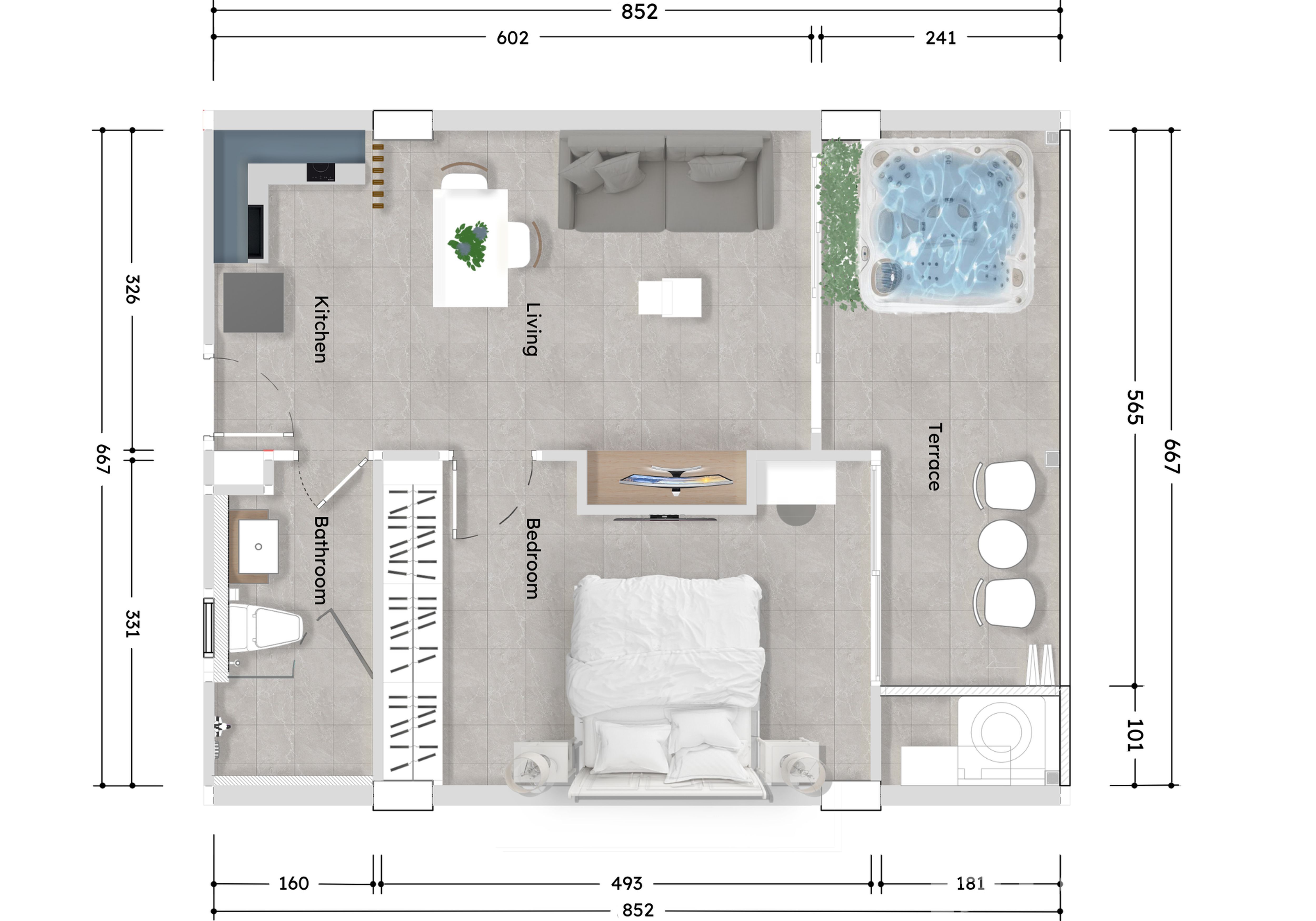 เป็นยูนิตที่ขายพร้อมกับเฟอร์นิเจอร์ครบชุด ที่เรียกได้ว่าเพียงแค่ยกกระเป๋าเสื้อผ้าเข้าไปก็สามารถอยู่อาศัยได้ทันที โดยมักจะมีเฟอร์นิเจอร์ตั้งแต่โซฟา ชั้นวางทีวี ในห้องรับแขก หรืออุปกรณ์เครื่องครัวทั้งหมด รวมไปถึงโต๊ะอาหาร ไล่เรียงไปยังเตียงนอนและตู้เสื้อผ้า ในห้องนอน (รายละเอียดปลีกย่อยอื่นๆ ขึ้นอยู่กับแต่ละยูนิต)