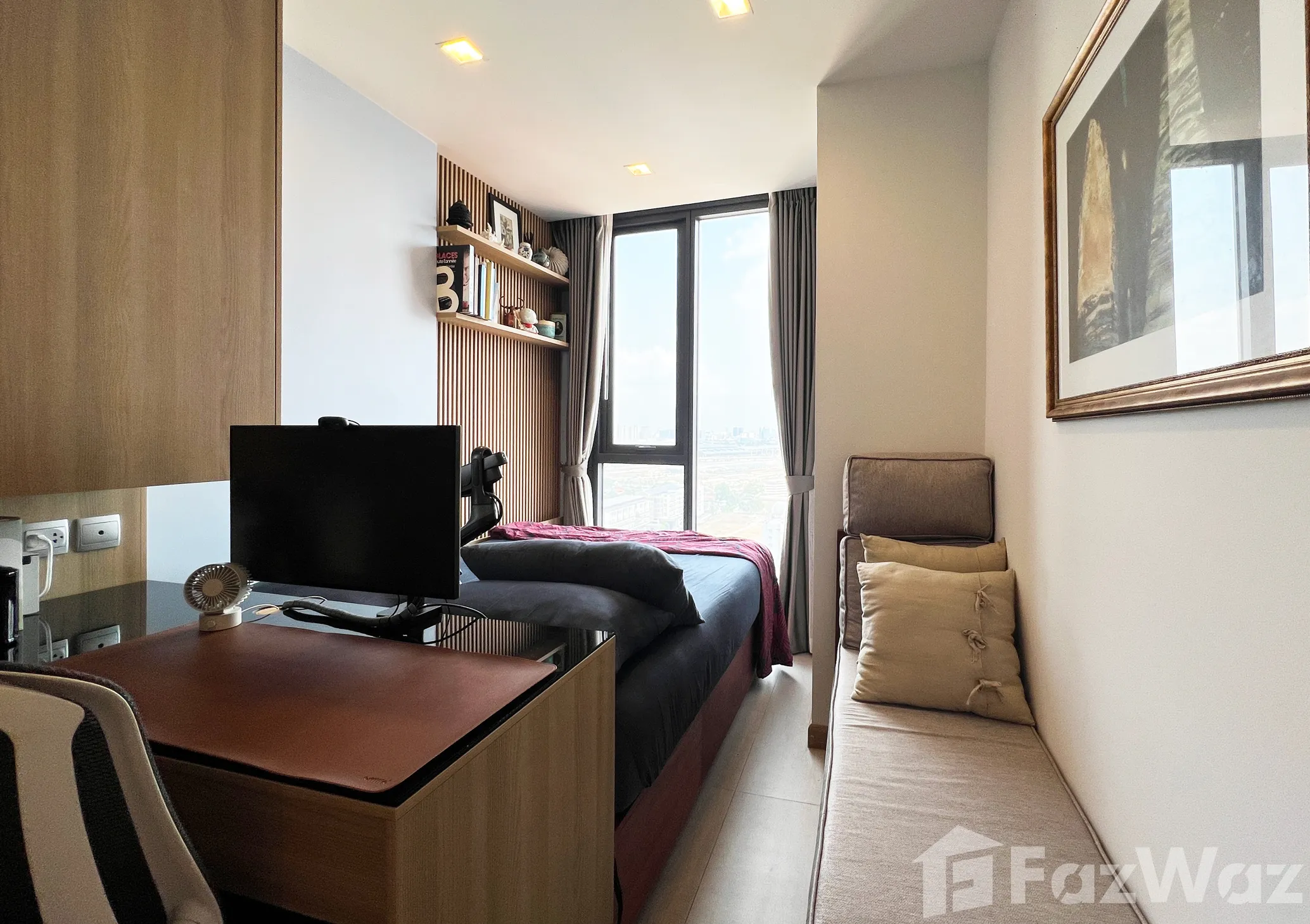 วางเตียงให้หันรับวิวเมืองเปิดโล่งเต็มๆ อย่างลงตัว ทั้งกลางวัน-กลางคืน