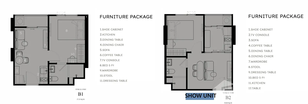 เป็นยูนิตที่ขายพร้อมกับการตกแต่งแบบบิ้วท์อิน ซึ่งก็คือการติดตั้งเฟอร์นิเจอร์แบบฝังติดไปกับผนัง ไม่สามารถเคลื่อนย้ายได้ ยกตัวอย่างเช่น ชั้นวางทีวี ในห้องรับแขก เคาท์เตอร์ครัว เฟอร์นิเจอร์แบบหล่อด้วยปูน รวมไปถึงแบบตอกติดไปกับพื้นหรือผนัง