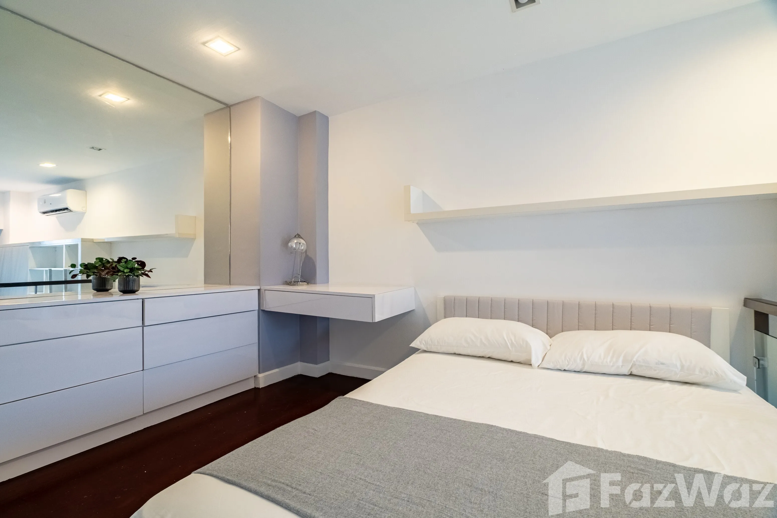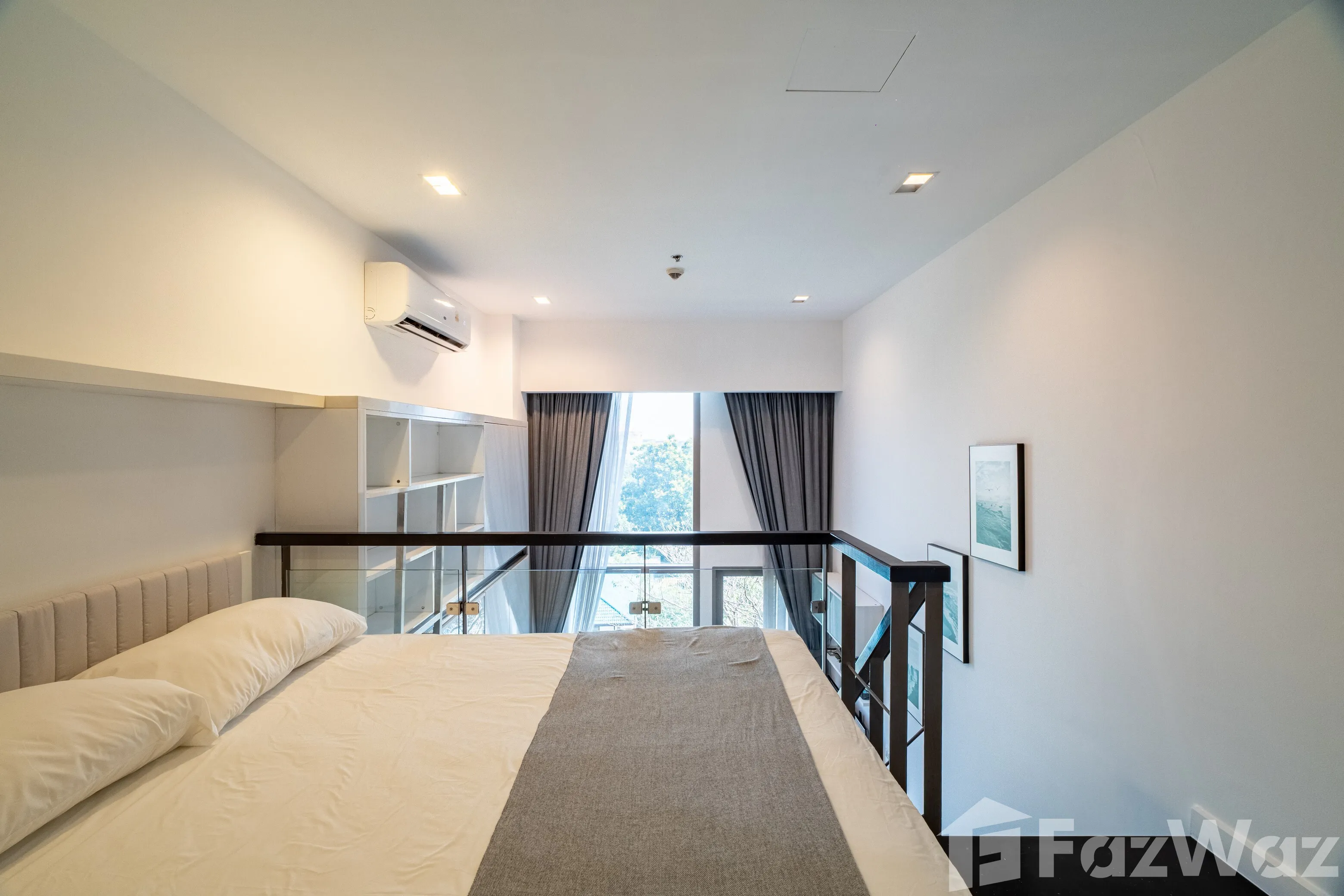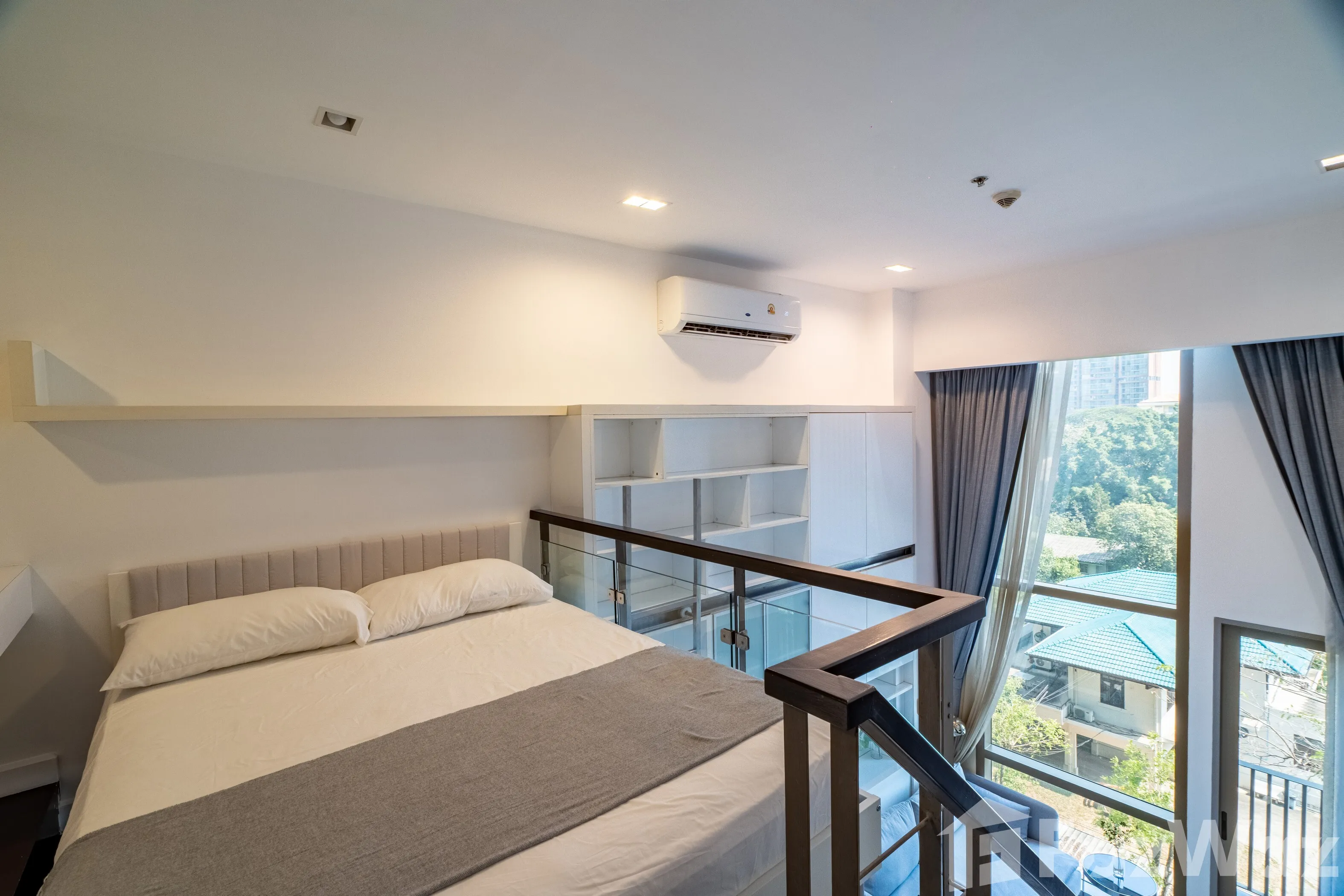 ชั้นบนเป็นพื้นที่ห้องนอนที่ให้ความเป็นส่วนตัวและความสงบ พร้อมรับแสงธรรมชาติอย่างพอดีด้วยการจัดวางพื้นที่อย่างชาญฉลาด ภายในห้องครบครันด้วยเครื่องใช้ไฟฟ้าจำเป็น ได้แก่ ไมโครเวฟ ทีวี และเครื่องซักผ้า พร้อมเข้าอยู่ได้ทันที