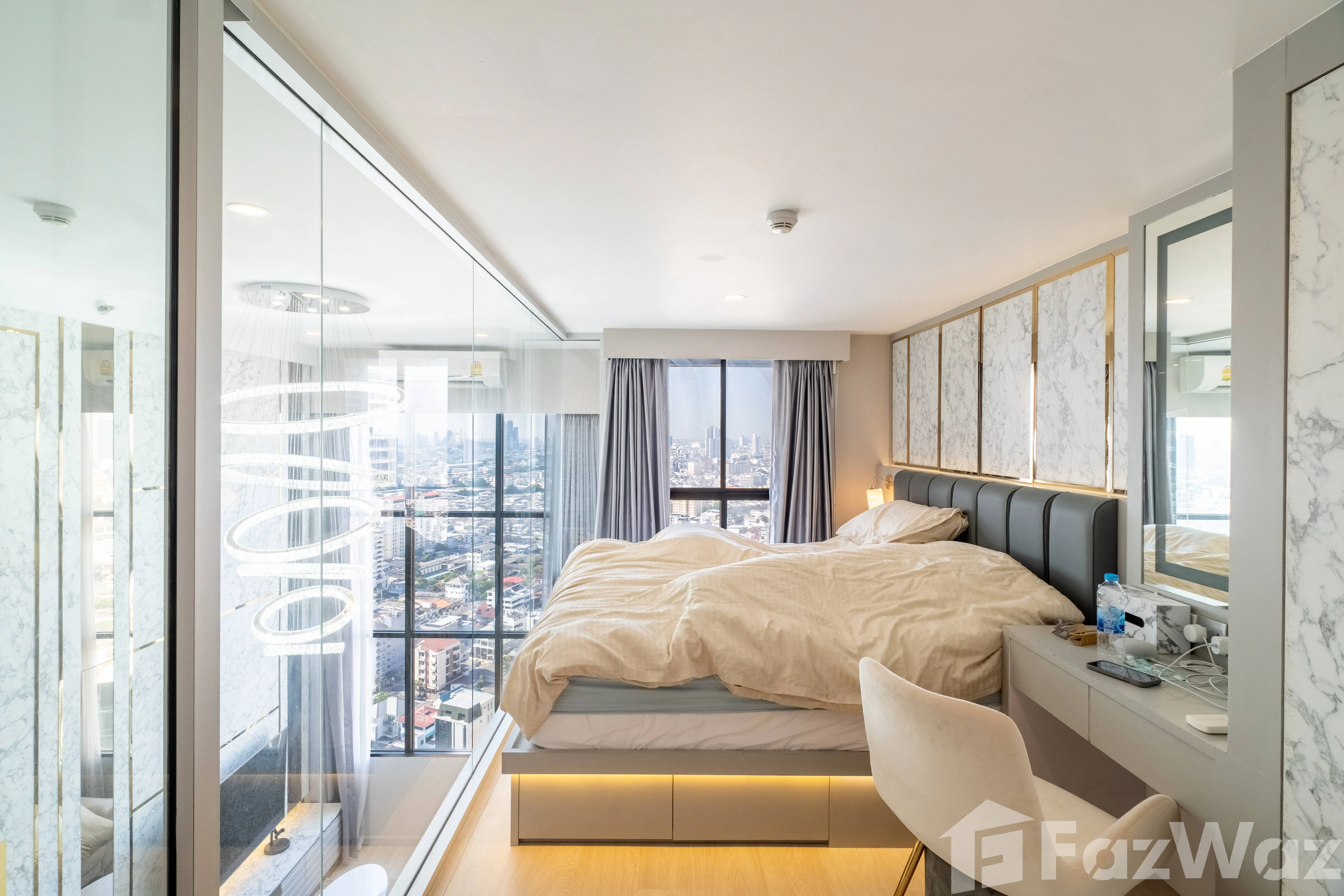 เพดานสูงแบบ Double-Height ช่วยให้พื้นที่โปร่งโอ่โถง ผนังกระจกสูงจรดเพดานเปิดรับวิวเมืองกรุงเทพฯ แบบไร้สิ่งบดบังทั้งกลางวันและกลางคืน พร้อมระเบียงส่วนตัวที่เหมาะสำหรับพักผ่อนและดื่มด่ำกับวิวพาโนรามา
