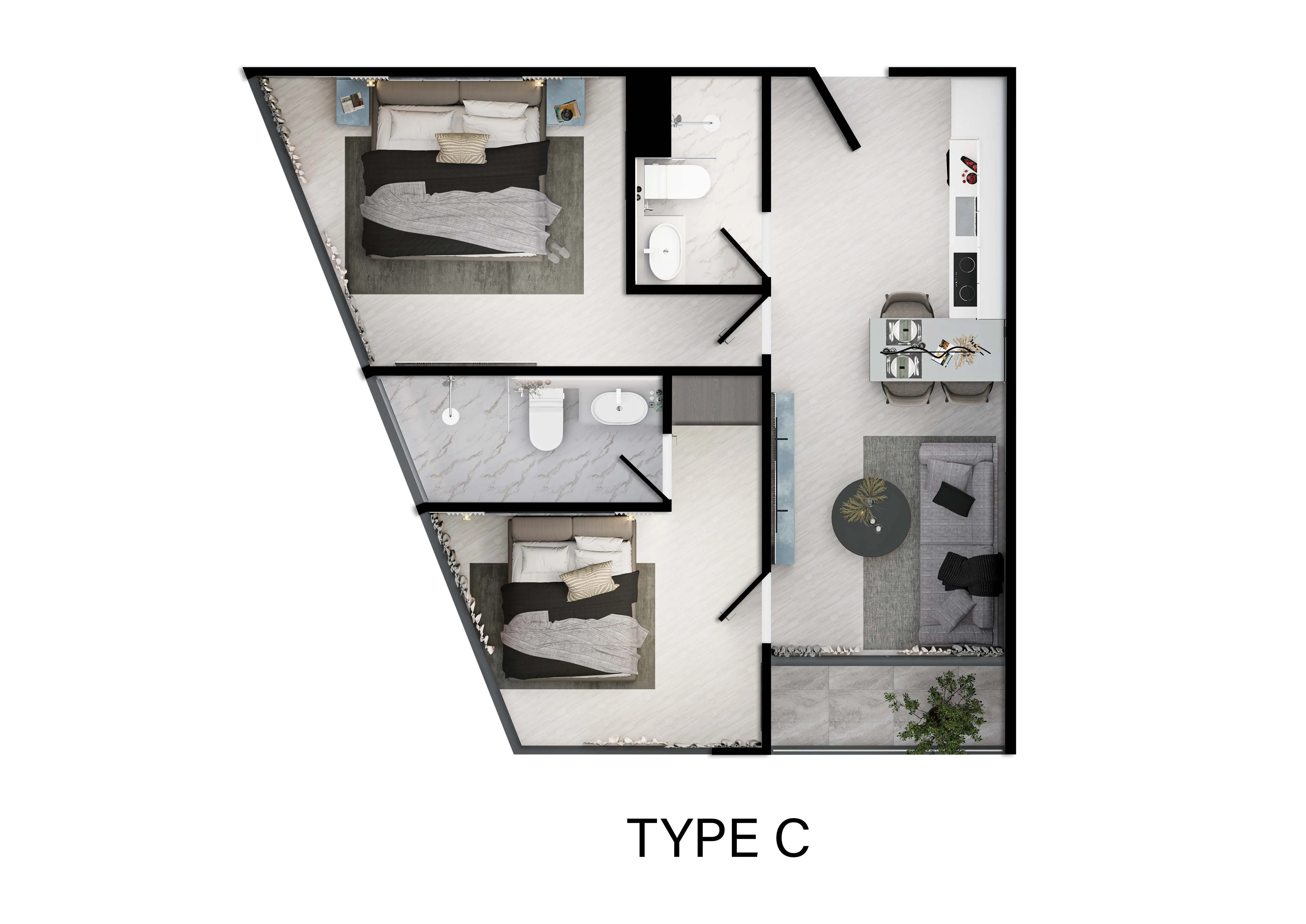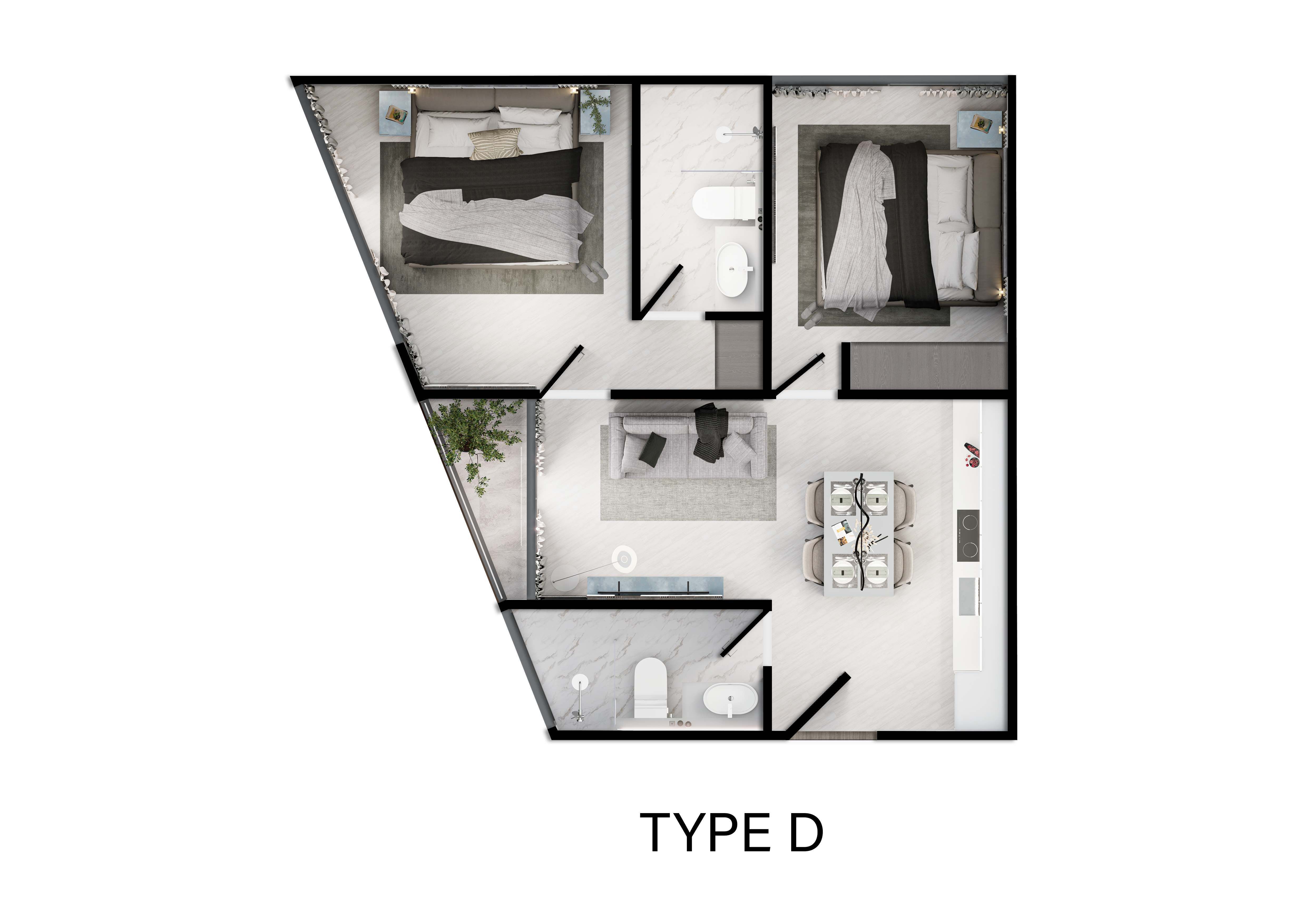 เป็นยูนิตที่ขายพร้อมกับการตกแต่งแบบบิ้วท์อิน ซึ่งก็คือการติดตั้งเฟอร์นิเจอร์แบบฝังติดไปกับผนัง ไม่สามารถเคลื่อนย้ายได้ ยกตัวอย่างเช่น ชั้นวางทีวี ในห้องรับแขก เคาท์เตอร์ครัว เฟอร์นิเจอร์แบบหล่อด้วยปูน รวมไปถึงแบบตอกติดไปกับพื้นหรือผนัง
