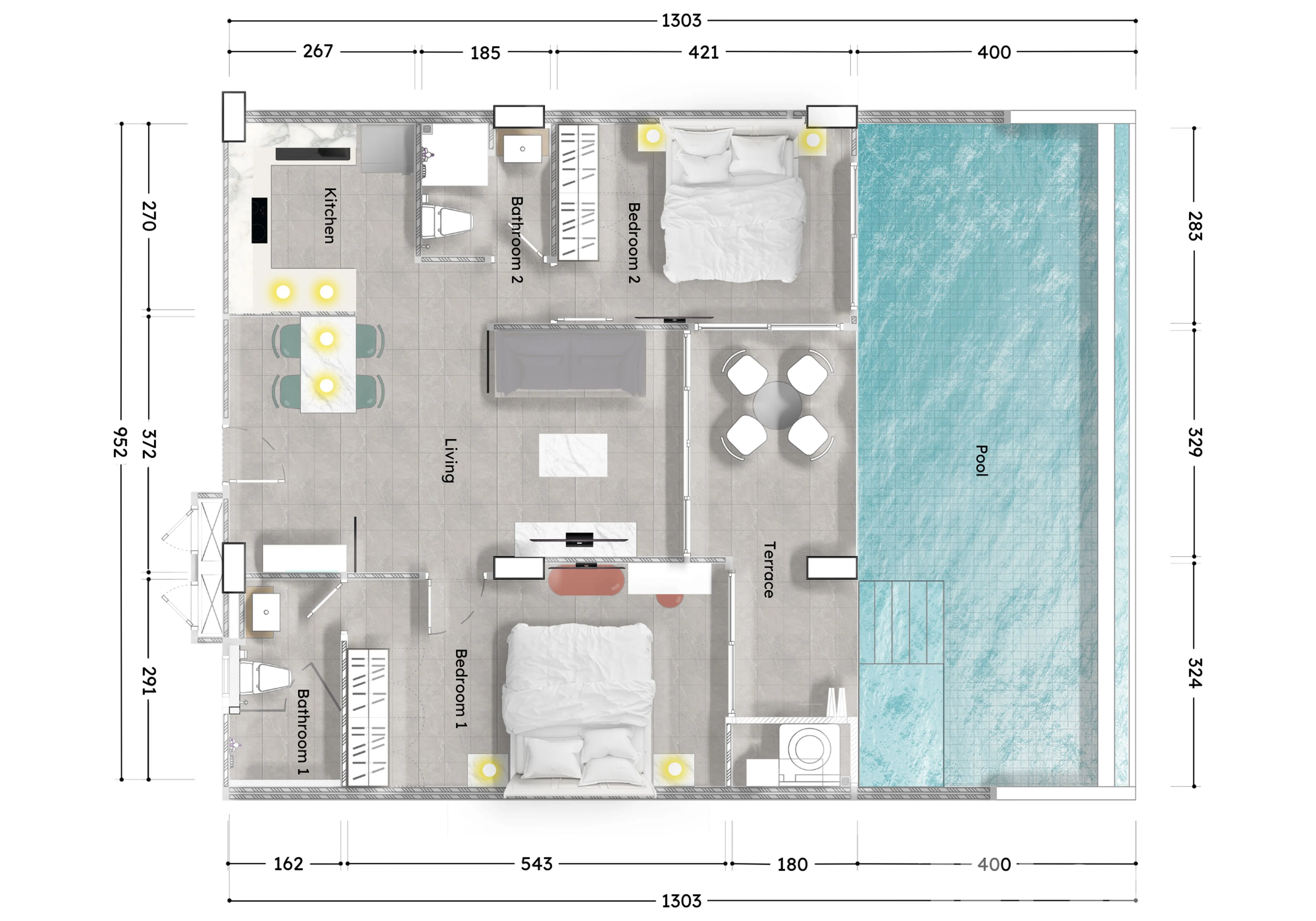 เป็นยูนิตที่ขายพร้อมกับเฟอร์นิเจอร์ครบชุด ที่เรียกได้ว่าเพียงแค่ยกกระเป๋าเสื้อผ้าเข้าไปก็สามารถอยู่อาศัยได้ทันที โดยมักจะมีเฟอร์นิเจอร์ตั้งแต่โซฟา ชั้นวางทีวี ในห้องรับแขก หรืออุปกรณ์เครื่องครัวทั้งหมด รวมไปถึงโต๊ะอาหาร ไล่เรียงไปยังเตียงนอนและตู้เสื้อผ้า ในห้องนอน (รายละเอียดปลีกย่อยอื่นๆ ขึ้นอยู่กับแต่ละยูนิต)
