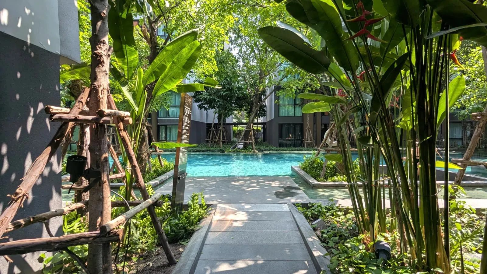 โครงการดีทำเลเยี่ยม สระว่ายน้ำสวยและร่มรื่นด้วยต้นไม้