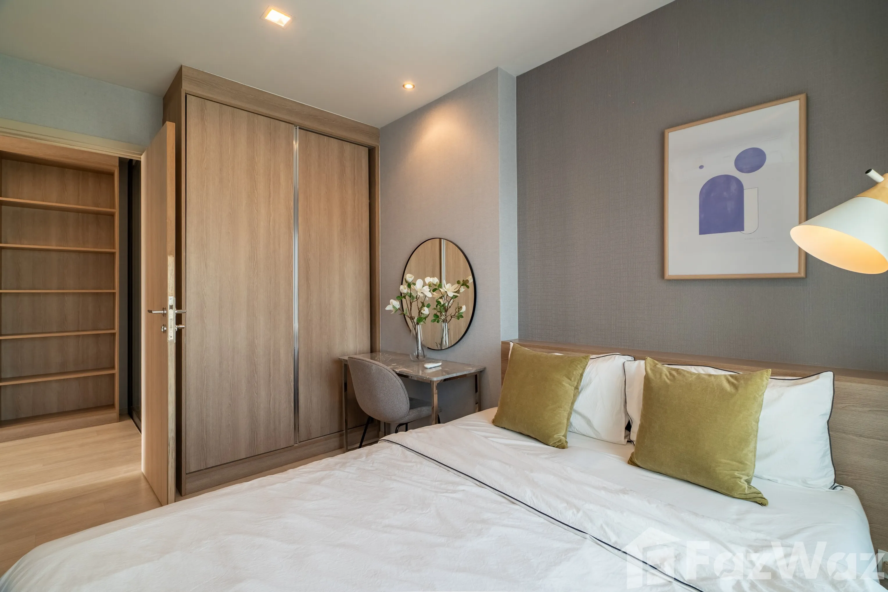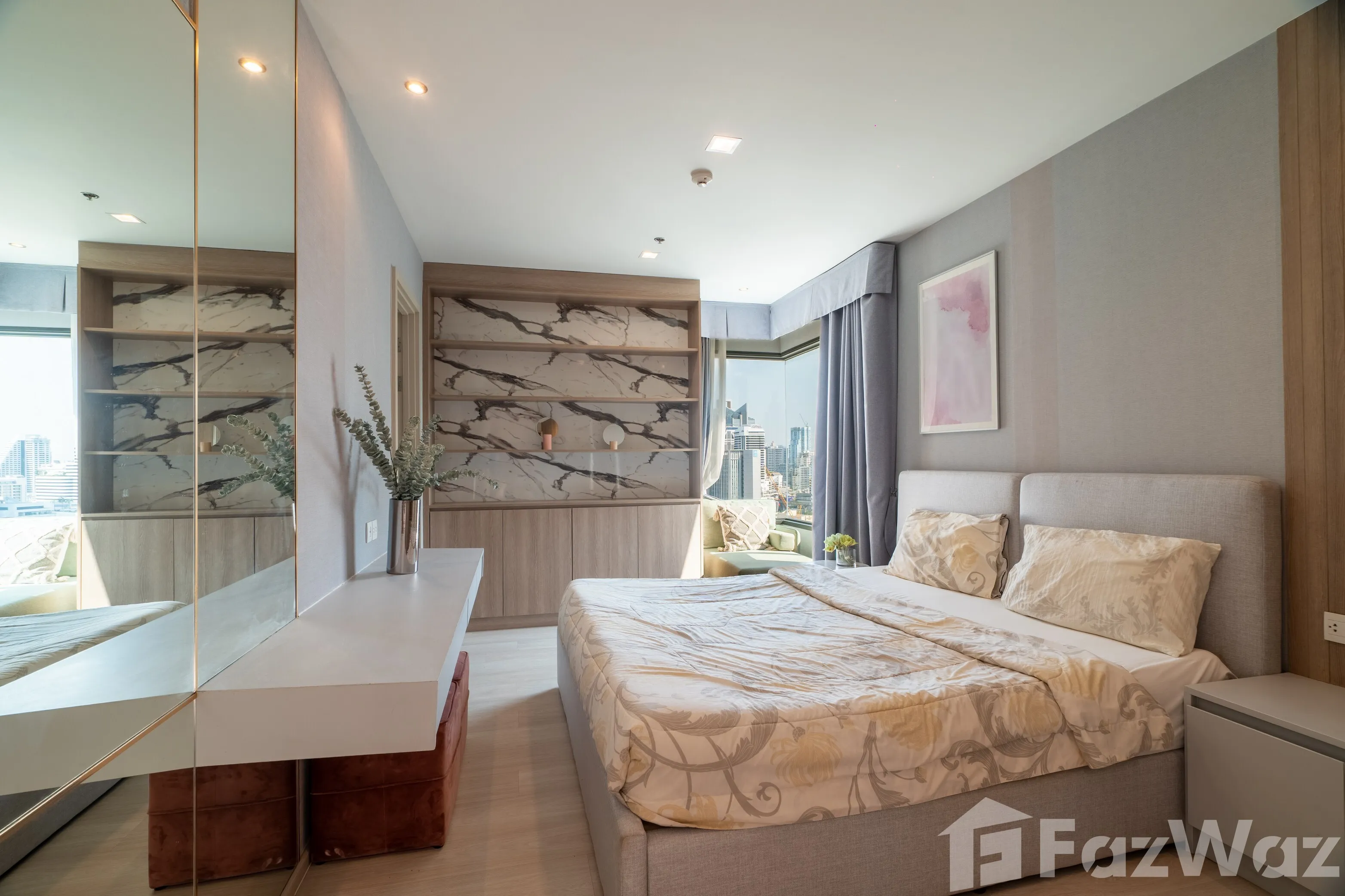 ห้องหันทิศ ตะวันตกเฉียงใต้ รับแสงธรรมชาติ ผังห้องเป็นระเบียบ ตกแต่ง เฟอร์นิเจอร์ครบ พร้อมเข้าอยู่