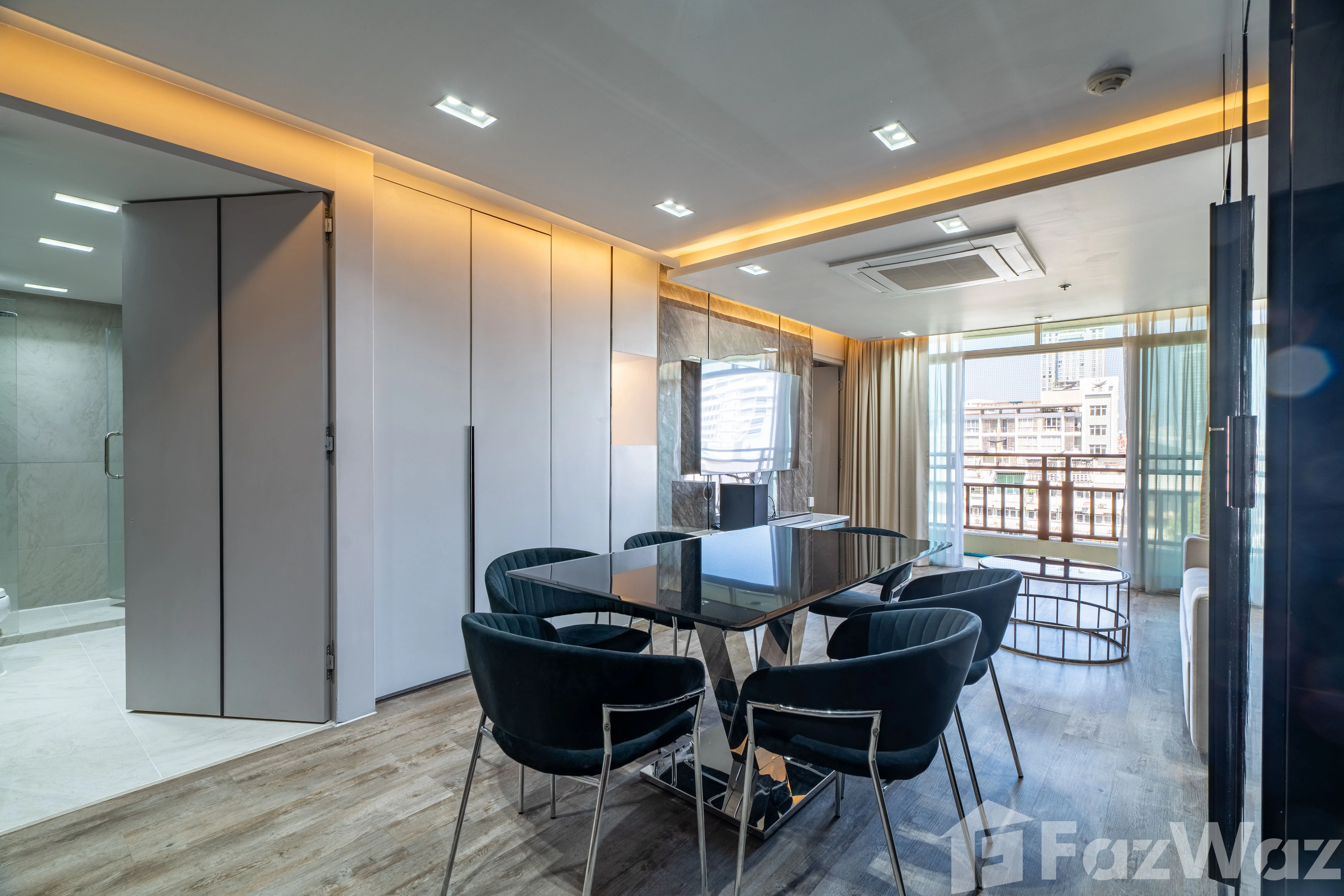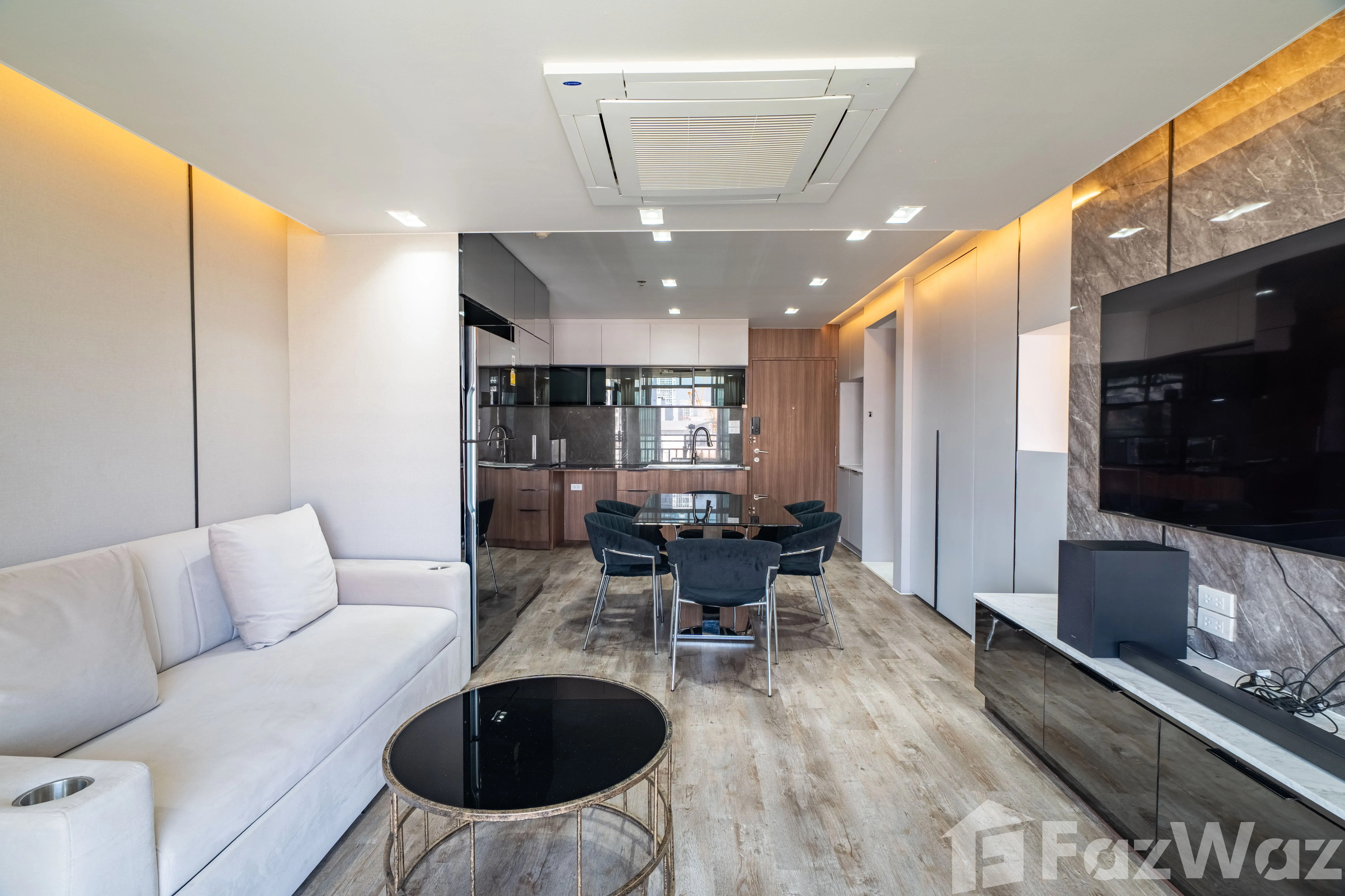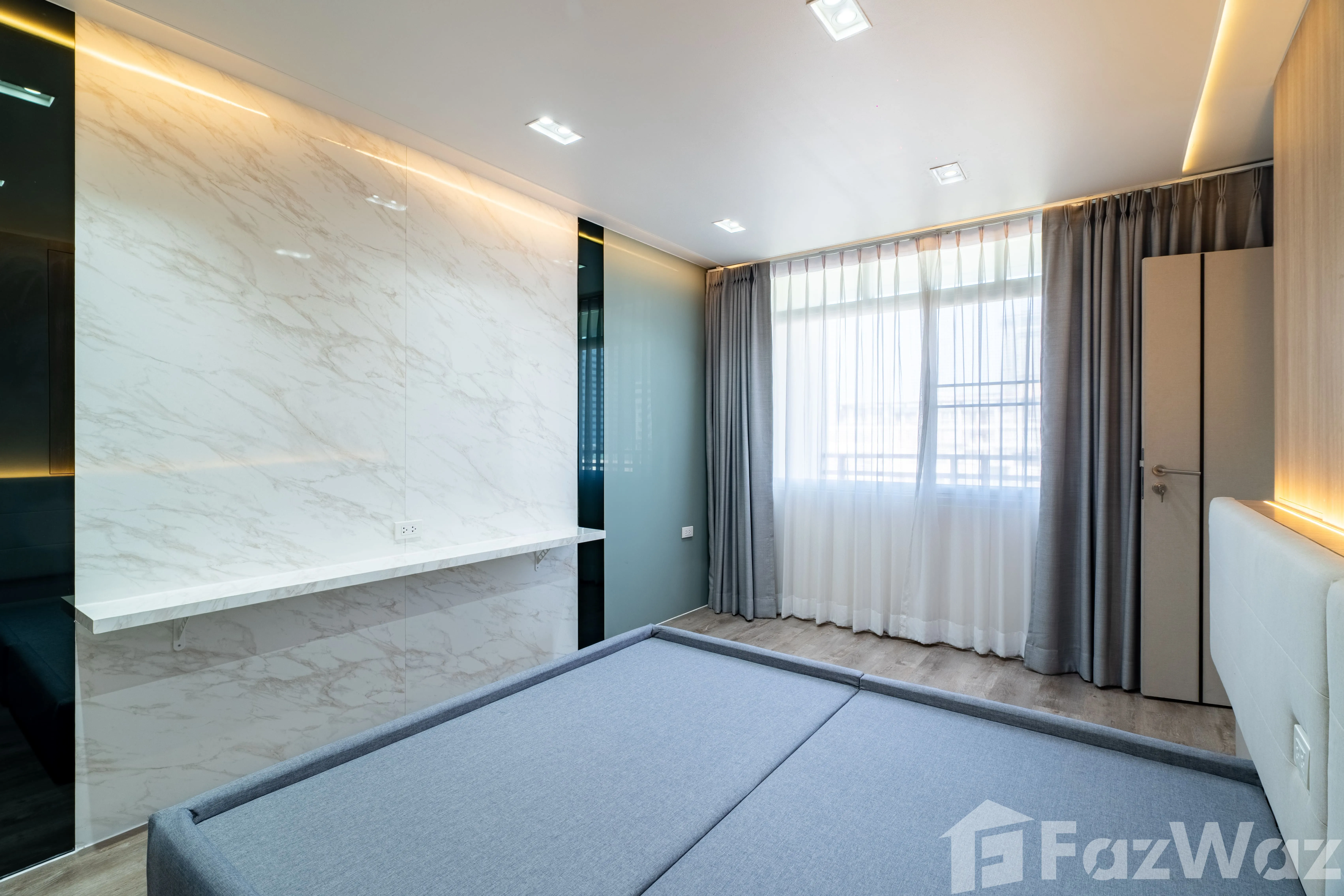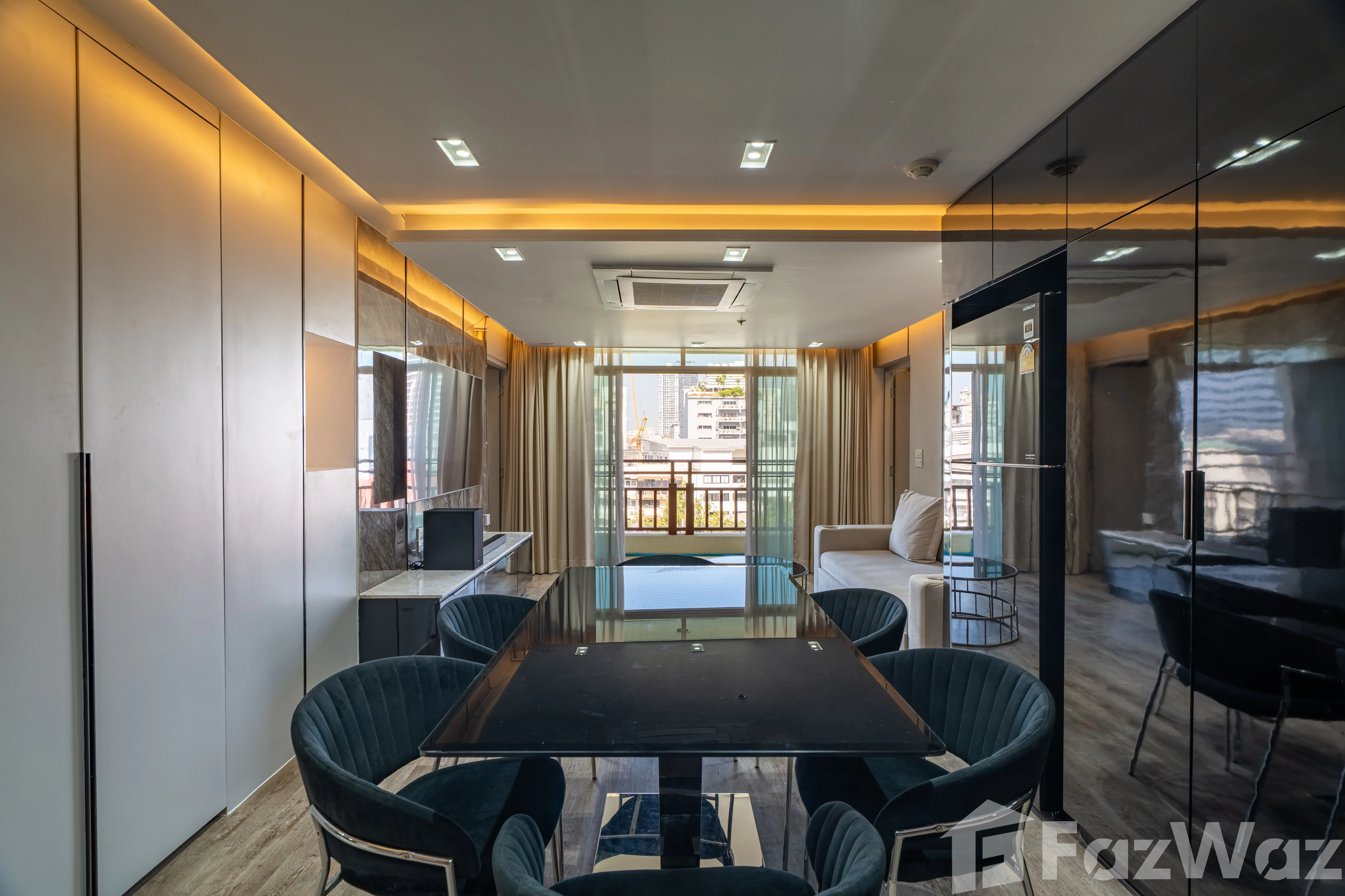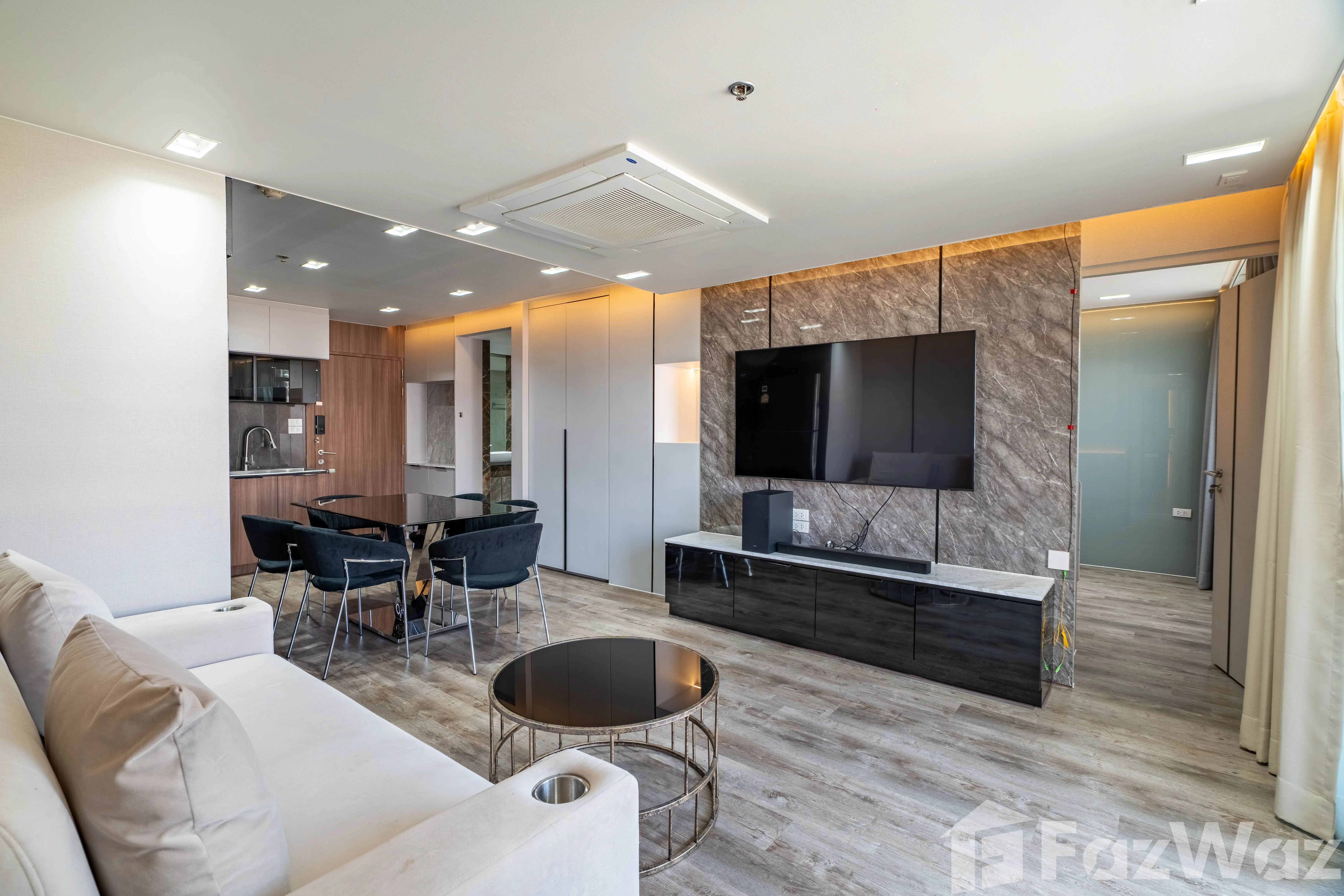 ห้องมาพร้อม วิวเมือง และการตกแต่งด้วย วัสดุหรูระดับพรีเมียม เช่น หินอ่อน (Marble) ผนังกระจกบานใหญ่ เพิ่มความโปร่งสบาย ติดตั้งระบบไฟอย่างลงตัว ทั้ง ไฟ Ambient ในห้องนอนและห้องนั่งเล่น, ไฟซ่อน (Recessed Lighting) และ ไฟใต้ตู้ครัว ช่วยสร้างบรรยากาศอบอุ่น ทันสมัย