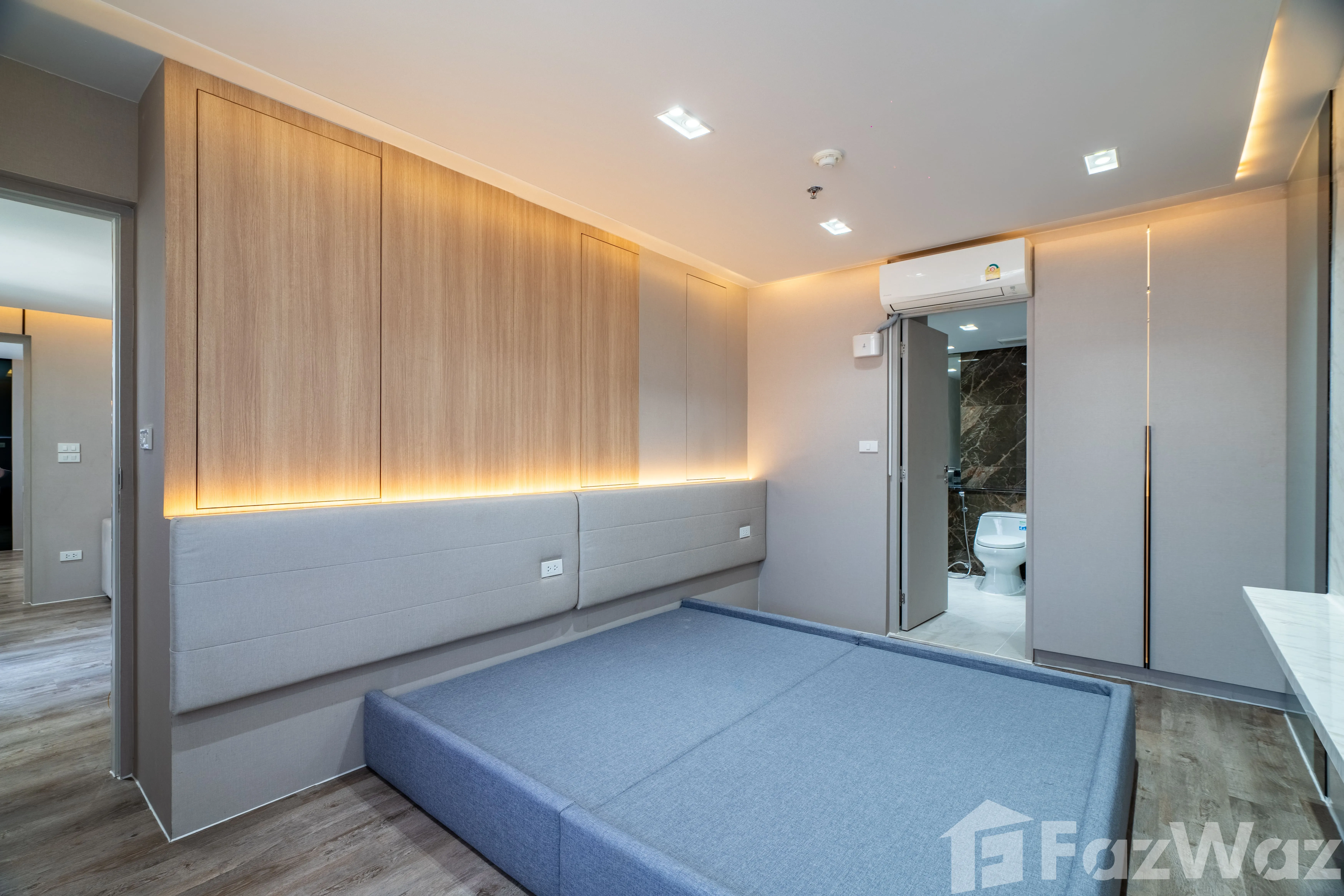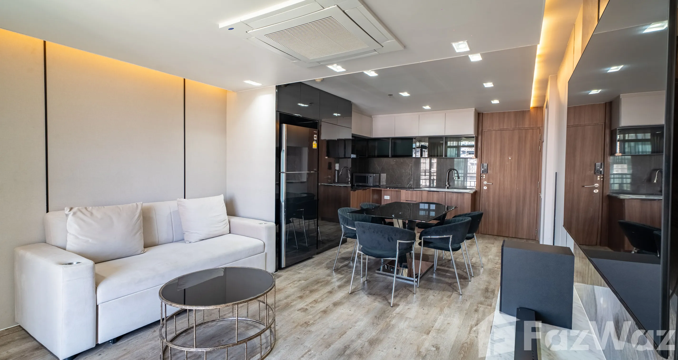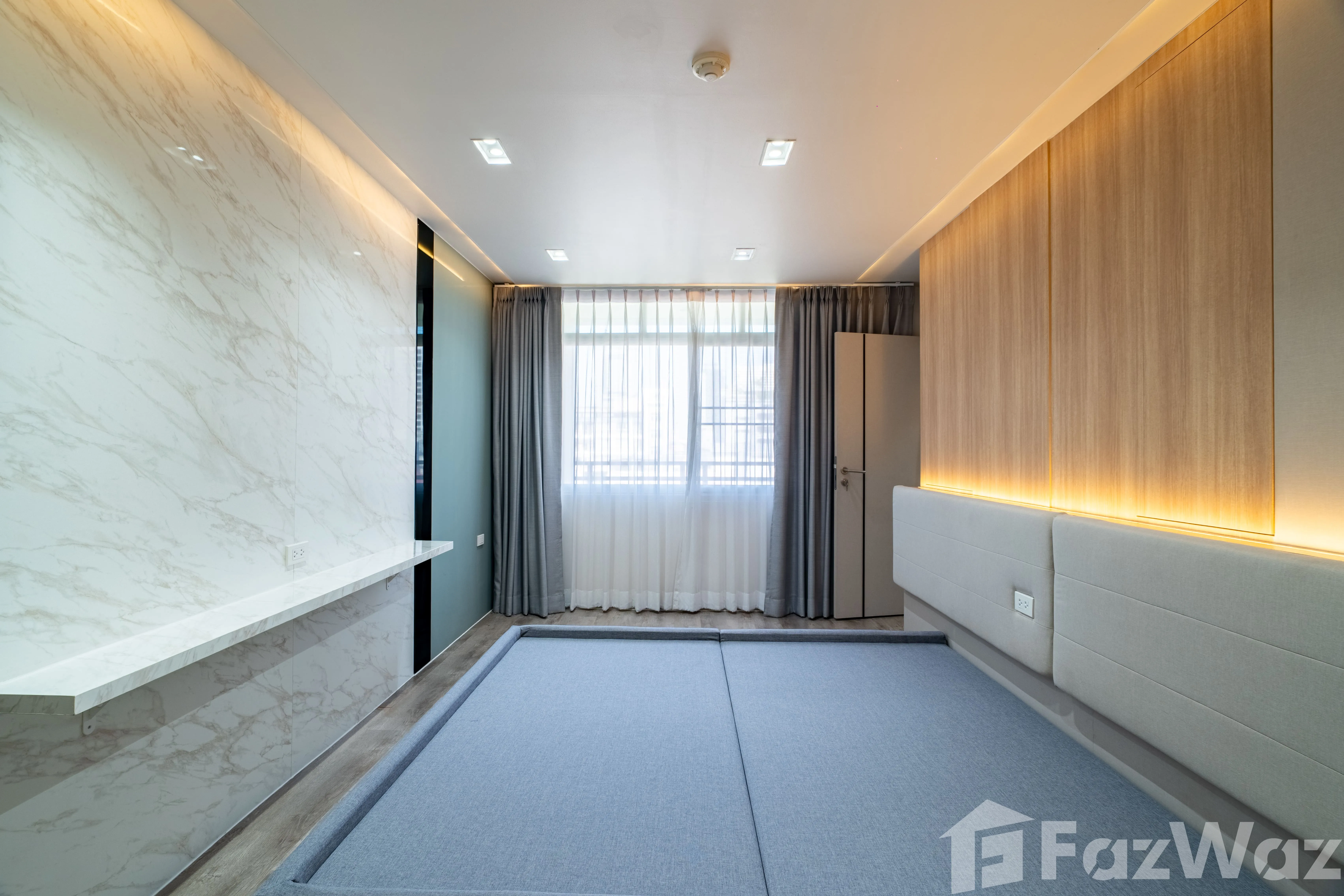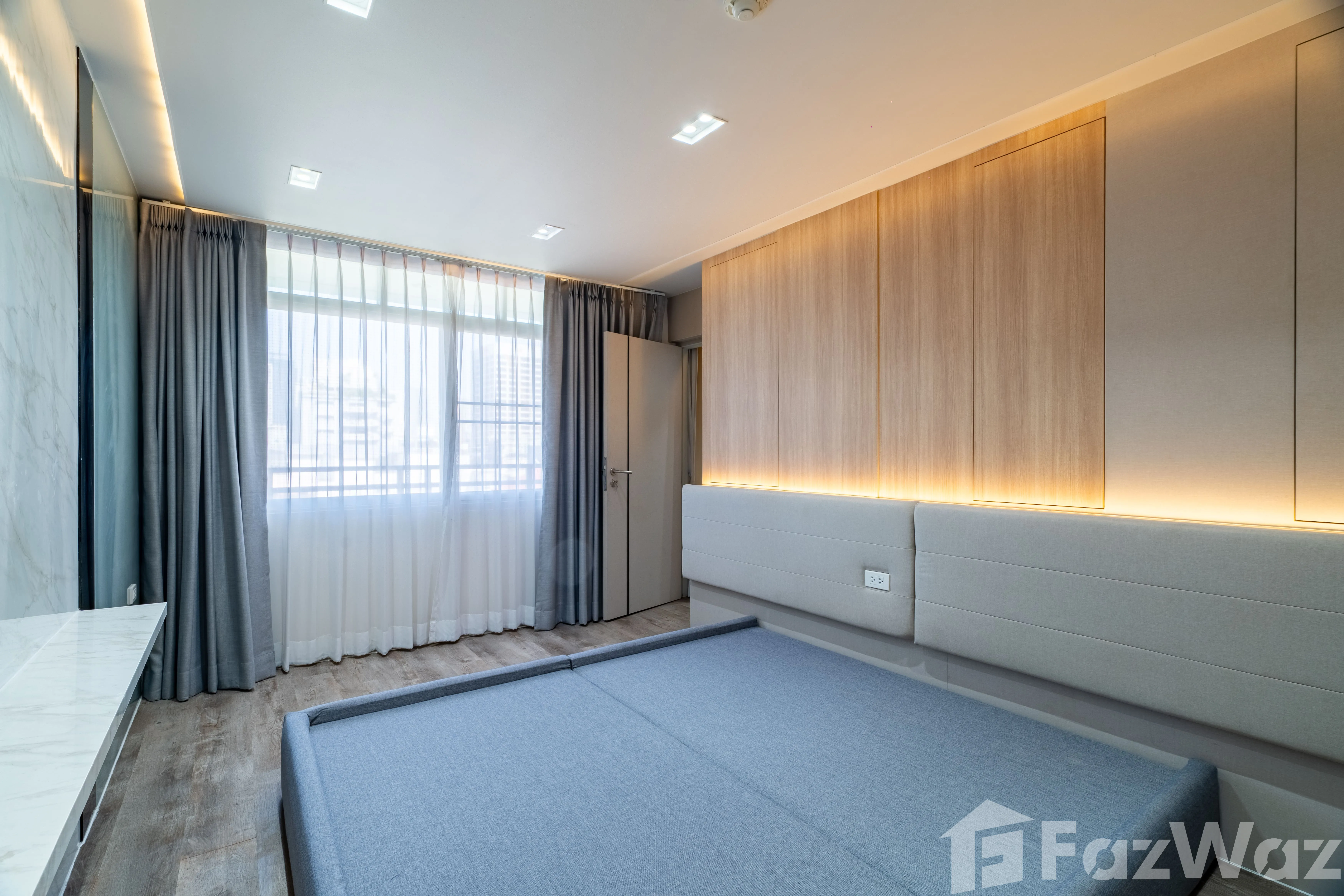 ห้องมาพร้อม วิวเมือง และการตกแต่งด้วย วัสดุหรูระดับพรีเมียม เช่น หินอ่อน (Marble) ผนังกระจกบานใหญ่ เพิ่มความโปร่งสบาย ติดตั้งระบบไฟอย่างลงตัว ทั้ง ไฟ Ambient ในห้องนอนและห้องนั่งเล่น, ไฟซ่อน (Recessed Lighting) และ ไฟใต้ตู้ครัว ช่วยสร้างบรรยากาศอบอุ่น ทันสมัย