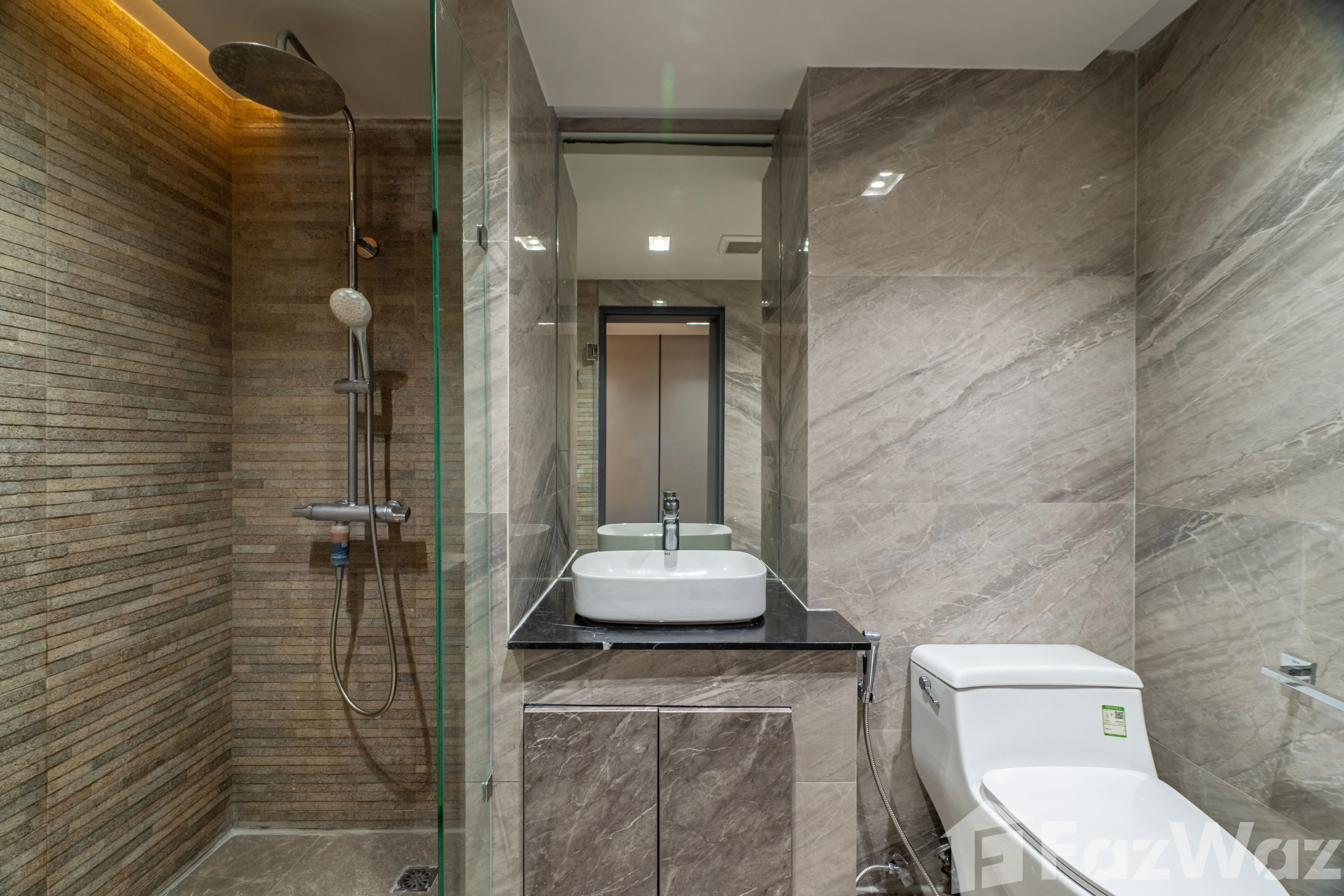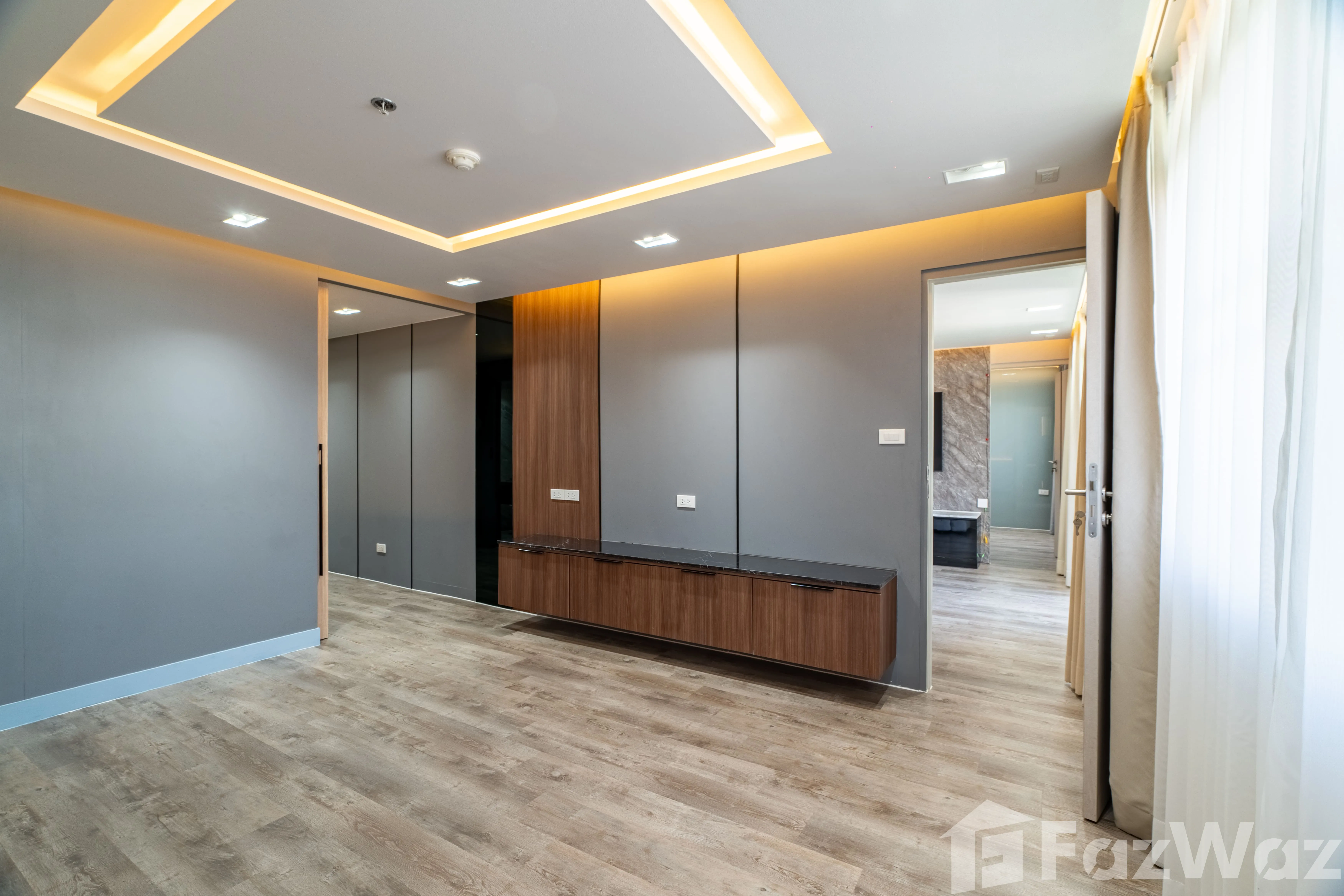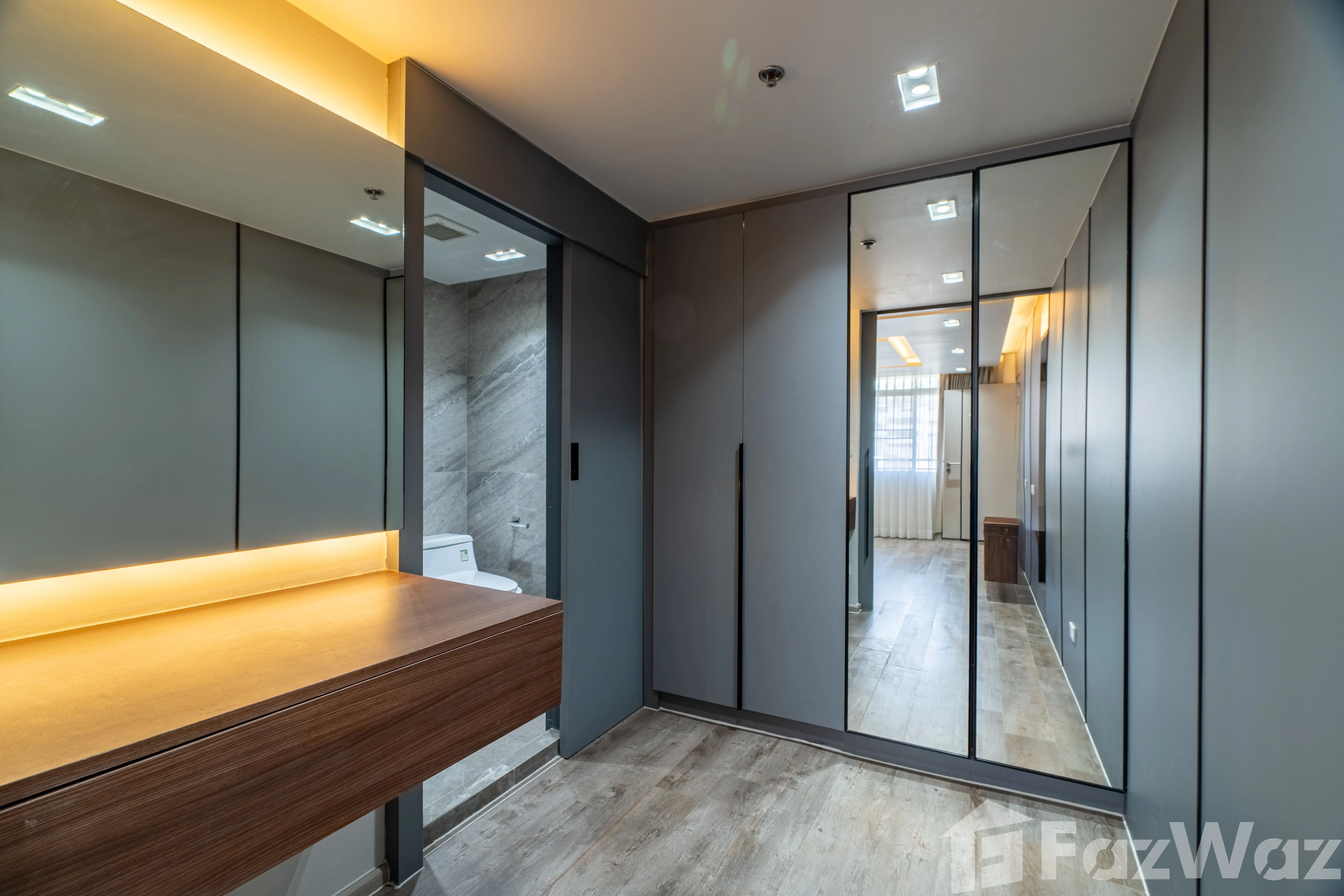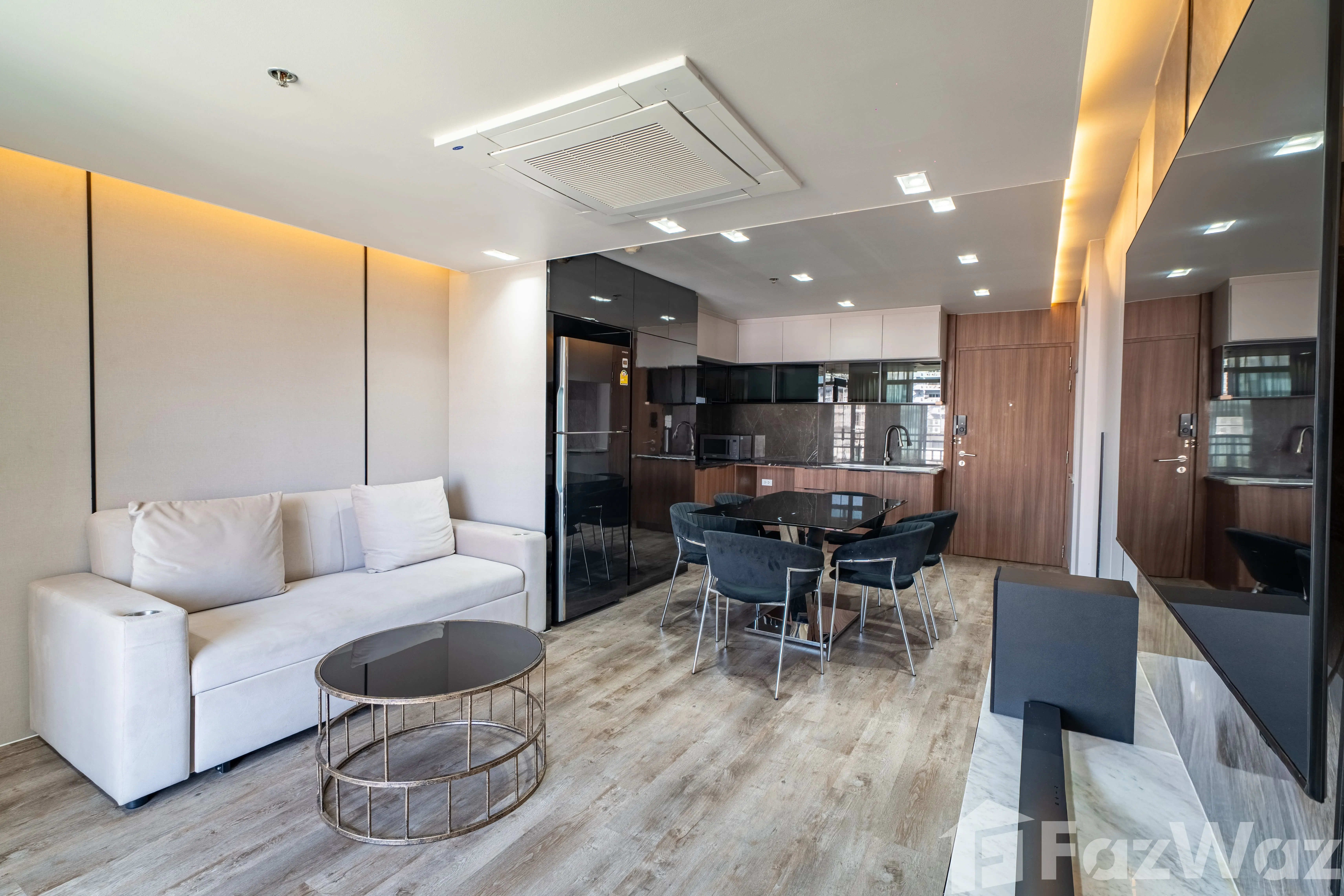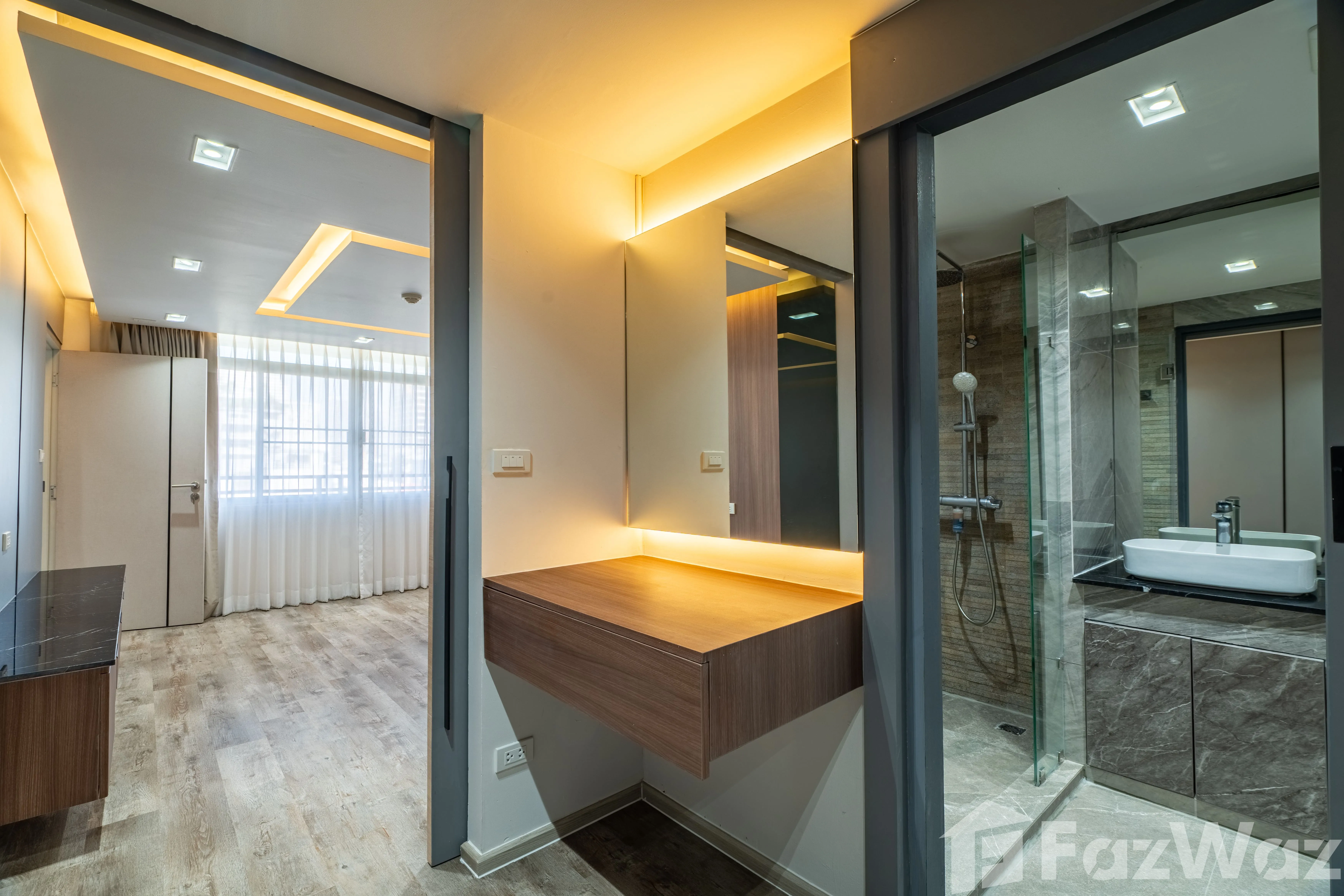 ห้องมาพร้อม วิวเมือง และการตกแต่งด้วย วัสดุหรูระดับพรีเมียม เช่น หินอ่อน (Marble) ผนังกระจกบานใหญ่ เพิ่มความโปร่งสบาย ติดตั้งระบบไฟอย่างลงตัว ทั้ง ไฟ Ambient ในห้องนอนและห้องนั่งเล่น, ไฟซ่อน (Recessed Lighting) และ ไฟใต้ตู้ครัว ช่วยสร้างบรรยากาศอบอุ่น ทันสมัย
