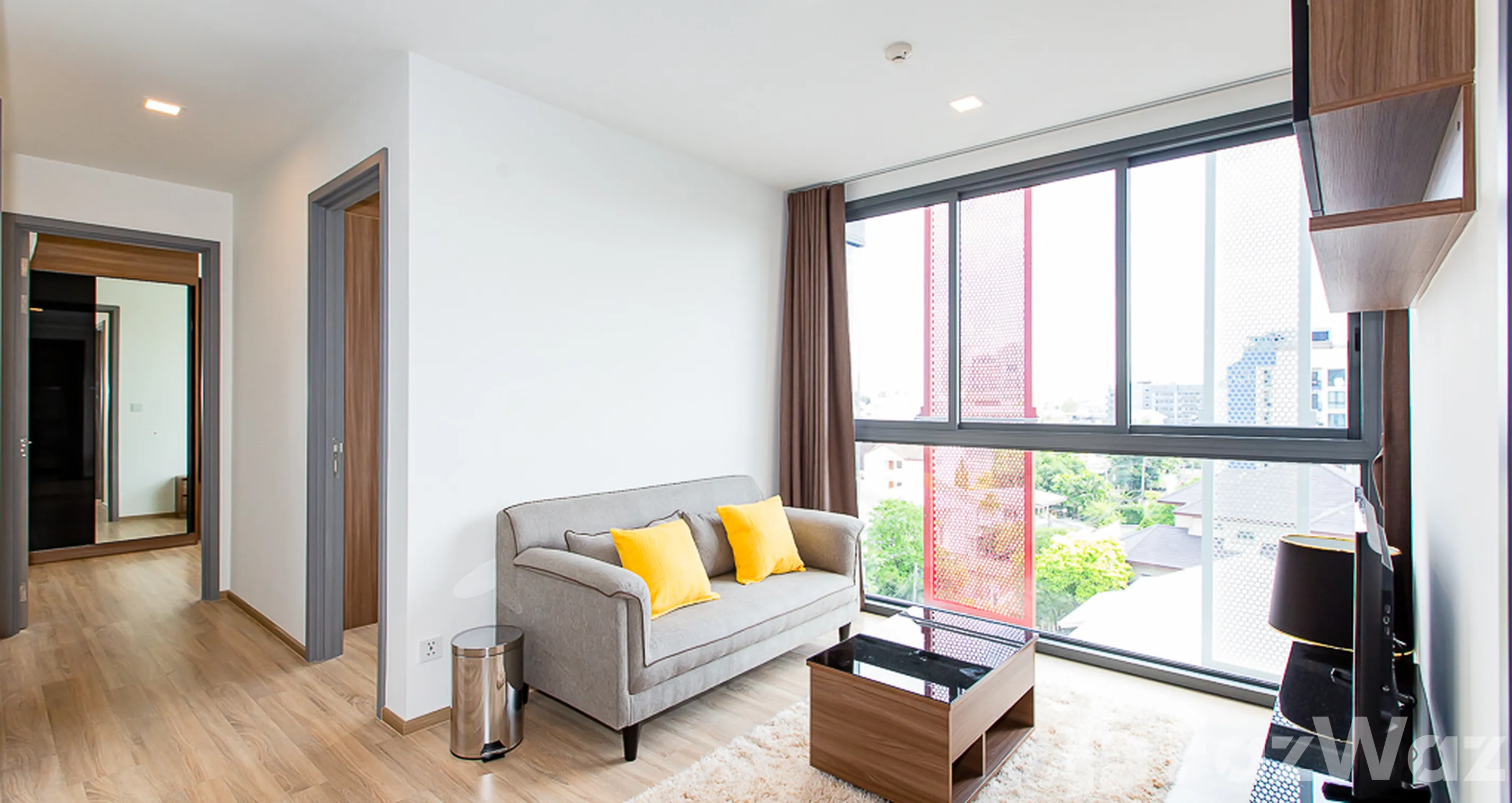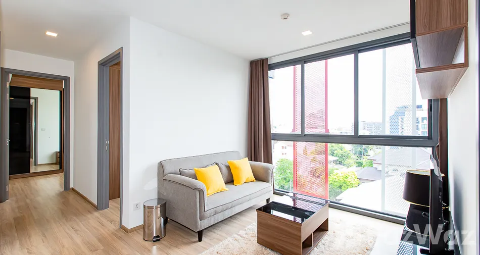 ภายในตกแต่งสไตล์โมเดิร์น โทนสีอบอุ่น ดูสะอาดตาและใช้งานได้จริง พื้นที่นั่งเล่นเชื่อมต่อระเบียงส่วนตัว เหมาะสำหรับการพักผ่อนในทุกช่วงเวลา พร้อมเฟอร์นิเจอร์และเครื่องใช้ไฟฟ้าครบครัน เช่น ทีวี ไมโครเวฟ และเครื่องซักผ้า รองรับทั้งการอยู่อาศัยทันทีหรือปล่อยเช่าลงทุน