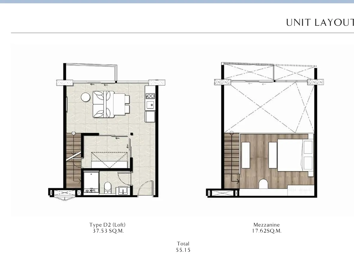 ยูนิตตั้งอยู่ที่ ชั้น 2 พื้นที่ใช้สอย 55.15 ตร.ม. แบ่งระดับเป็นสัดส่วน ทำให้พื้นที่ดูกว้างและใช้งานสะดวก