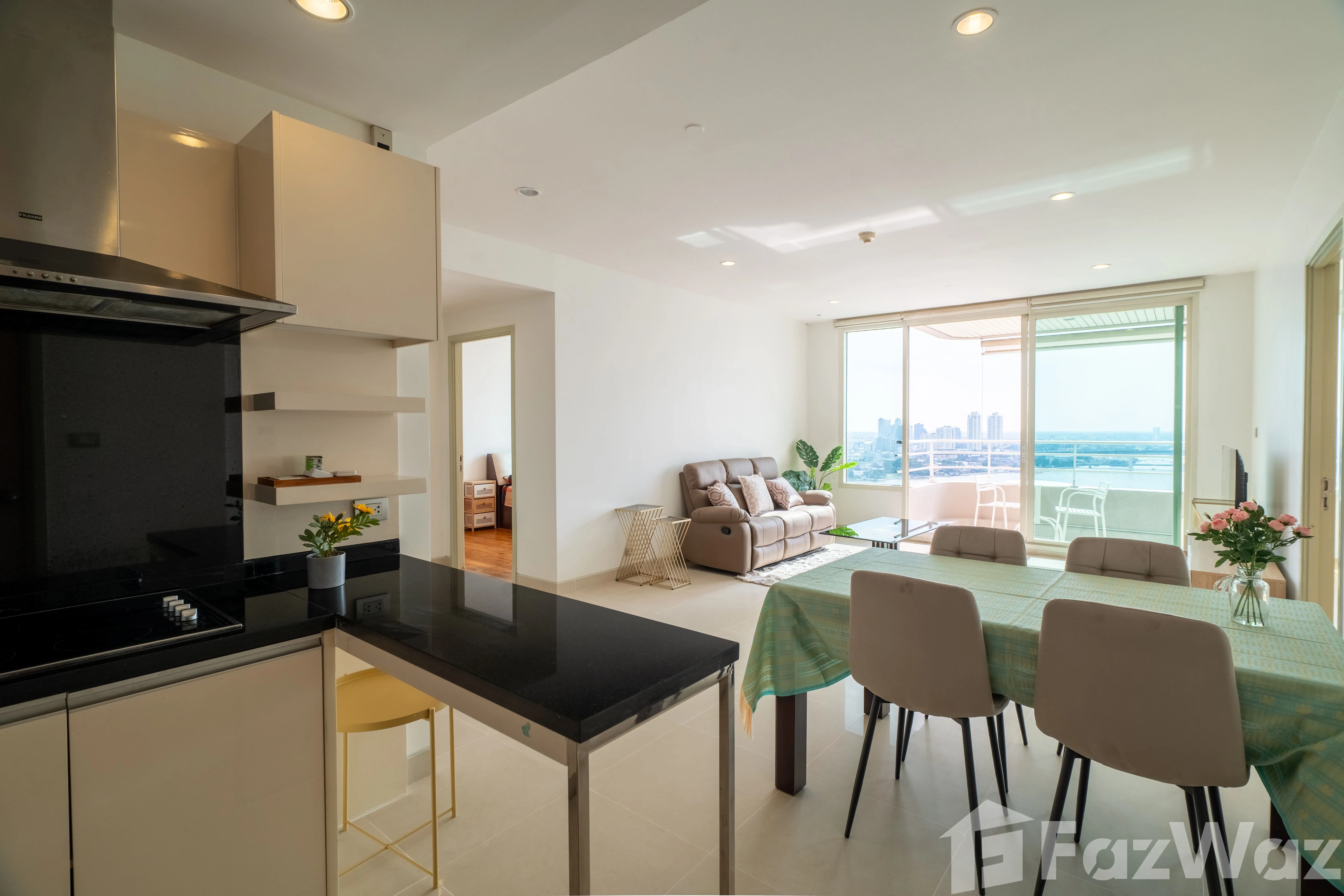 ภายในออกแบบ โปร่ง โล่ง รับแสงธรรมชาติอย่างดี พร้อมหน้าต่างบานใหญ่ที่มองเห็น วิวแม่น้ำ–วิวคลอง, วิวเมือง, และ วิวเปิดโล่งแบบพาโนรามา