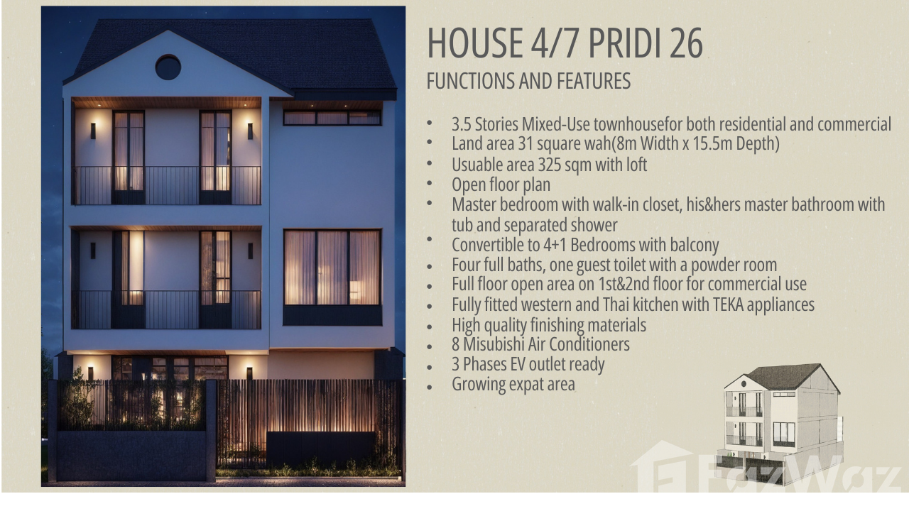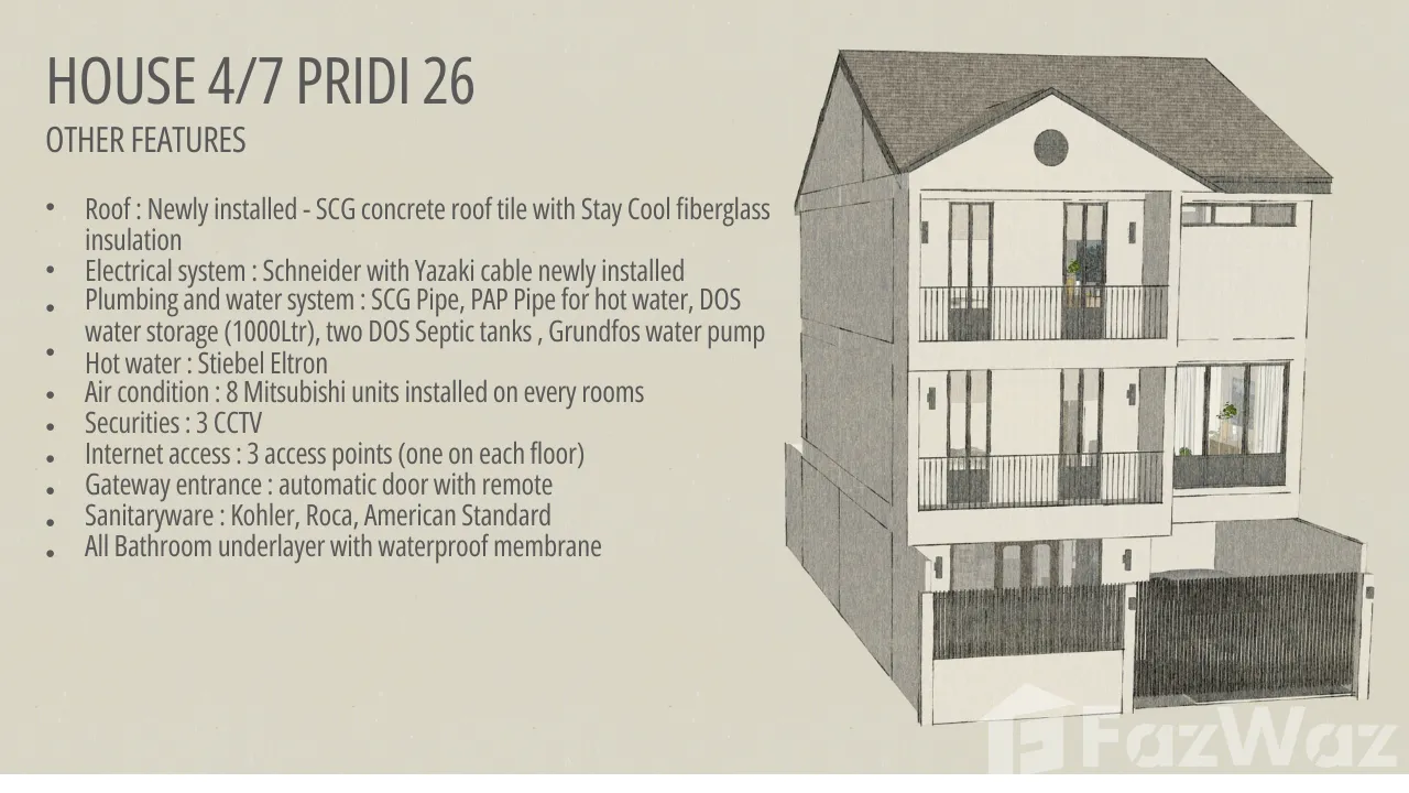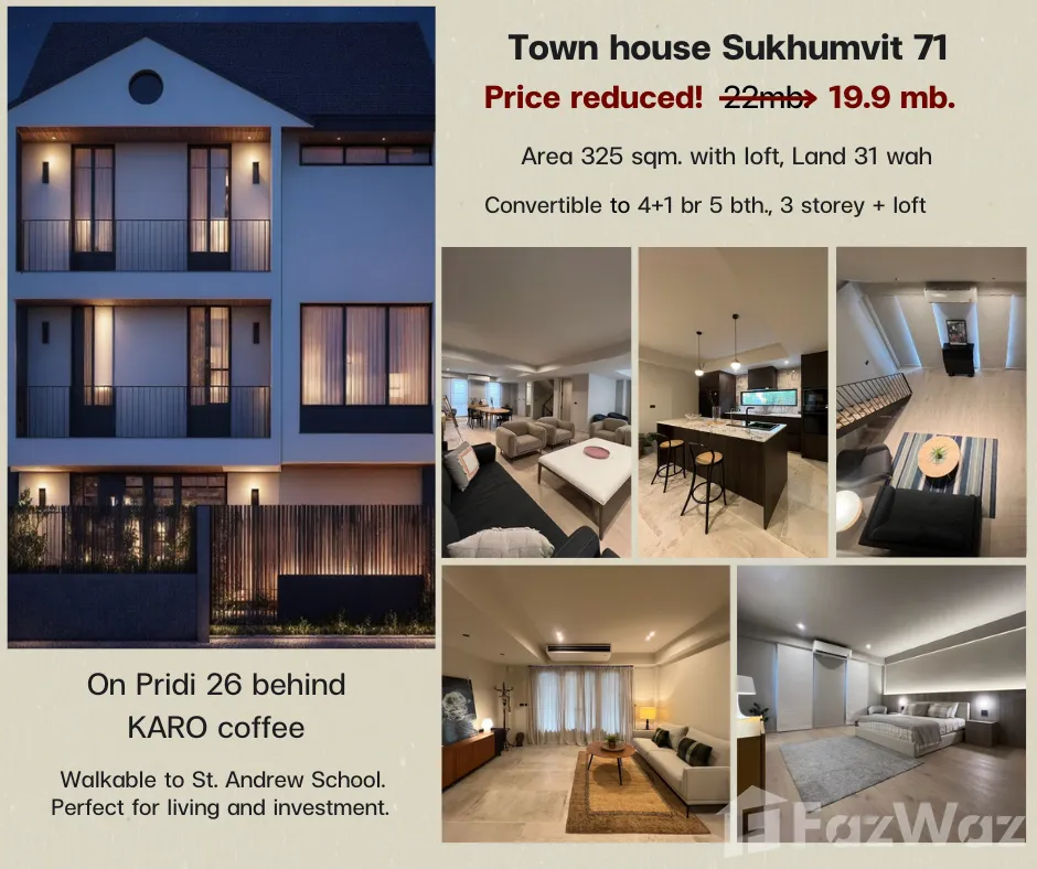 ขายทาวน์เฮ้าส์ใหม่ ปรีดี26 สุขุมวิท71 BTS พระโขนง ทาวน์เฮ้าส์หลังมุม พื้นที่ 325 ตรม. ที่ดิน 31 ตรว. 3.5 ชั้น เป็นที่พักอาศัยได้ เป็นเชิงพาณิชย์ได้ ทำเลดีมาก สามารถทำได้ 4+1 ห้องนอน 5 ห้องน้ำ แอร์มิตซูทั้งหมด ไฟ3เฟสสำหรับรถไฟฟ้า, จุดกระจายสัญญาอินเตอร์เน็ตทุกชั้น มีครัวฝรั่ง และครัวไทย ใช้วัสดุคุณภาพดีมาก งานช่างฝีมือปราณีต บ้านดีหายาก ใกล้คาเฟ่ KARO เดินถึงถนนใหญ่  ใกล้ รร.นานาชาติ เซ้นแอนดรูส์ และบางกอกเพรพ  ขาย 22 ล้านบาท Townhouse for Sale, Pridi26 Sukhumvit 71 BTS Phakanong Semi-detached house, area 325 sqm., land 31 wah, 3.5 storey Newly renovated for residential or commercial, Convenient location  Convertible to 4+1 bedrooms, 5 bathrooms with Mitsubishi A/C European kitchen and Thai kitchen, High quality finishing materials. 3 phases EV outlet ready, internet 3 access points (one on each floor) Automatic door with remote. Walkable to St.Andrew international school. Worthwhile property at a reasonable price. For Sale 22 MB.