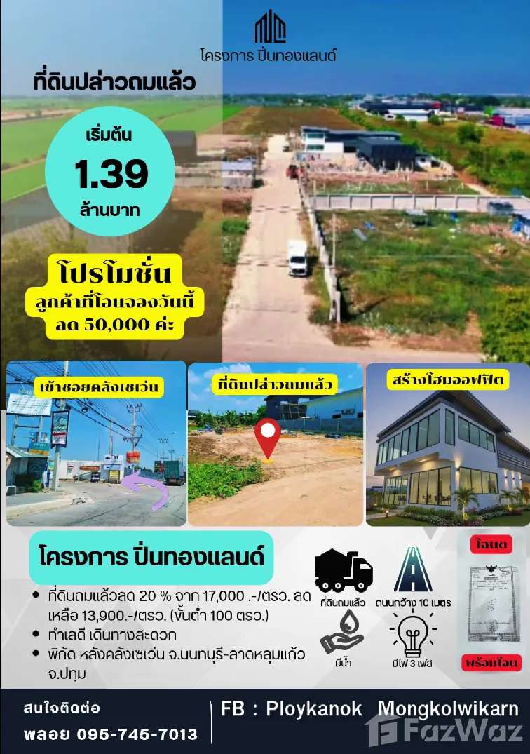 #ขายที่ดิน #ทำโกดัง #โรงงาน #ออฟฟิศ #ที่ดินโปรโมชั่นราคาพิเศษลด  20% ราคาปกติตรว.ละ 17,000 บาท 💖เหลือตรว.ละ 13,900 บาท💖 ✨ขั้นต่ำที่ดินปล่าวถมแล้ว 100 ตรว. =1,390,000 บาท ✨ที่ดินปล่าวถมแล้ว 200 ตรว.=2,780,000 บาท ✨ที่ดินปล่าวถมแล้ว 1 ไร่ =5,560,000 บาท 😍😍สำหรับลูกค้าที่จ่ายสดเรามีส่วนลดพิเศษให้ด้วยจ้า😍😍 พิกัด บางบัวทอง จ.นนทบุรี-ลาดหลุมแก้ว จ.ปทุมธานี 💥ขอ รง.4 ได้ 💥ขอ อ.ย. ได้ 💦ถนนสาธารณประโยชน์ - ท่อระบายน้ำ น้ำประปา, ไฟฟ้า 3 เฟส ทุกอย่างจัดให้ ถนนในโครงการกว้าง 10 เมตร สนใจติดต่อสอบถามพลอย โทร 095-745-7013