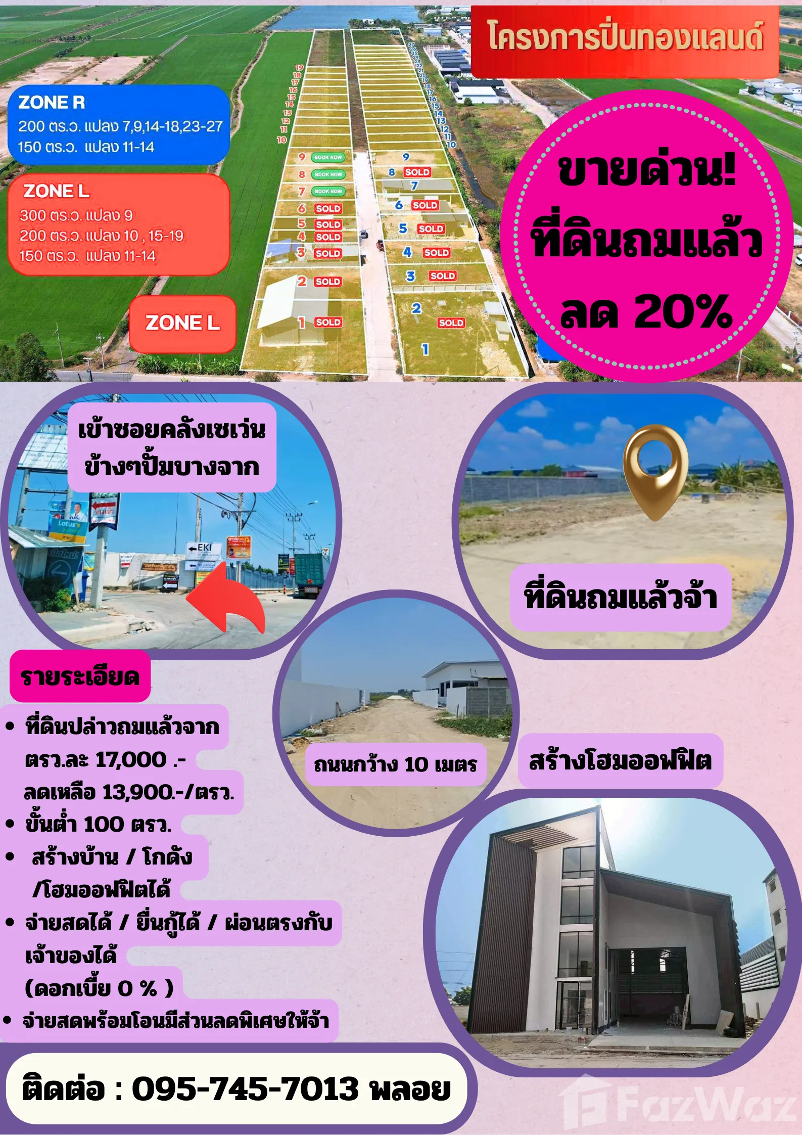 #ขายที่ดิน #ทำโกดัง #โรงงาน #ออฟฟิศ #ที่ดินโปรโมชั่นราคาพิเศษลด 20% ราคาปกติตรว.ละ 17,000 บาท ที่ดินปล่าวถมแล้ว 200 ตรว.=2,780,000 บาท ขอ รง.4 ได้ ถนนสาธารณประโยชน์ - ท่อระบายน้ำ น้ำประปา, ไฟฟ้า 3 เฟส ทุกอย่างจัดให้ ถนนในโครงการกว้าง 10 เมตร สนใจติดต่อสอบถามพลอย โทร 095-745-7013