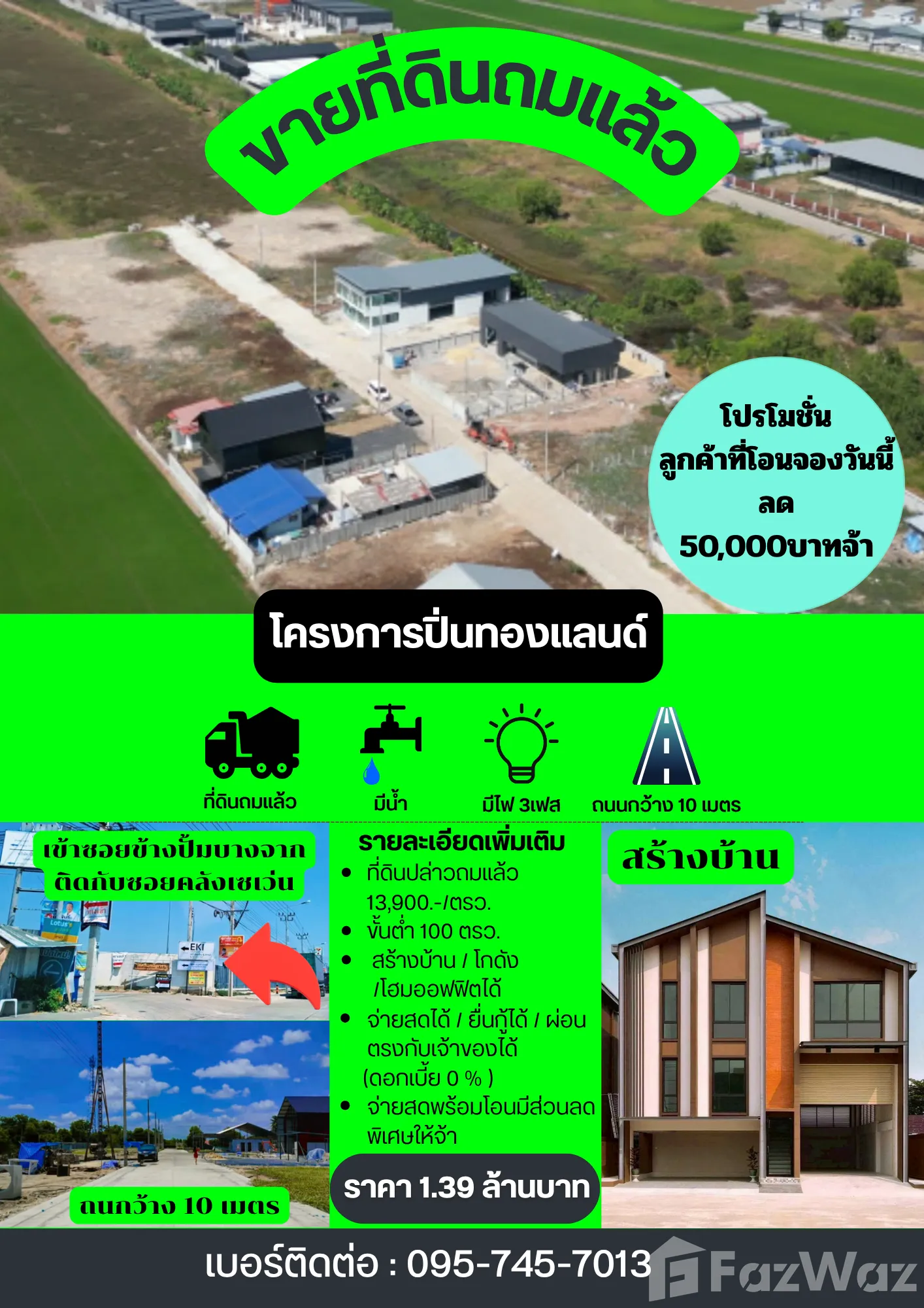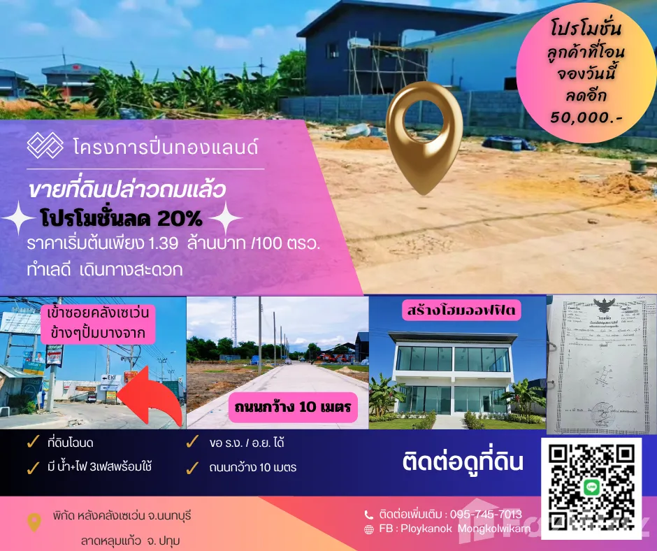 #ขายที่ดิน #ทำโกดัง #โรงงาน #ออฟฟิศ #ที่ดินโปรโมชั่นราคาพิเศษลด  20% ราคาปกติตรว.ละ 17,000 บาท 💖เหลือตรว.ละ 13,900 บาท💖 ✨ขั้นต่ำที่ดินปล่าวถมแล้ว 100 ตรว. =1,390,000 บาท ✨ที่ดินปล่าวถมแล้ว 200 ตรว.=2,780,000 บาท ✨ที่ดินปล่าวถมแล้ว 1 ไร่ =5,560,000 บาท 😍😍สำหรับลูกค้าที่จ่ายสดเรามีส่วนลดพิเศษให้ด้วยจ้า😍😍 พิกัด บางบัวทอง จ.นนทบุรี-ลาดหลุมแก้ว จ.ปทุมธานี 💥ขอ รง.4 ได้ 💥ขอ อ.ย. ได้ 💦ถนนสาธารณประโยชน์ - ท่อระบายน้ำ น้ำประปา, ไฟฟ้า 3 เฟส ทุกอย่างจัดให้ ถนนในโครงการกว้าง 10 เมตร สนใจติดต่อสอบถามพลอย โทร 095-745-7013