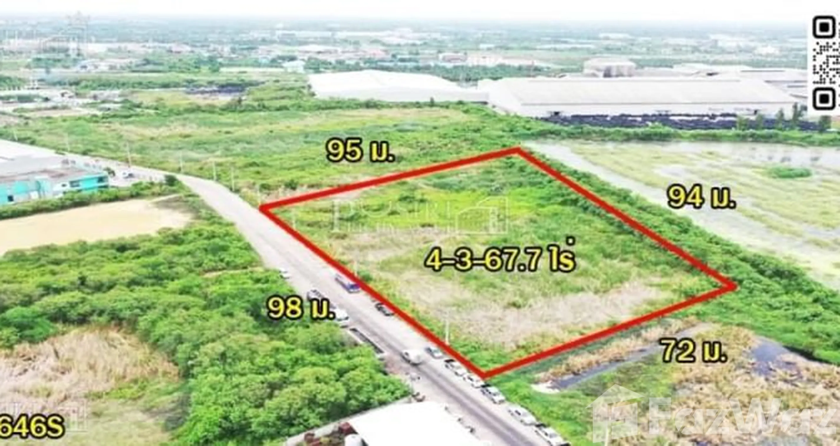 ที่ดิน ขนาด 4-3-67.7 ไร่ หน้ากว้าง 98 เมตร โดดเด่นเป็นสง่า วางแปลนสร้างโรงงาน/โกดังได้ง่าย ด้านหน้าติดถนนคอนกรีต กว้าง 12 เมตร รถเล็ก ใหญ่ เข้า-ออกได้สะดวก