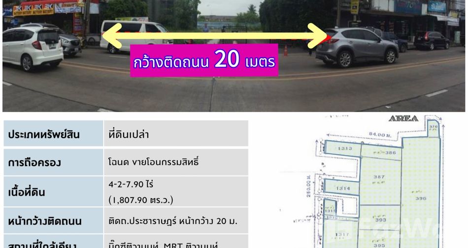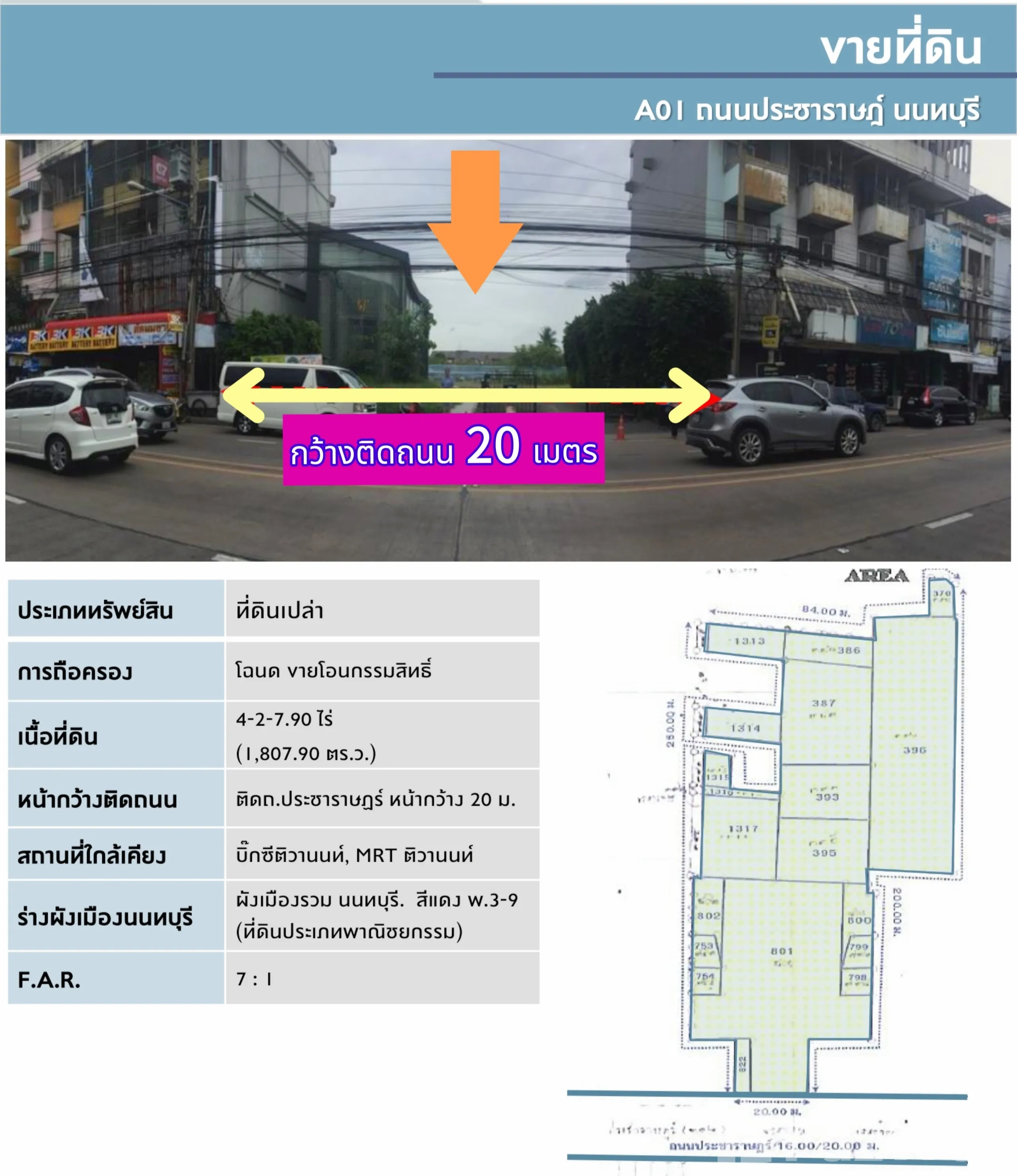 ขายที่ดินจังหวัดนนทบุรีติดถนนประชาราษฎร์ พื้นที่ 4-2-7.9ไร่ ขายยกแปลง374,000,000บาท ตร.วาละ206.870บาท ติดถนนประชาราษฎร์หน้ากว้าง 20 เมตร ขายสถานที่ใกล้เคียงบิ๊กซีติวานนท์ MRT ติวานนท์ ผังเมืองรวมนนทบุรีสีแดงพ.3-9 (ที่ดินประเภทพาณิชยกรรม) ติดต่อ 081-242-4284 ธนะชัย
