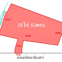 ที่ดินติดถ.รัตนาธิเบศร์ อยู่ระหว่างแยกบางพลูกับถ.ราชพฤกษ์ หันหน้าไปทางทิศใต้ ฝั่งขาเข้า ห่างรถไฟฟ้า BTS สถานีบางพลู 600 เมตร และ ห่างสถานีบางรักใหญ่ 700 เมตร หน้ากว้างติดถนน 35 เมตร จากถ.รัตนาธิเบศร์เข้ามาช่วงคอขวด 65 เมตร ภายในที่ดินกว้าง 280 เมตร ด้านซ้ายลึก 155 เมตร ติดคลองบางพลู ด้านขวาลึก 100 เมตร ติดคลองบางมะขาม พื้นที่สีเหลือง สามารถสร้างตึกสูงได้ เหมาะสำหรับสร้างหมู่บ้าน คอนโด ...ฯลฯ   สถานที่ตั้ง ถ.รัตนาธิเบศร์ ต.บางรักใหญ่ อ.บางบัวทอง นนทบุรี 11110   ข้อมูลการเดินทาง จากถ.งามวงศ์วาน มุ่งหน้าถ.รัตนาธิเบศร์ ข้ามสะพานพระนั่งเกล้า ตรงไป ก่อนถึงแยกบางพลู 500 เมตร ที่ดินอยู่ฝั่งตรงข้าม โดยกลับรถใต้สะพานแยกบางพลู   สถานที่ใกล้เคียง สถานีรถไฟฟ้าบางพลู สถานีรถไฟฟ้าบางรักใหญ่ วัดบางไผ่ โรงเรียนชุมชนวัดบางไผ่ วัดโมลี โรงเรียนวัดบางรักใหญ่ วัดบางรักใหญ่ วัดบางแพรก โรงเรียนป่าไม้อุทิศ9 วัดไผ่เหลือง วัดสวนแก้ว โรงเรียนอนุบาลวรทัย   เนื้อที่ 25 ไร่ 53 ตรว.   ตารางวาละ 140,000 บาท (ผู้ขายออกค่าใช้จ่ายในการโอนทั้งหมด) รวม 1,407,420,000 บาท   ดูรายละเอียดเพิ่มเติมได้ที่...