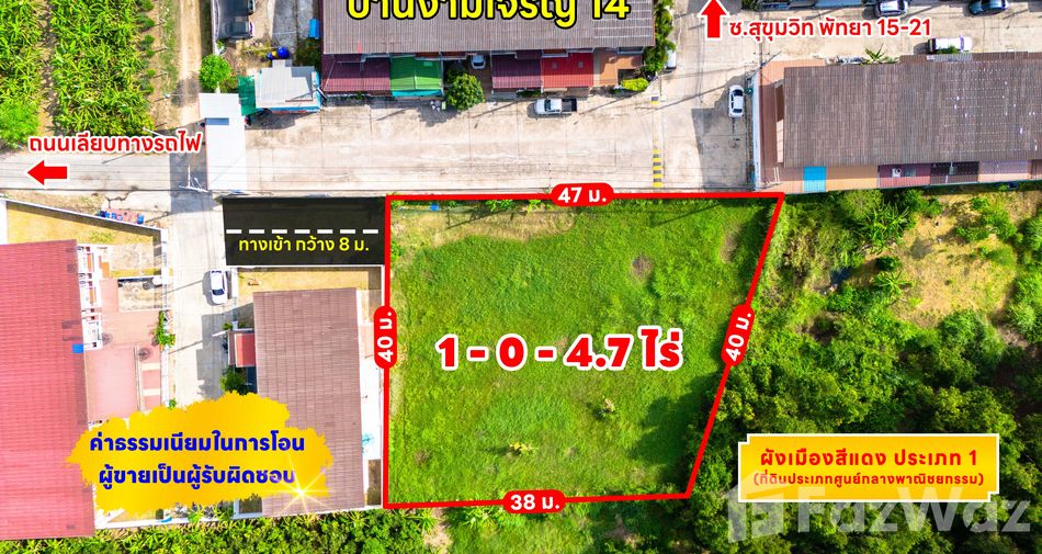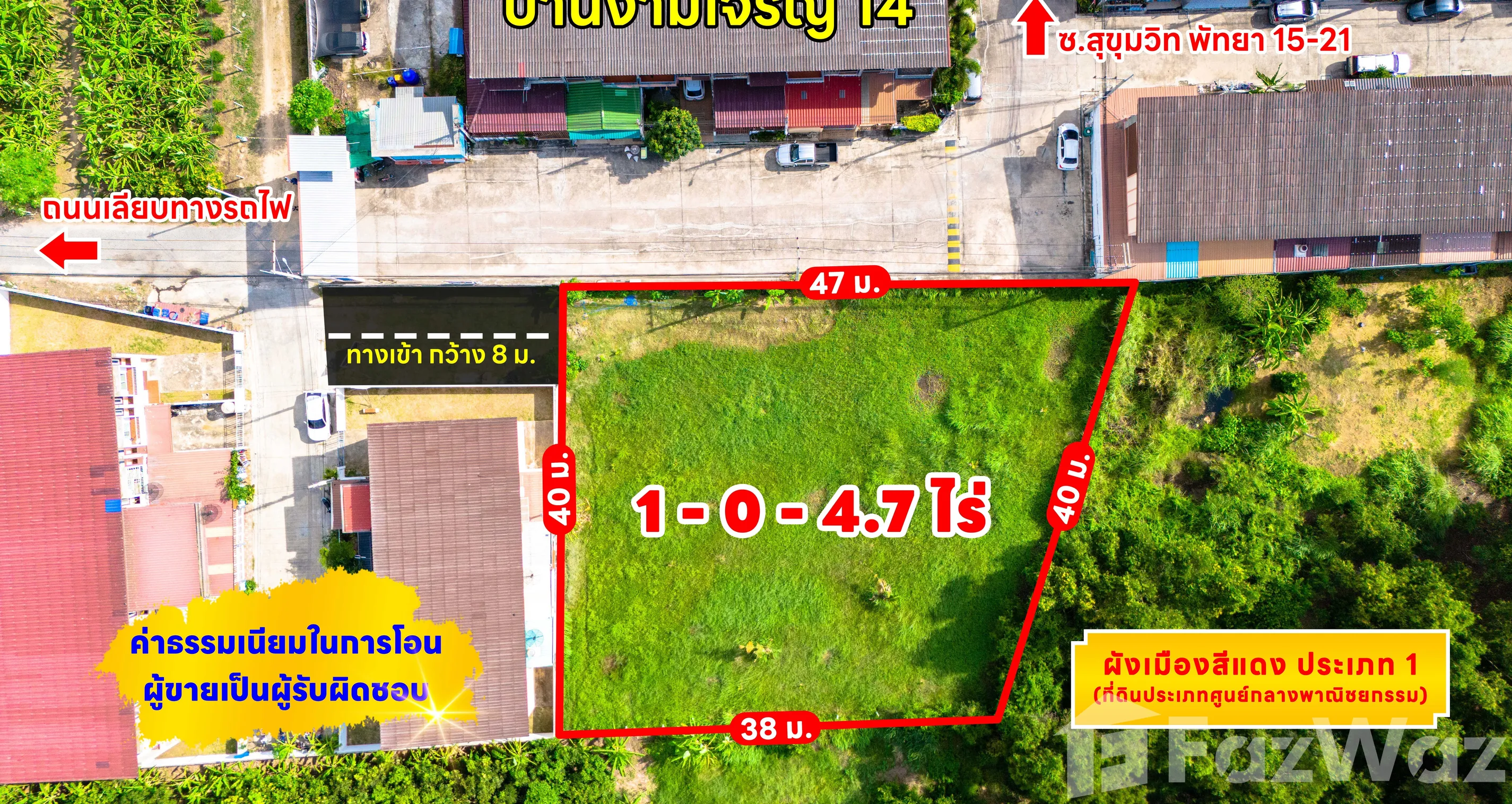 ที่ดินเปล่าศักยภาพสูง ขนาด 1 ไร่ 0 งาน 4.7 ตารางวา ทำเลดีเยี่ยม ติดถนนเลียบทางรถไฟในซอยบ้านงามเจริญ การเดินทางไปยังแหล่งงาน แหล่งช้อปปิ้ง และแหล่งท่องเที่ยวสำคัญใช้เวลาไม่นาน ทำเลที่เชื่อมต่อทุกการเดินทาง:-ใกล้ถนนเลียบทางรถไฟ, เมืองพัทยา, ศรีราชา, และท่าเรือแหลมฉบังที่ดินลักษณะดี:- รูปแปลงสี่เหลี่ยม: ขนาดกำลังดี ทำให้มีพื้นที่ใช้สอยได้เต็มประสิทธิภาพ ออกแบบอาคารได้ง่าย- ที่ดินถมเรียบร้อย: พร้อมสำหรับการก่อสร้างได้ทันที ประหยัดเวลาและค่าใช้จ่ายในการเตรียมพื้นที่ สิ่งอำนวยความสะดวกใกล้เคียง:- ติดหมู่บ้านจัดสรร 'บ้านงามเจริญ' ทำให้มีเพื่อนบ้านและบรรยากาศที่น่าอยู่- ใกล้สถานศึกษาและสถานพยาบาลชั้นนำ เช่น ใกล้โรงเรียนบางละมุง และโรงพยาบาลบางละมุง