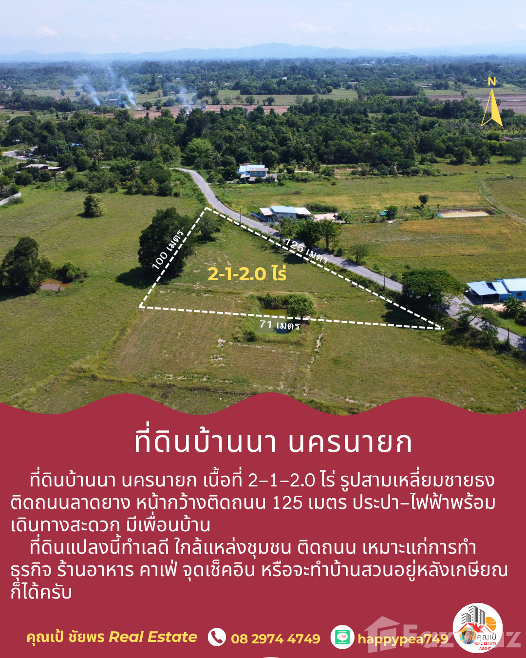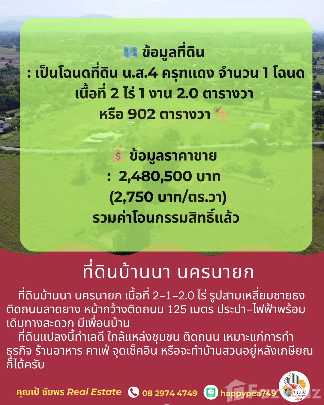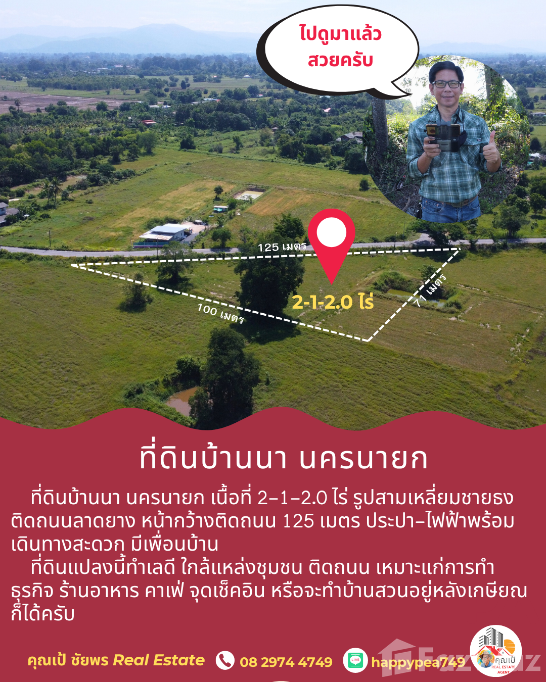 💰 ที่ดินบ้านนา นครนายก เนื้อที่ 2-1-2.0 ไร่ รูปสามเหลี่ยม ชายธง ติดถนนลาดยาง หน้ากว้างติดถนน 125 เมตร ประปา-ไฟฟ้าพร้อม เดินทางสะดวก มีเพื่อนบ้าน 💰 ที่ดินแปลงนี้ทำเลดี ใกล้แหล่งชุมชน ติดถนน เหมาะแก่การทำธุรกิจ ร้านอาหาร คาเฟ่ จุดเช็คอิน หรือจะทำบ้านสวนอยู่หลังเกษียณก็ได้ครับ💰 การซื้อที่ดินรูปสามเหลี่ยมควรพิจารณาถึงข้อดีข้อเสียอย่างรอบคอบ และควรพิจารณาถึงความเหมาะสมกับความต้องการและวัตถุประสงค์ของผู้ซื้อ หากสามารถปรับปรุงพื้นที่และจัดการกับข้อจำกัดต่างๆ ได้ ก็อาจเป็นทางเลือกที่น่าสนใจ💰 หากทำเลที่ตั้งดี มีความเจริญ มีสิ่งอำนวยความสะดวกครบครัน อาจพิจารณาซื้อได้แม้จะเป็นที่ดินรูปสามเหลี่ยม 💰 การปรับปรุง: หากตัดสินใจซื้อที่ดินรูปสามเหลี่ยม ควรพิจารณาถึงการปรับปรุงพื้นที่ เช่น การปรับรูปร่างให้เป็นสี่เหลี่ยม การจัดสวน หรือการสร้างรั้ว เพื่อลดผลกระทบด้านลบ🚧 ที่ตั้ง : ตำบลบ้านนา อำเภอบ้านนา จังหวัดนครนายก 26110 📍 การปักหมุดนำทาง Google Map : br />🏡 สถานที่สำคัญใกล้เคียง    ตลาดสดบ้านนา        5 ก.ม.    โรงพยาบาลบ้านนา        4.6 ก.ม.    แยกบ้านนา-แก่งคอย        4 ก.ม.    🧭 สีผังเมือง : สีเขียว ที่ดินประเภทชนบทและเกษตรกรรม🗺️ ข้อมูลที่ดิน : เป็นโฉนดที่ดิน น.ส.4 ครุฑแดง จำนวน 1 โฉนด เนื้อที่ 2 ไร่ 1 งาน 2.0 ตารางวา หรือ 902 ตารางวา 🏷️ 💰 ข้อมูลราคาขาย :  2,480,500 บาท รวมค่าโอนกรรมสิทธิ์แล้ว  (2,750 บาท/ตร.วา)    🌟 โอกาสดีในการลงทุนที่คุณไม่ควรพลาด! หายากแล้วทำเลดีๆแบบนี้ 🔑📢สอบถามรายละเอียดเพิ่มเติม พูดคุยได้ สบายๆ เป็นกันเอง ติดต่อ 🤵คุณเป้ ชัยพร Real Estate Agentรับฝาก ซื้อ-ขาย ที่ดินสวย เพื่อการลงทุน ธุรกิจ การเกษตร อุตสาหกรรม และอยู่อาศัย📞Tel. 08 2974 4749 📟 Line : happypea749  คลิก br />🎉ดูที่ดินแปลงอื่นๆbr />📘Facebooksbr />#ที่ดินบ้านนา #ที่ดินบ้านนานครนายก #ที่ดินติดถนน #ที่ดินนครนายก #ที่ดินชายธง #นักลงทุนที่ดิน #ที่ดินสามเหลี่ยม #ที่ดินเกษียณ #จุดเช็คอิน #ขายที่ดินนครนายก