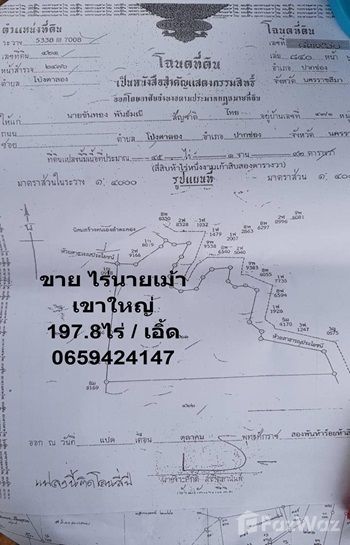 ขายที่ดินที่เขาใหญ่​ ไร่นายเม้า พันมณี ขายยกแปลง 197.8 ไร่​ มีโฉนดครบ เจ้าของขายเอง   ** ตัดถนน​จากที่ดินเข้าถนนหลักทั้งแปลง เดินทางสะดวก พื้นที่เรียบ ที่มีแหล่งน้ำ แบ่งเป็นสัดส่วน มีถนนคั่นแหล่งน้ำ ทางพร้อมคอนกรีต สร้างถนน Build เป็นโรงแรม รีสอร์ท บ้านพักตากอากาศ ดินเหมาะแก่การเพาะปลูก วิวภูเขา อากาศดี เงียบสงบ   ขายเหมาแปลง​ ตร.ว. ละ​ 7,500บาท​ / ไร่ละ​ 3,000,00บาท   64 - 50 ไร่ 2 งาน 42.0 ตารางวา 63 - 50 ไร่ 3 งาน 21.0 ตารางวา 63 - 50 ไร่ 1 งาน 40.0 ตารางวา 60 - 45 ไร่ 1 งาน 92.0 ตารางวา   เจ้าของขายเอง​ พื้นที่ตามโฉนด​ ติดต่อ 0659424147 เอิ้ดค่ะ   14.53903156,101.50843626 📌/div>   Land for sale with title deed in Khao Yai, Rai Nai Mao Panmanee. Selling the whole plot 197.8 rai. Cutting the road from the land onto the main road for the entire plot, easy to commuted. Flat area with a water source divided into proportions. Provided the road separating the water pond. Ready to build concrete road, develop to be village, hotel, resort, vacation house. The soil is suitable for cultivation. Great mountain view, good weather and quiet. Selling whole plot, 7,500 baht per sq.wah / 3,000,00 baht/ rai.   Sale by Owner; Come to see this land Whatapps +66 65 942 4147