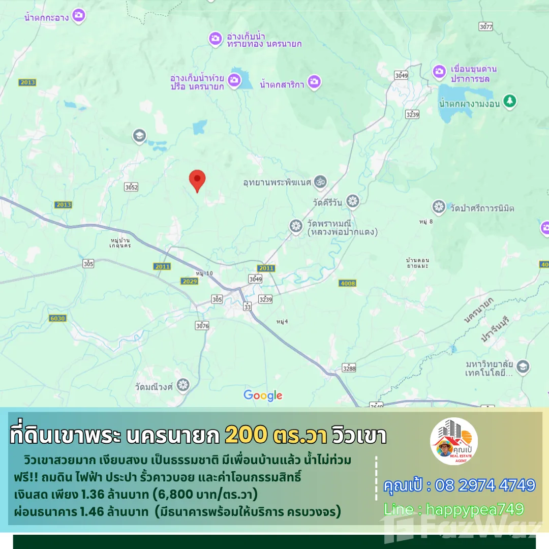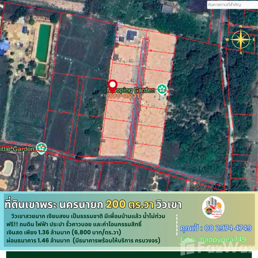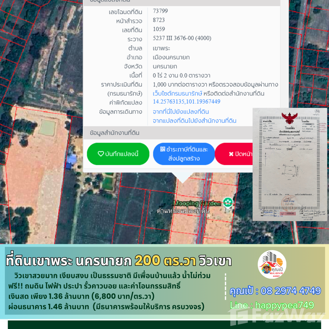 🎄 หากคุณสนใจที่ดินในจังหวัดนครนายก ที่ผ่อน-ขอสินเชื่อธนาคารได้ ในทำเลที่มีคุณภาพ คุ้มค่า วิวเขาสวยๆ บรรยากาศดี เงียบสงบ  เรามีที่ดินที่พัฒนาแล้ว พร้อมปลูกบ้านสวนในฝันตามจินตนาการของคุณได้เลย คุณไม่ต้องมาทำการพัฒนาที่ดินเองให้ยุ่งยากเสียเวลา โดยเราได้ทำการถมดิน-บดอัดอย่างดีมากว่า 3 ปี  พร้อมด้วยไฟฟ้า ประปา รั้วคอกม้าคาวบอย ถนนสาธารณะในโครงการ 8 เมตร โฉนดครุฑแดงพร้อมโอนกรรมสิทธิ์ ที่ดินแปลงนี้เข้าออกได้หลายทาง แล้วยังใกล้ร้านกาแฟสวนอาสาคาเฟ่ซึ่งเป็นจุดเช็คอินชื่อดัง ที่สำคัญที่ตรงนี้น้ำไม่ท่วม และไม่มีปัญหาไฟป่าด้วย ตอนนี้ก็มีเพื่อนบ้านมาปลูกบ้านทำสวน 2 ถึง 3 แปลงแล้ว  💵 นอกจากนี้ยังตอบโจทย์ท่านที่มีเครดิตดี ไม่ต้องการใช้เงินสดซื้อ ก็เป็นเจ้าของที่ดินแปลงนี้ได้ โดยเรามีธนาคารให้บริการสินเชื่อที่ดินครบวงจร ครับ🎏 จุดเด่น-วิวเขาสวยมาก-เงียบสงบ สัมผัสธรรมชาติ-น้ำไม่ท่วม-ไม่มีไฟป่า🚧 ที่ตั้ง      ตำบล พรหมณี อำเภอเมืองนครนายก นครนายก 26000 📍การปักหมุดนำทาง      พิกัด แปลงที่ดิน  br />🧶 ผังเมืองสีเขียว ประเภทชนบทและเกษตรกรรม📍 สถานที่สำคัญใกล้เคียง          ตัวเมือง นครนายก 12 กม.         โรงพยาบาลนครนายก 10 กม.          รร.นายร้อย จปร.  7 กม.           เอเดนฟาร์ม  12 กม.         วัดถ้ำสาริกา 16 กม.         อุทยานพระพิฆเนศ 10 กม.          ตลาดเท่ง เถิดเทิง 12 กม.         วัดหลวงพ่อปากแดง 12 กม.         น้ำตกสาริกา 19 กม.        เขื่อนขุนด่านปราการชล 25 กม.🗺️ ข้อมูลที่ดิน     🌿 เป็นโฉนดที่ดิน น.ส.4 ครุฑแดง ติดถนนสาธารณประโยชน์  🏷️      =>รวมเนื้อที่ที่ดิน 2 งาน  หรือ 200 ตารางวา 💰 ข้อมูลราคา 💵=กรณีซื้อ "เงินสด" ราคา 1,360,000 บาท  วางมัดจำ 30,000 บาท ฟรีค่าโอน นัดโอนกรรมสิทธิ์ได้เลยครับ=กรณี "ขอสินเชื่อธนาคาร"  ราคาขาย 1,460,000บาท มัดจำจำนวน 20,000 บาทครับ  ฟรีค่าโอน บริการธนาคารที่ปล่อยสินเชื่อที่ดินเปล่าครบวงจร หรือจะยื่นกู้พร้อมสร้างบ้านก็ได้ บริการฟรี🌟 โอกาสดีในการเป็นเจ้าของที่ดินสวย ที่คุณไม่ควรพลาด! 🔑📢สอบถามรายละเอียดเพิ่มเติม พูดคุยได้ สบายๆ เป็นกันเอง ติดต่อ 🤵คุณเป้ Real Estate Agentรับฝาก ซื้อ-ขาย ที่ดินสวย เพื่อการลงทุน ธุรกิจ และอยู่อาศัย📞Tel. 08 2974 4749 📟 Line : happypea749  คลิก br />🎉ดูที่ดินแปลงอื่นๆbr />#ที่ดินเขาพระ #ที่ดินนครนายก #ที่ดินแบ่งขาย #ที่ดินนครนายกแบ่งขาย #ที่ดินจัดสรรนครนายก #นครนายก #ขายที่ดินนครนายก #ที่ดินนครนายกราคาถูก  #ที่ดินเกษตร #วิวเขาพระ #บ้านพักตากอากาศนครนายก #สวนเกษตรนครนายก #รีสอร์ทนครนายก #เที่ยวนครนายก #บ้านสวนนครนายก #บ้านสวนเขาพระ #สวนทุเรียนนครนายก #สวนมะยงชิดนครนายก #สวนผลไ