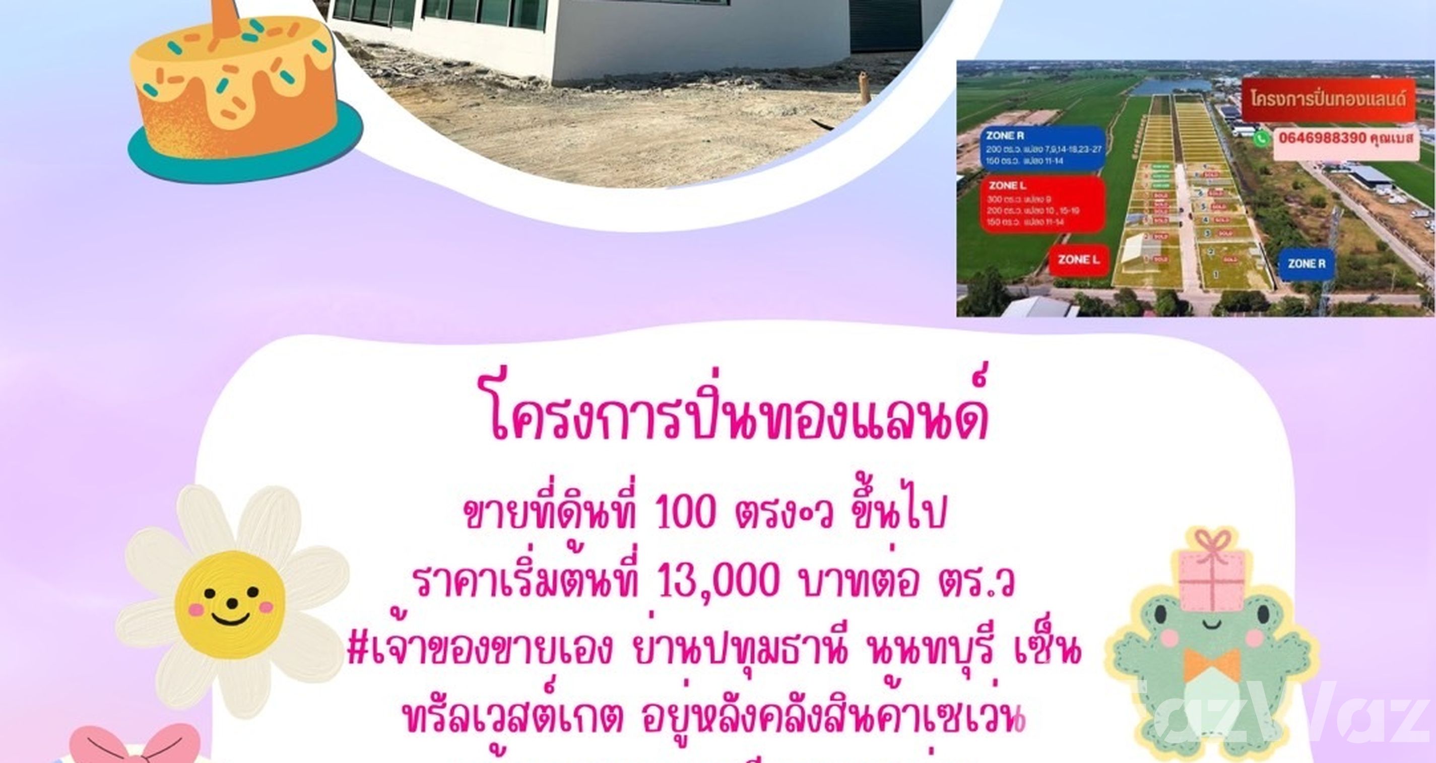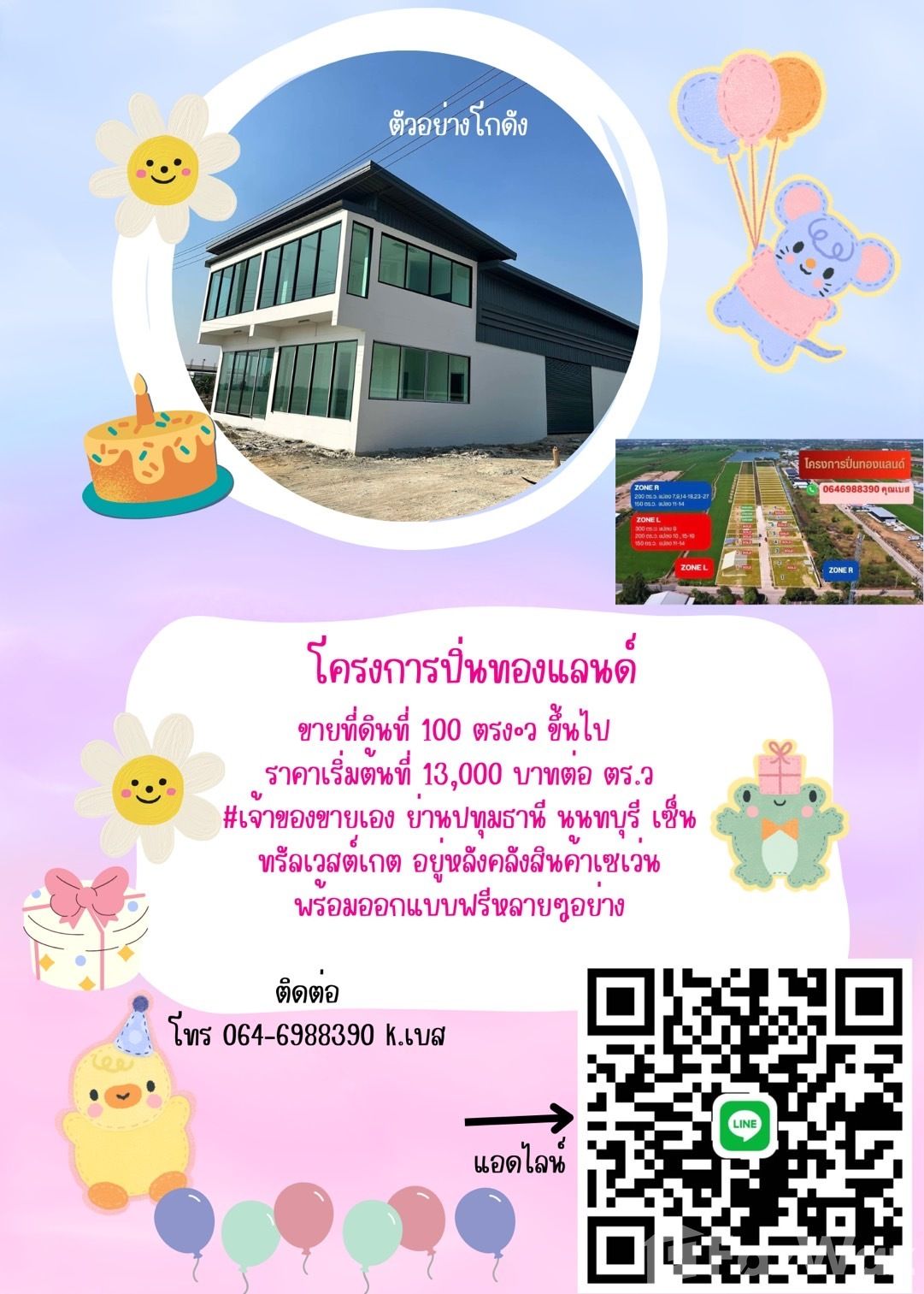 📌 โครงการใหม่ปิ่นทองแลนด์ 👑 ขายที่ดินเปล่าถมแล้ว พร้อมบริการสร้างโกดัง-โรงงาน🏭 #ออกแบบฟรี❗️ #ที่ดินเปล่าเริ่มต้น 2.2 ล้านบาท  📍พิกัด หลังคลังสินค้า 7-11  เส้นสุพรรณบุรี 340 บางบัวทอง นนทบุรี. 🛣 🏘 ในโครงการเรามีน้ำไฟพร้อมใช้งาน-มีถนนคอนกรีตกว้าง 10 เมตร ❗️ 📌พื้นที่สีเขียว ติดแหล่งชุมชน🏘 ขายเป็นตารางวาละ 15,000 บาท 100 ตารางวาขึ้นไป❗️ สิ่งปลูกสร้าง ตารางเมตรละ 8,500 บาทขึ้นไป❗️ 📌มีบริการทำสินเชื่อทุกธนาคาร💸💸 ดาวน์น้อย ผ่อนนาน 10 ปี💸 กู้ไม่ผ่าน คืนเงินจอง 100% ทันที🤝💸 #ฟรีโอน #จองได้แล้ววันนี้ #โฉนดพร้อมโอนกรรมสิทธิ์ 📞064-698-8390 Kเบส 🆔0646988390