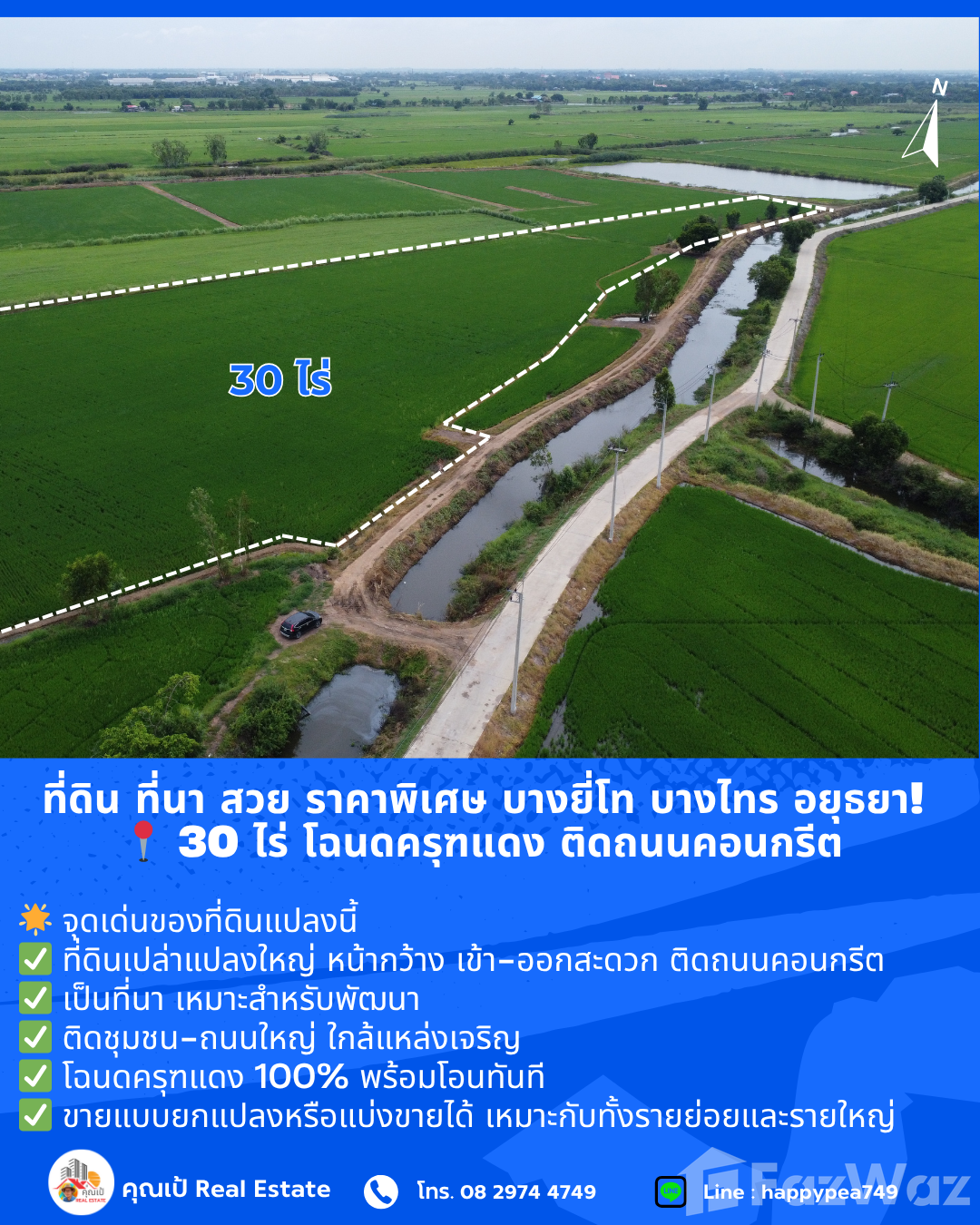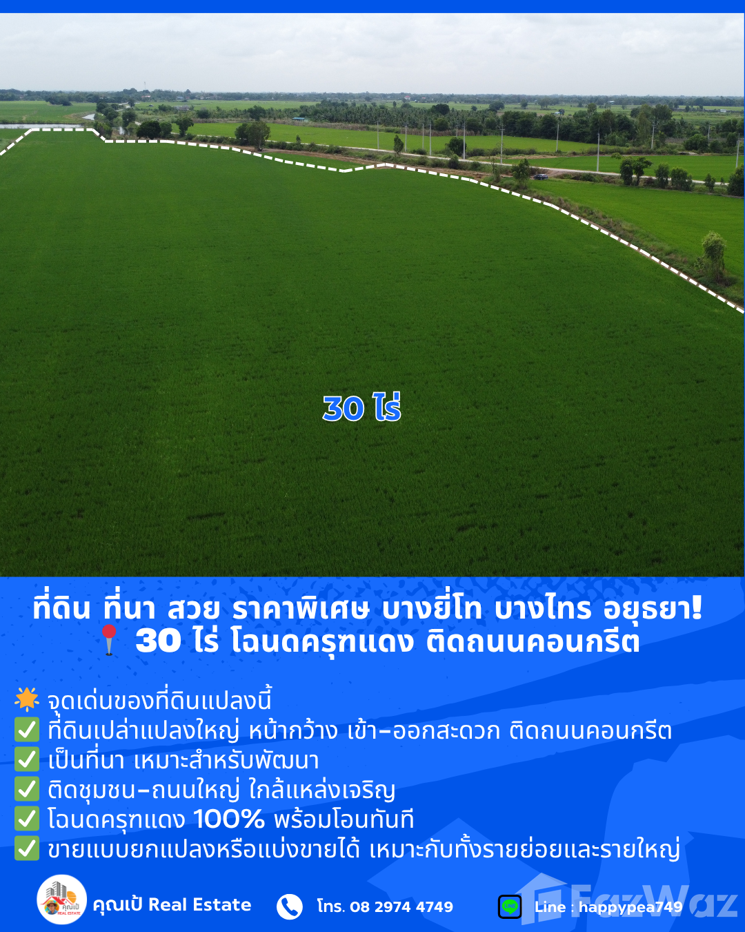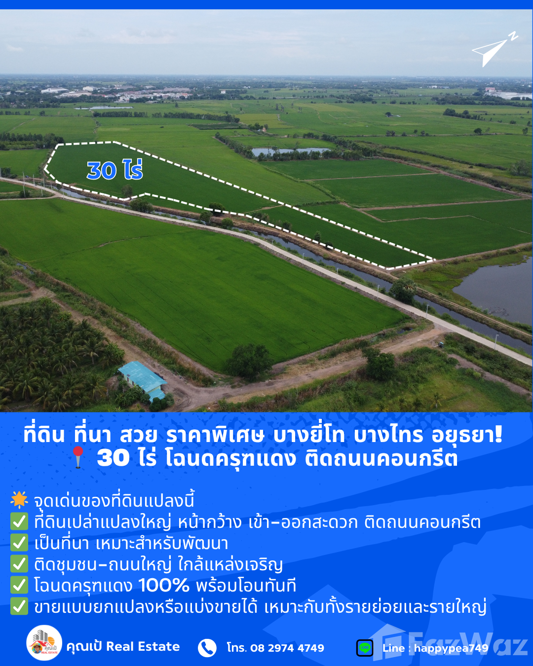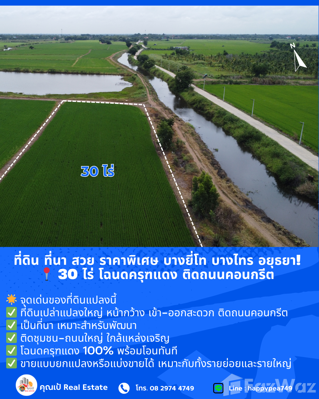 🚨 ที่ดิน ที่นา บางไทร อยุธยา! สวย ราคาพิเศษ  📍 ขนาด 30 ไร่ โฉนดครุฑแดง ติดถนนคอนกรีต 🔥 ขายถูกที่สุดในย่านนี้ เริ่มต้นเพียงไร่ละ 850,000 บาท!!🌟 จุดเด่นของที่ดินแปลงนี้✅ ที่ดินเปล่าแปลงใหญ่ หน้ากว้าง เข้า-ออกสะดวก อยู่ติดถนนคอนกรีตสาธารณะ✅ เป็นที่นา เหมาะสำหรับพัฒนา✅ ติดชุมชน-ถนนใหญ่ ใกล้แหล่งเจริญ✅ โฉนดครุฑแดง 100% พร้อมโอนทันที✅ ขายแบบยกแปลงหรือแบ่งขายได้ เหมาะกับทั้งรายย่อยและรายใหญ่📌 ที่ตั้งทำเลศักยภาพตำบลบางยี่โท อำเภอบางไทร จังหวัดพระนครศรีอยุธยา🧭 พิกัด Google Map: br />📍 สถานที่สำคัญใกล้เคียง    ถนนสายเอเชีย – ขับรถประมาณ 15 นาที    ตลาดน้ำบางไทร / ศูนย์ศิลปาชีพบางไทร – 6 กม.    โรงพยาบาลบางไทร – 5.5 กม.    มหาวิทยาลัยเทคโนโลยีราชมงคลสุวรรณภูมิ – 8 กม.    สถานีรถไฟฟ้าสายสีแดง (อนาคต) บางปะอิน – 17 กม.    อำเภอเมืองอยุธยา – 25 กม.    จ.ปทุมธานี – 20 กม.🗺️ ผังเมืองสีเขียว : พื้นที่ชนบทและเกษตรกรรมเหมาะสำหรับ:🌾 การเกษตร พื้นที่เพาะปลูก ฟาร์มเกษตรอินทรีย์🏠 พัฒนาเป็นรีสอร์ต โฮมสเตย์ พื้นที่พักผ่อนเชิงธรรมชาติ🚜 โกดัง เก็บสินค้า ฟาร์มสัตว์ ศูนย์เรียนรู้เกษตร💡 ซื้อเก็บรอเพิ่มมูลค่า หรือปั้นเป็นที่ดินจัดสรรเพื่ออนาคต📐 รายละเอียดที่ดิน    ขนาด: 30-0-0 ไร่ หรือ 12,000 ตร.วา    โฉนดครุฑแดง น.ส.4 พร้อมโอน    ติดถนนคอนกรีตสาธารณประโยชน์ หน้าแปลงกว้าง ใช้งานง่าย    แบ่งขายได้ขั้นต่ำ 3 ไร่ขึ้นไป💰 ราคาขายพิเศษ🔹 Option 1: ขายยกแปลง 30 ไร่➡️ ไร่ละ 850,000 บาท (เพียง 2,125 บาท/ตร.วา)➡️ รวมเป็นเงิน 25,500,000 บาท🔹 Option 2: แบ่งขายเริ่มที่ 3 ไร่ขึ้นไป➡️ ไร่ละ 1,000,000 บาท (2,500 บาท/ตร.วา)📌 พิเศษ! ผู้ขายออกค่าโอน-ค่าภาษีทั้งหมด!!💼 เหมาะกับใคร?✔️ นักลงทุนอสังหาฯ ระยะกลาง-ยาว✔️ ผู้ประกอบการด้านเกษตรหรือโลจิสติกส์✔️ ผู้ที่มองหาที่ดินเงียบสงบใกล้กรุงเทพฯ✔️ คนที่ต้องการเก็บที่ดินรอ Capital Gain ในอนาคต🌿 โอกาสทองแบบนี้ ไม่ได้มีทุกวัน!ที่ดินทำเลดี ใกล้กรุงเทพฯ ราคายังไม่สูงมาก💥 อย่ารอให้ราคาขึ้น รีบจับจองก่อนคนอื่น!!📞 ติดต่อโดยตรงกับนายหน้าผู้เชี่ยวชาญ🤵‍♂️ คุณเป้ ชัยพร | Real Estate Agentรับฝาก ซื้อ-ขาย ที่ดินสวย เพื่อการลงทุน ธุรกิจ การเกษตร อุตสาหกรรม และอยู่อาศัย📞Tel. 08 2974 4749 📟 Line : happypea749  คลิก br />🎉ดูที่ดินแปลงอื่นๆbr />📘Facebooksbr />#ที่ดินอยุธยา #ที่ดินบางไทร #ขายที่ดินเปล่า #ที่ดินราคาถูก #ที่ดินเพื่อการลงทุน#ที่ดินเกษตรกรรม #ที่ดินแปลงใหญ่ #โฉนดครุฑแดง #ที่ดินติดถนน #ที่ดินแบ่งขาย#ที่ดินใกล้กรุงเทพ #อสังหาริมทรัพย์เพื่ออนาคต #ลงทุนที่ดิน #บางไทรอยุธยา#RealEstateThailand #นายหน้ามืออาชีพ #ที่ดินราคาดี