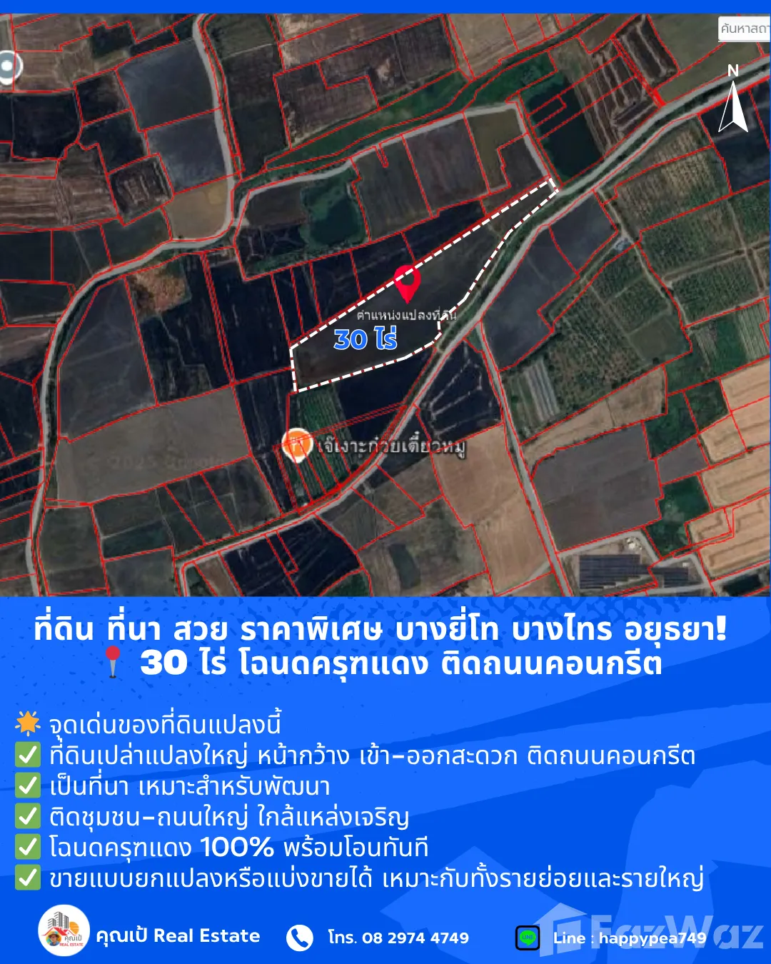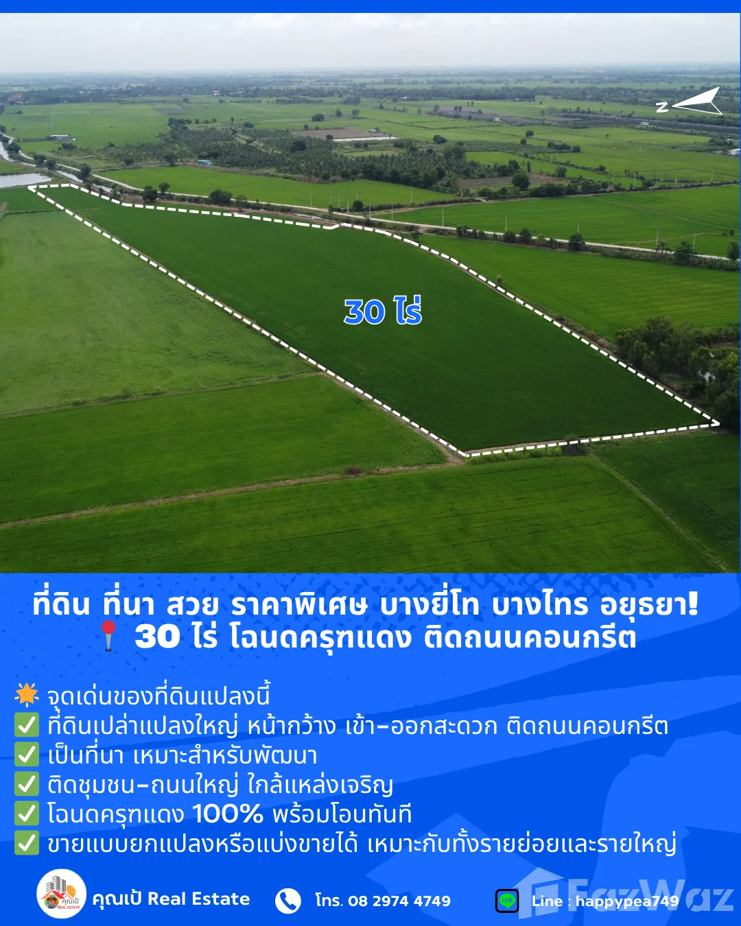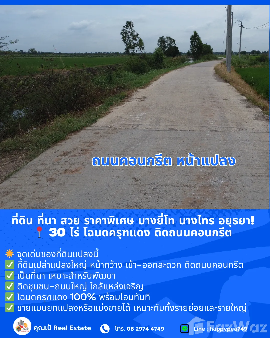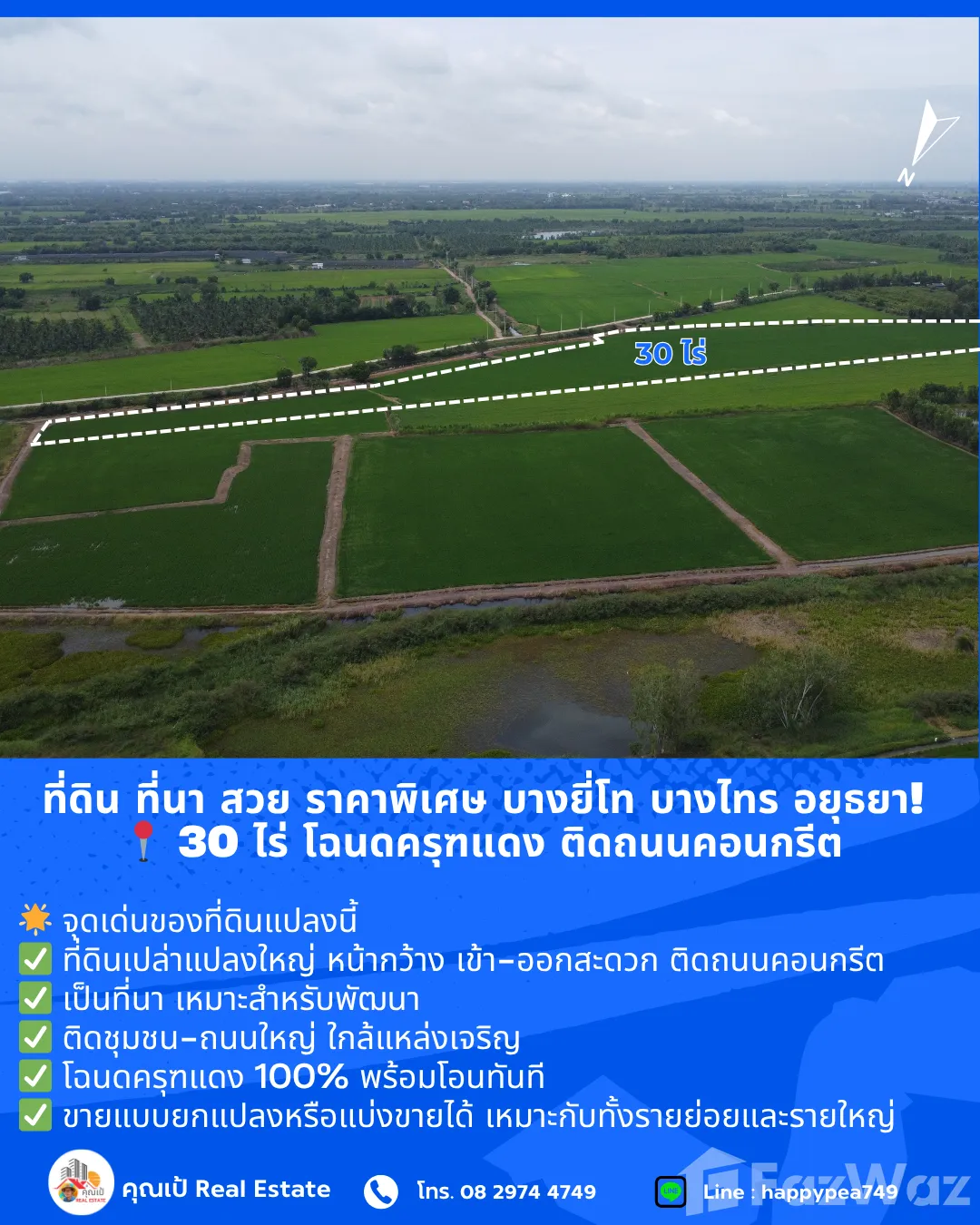 🚨 ที่ดิน ที่นา บางไทร อยุธยา! สวย ราคาพิเศษ  📍 ขนาด 30 ไร่ โฉนดครุฑแดง ติดถนนคอนกรีต 🔥 ขายถูกที่สุดในย่านนี้ เริ่มต้นเพียงไร่ละ 850,000 บาท!!🌟 จุดเด่นของที่ดินแปลงนี้✅ ที่ดินเปล่าแปลงใหญ่ หน้ากว้าง เข้า-ออกสะดวก อยู่ติดถนนคอนกรีตสาธารณะ✅ เป็นที่นา เหมาะสำหรับพัฒนา✅ ติดชุมชน-ถนนใหญ่ ใกล้แหล่งเจริญ✅ โฉนดครุฑแดง 100% พร้อมโอนทันที✅ ขายแบบยกแปลงหรือแบ่งขายได้ เหมาะกับทั้งรายย่อยและรายใหญ่📌 ที่ตั้งทำเลศักยภาพตำบลบางยี่โท อำเภอบางไทร จังหวัดพระนครศรีอยุธยา🧭 พิกัด Google Map: br />📍 สถานที่สำคัญใกล้เคียง    ถนนสายเอเชีย – ขับรถประมาณ 15 นาที    ตลาดน้ำบางไทร / ศูนย์ศิลปาชีพบางไทร – 6 กม.    โรงพยาบาลบางไทร – 5.5 กม.    มหาวิทยาลัยเทคโนโลยีราชมงคลสุวรรณภูมิ – 8 กม.    สถานีรถไฟฟ้าสายสีแดง (อนาคต) บางปะอิน – 17 กม.    อำเภอเมืองอยุธยา – 25 กม.    จ.ปทุมธานี – 20 กม.🗺️ ผังเมืองสีเขียว : พื้นที่ชนบทและเกษตรกรรมเหมาะสำหรับ:🌾 การเกษตร พื้นที่เพาะปลูก ฟาร์มเกษตรอินทรีย์🏠 พัฒนาเป็นรีสอร์ต โฮมสเตย์ พื้นที่พักผ่อนเชิงธรรมชาติ🚜 โกดัง เก็บสินค้า ฟาร์มสัตว์ ศูนย์เรียนรู้เกษตร💡 ซื้อเก็บรอเพิ่มมูลค่า หรือปั้นเป็นที่ดินจัดสรรเพื่ออนาคต📐 รายละเอียดที่ดิน    ขนาด: 30-0-0 ไร่ หรือ 12,000 ตร.วา    โฉนดครุฑแดง น.ส.4 พร้อมโอน    ติดถนนคอนกรีตสาธารณประโยชน์ หน้าแปลงกว้าง ใช้งานง่าย    แบ่งขายได้ขั้นต่ำ 3 ไร่ขึ้นไป💰 ราคาขายพิเศษ🔹 Option 1: ขายยกแปลง 30 ไร่➡️ ไร่ละ 850,000 บาท (เพียง 2,125 บาท/ตร.วา)➡️ รวมเป็นเงิน 25,500,000 บาท🔹 Option 2: แบ่งขายเริ่มที่ 3 ไร่ขึ้นไป➡️ ไร่ละ 1,000,000 บาท (2,500 บาท/ตร.วา)📌 พิเศษ! ผู้ขายออกค่าโอน-ค่าภาษีทั้งหมด!!💼 เหมาะกับใคร?✔️ นักลงทุนอสังหาฯ ระยะกลาง-ยาว✔️ ผู้ประกอบการด้านเกษตรหรือโลจิสติกส์✔️ ผู้ที่มองหาที่ดินเงียบสงบใกล้กรุงเทพฯ✔️ คนที่ต้องการเก็บที่ดินรอ Capital Gain ในอนาคต🌿 โอกาสทองแบบนี้ ไม่ได้มีทุกวัน!ที่ดินทำเลดี ใกล้กรุงเทพฯ ราคายังไม่สูงมาก💥 อย่ารอให้ราคาขึ้น รีบจับจองก่อนคนอื่น!!📞 ติดต่อโดยตรงกับนายหน้าผู้เชี่ยวชาญ🤵‍♂️ คุณเป้ ชัยพร | Real Estate Agentรับฝาก ซื้อ-ขาย ที่ดินสวย เพื่อการลงทุน ธุรกิจ การเกษตร อุตสาหกรรม และอยู่อาศัย📞Tel. 08 2974 4749 📟 Line : happypea749  คลิก br />🎉ดูที่ดินแปลงอื่นๆbr />📘Facebooksbr />#ที่ดินอยุธยา #ที่ดินบางไทร #ขายที่ดินเปล่า #ที่ดินราคาถูก #ที่ดินเพื่อการลงทุน#ที่ดินเกษตรกรรม #ที่ดินแปลงใหญ่ #โฉนดครุฑแดง #ที่ดินติดถนน #ที่ดินแบ่งขาย#ที่ดินใกล้กรุงเทพ #อสังหาริมทรัพย์เพื่ออนาคต #ลงทุนที่ดิน #บางไทรอยุธยา#RealEstateThailand #นายหน้ามืออาชีพ #ที่ดินราคาดี