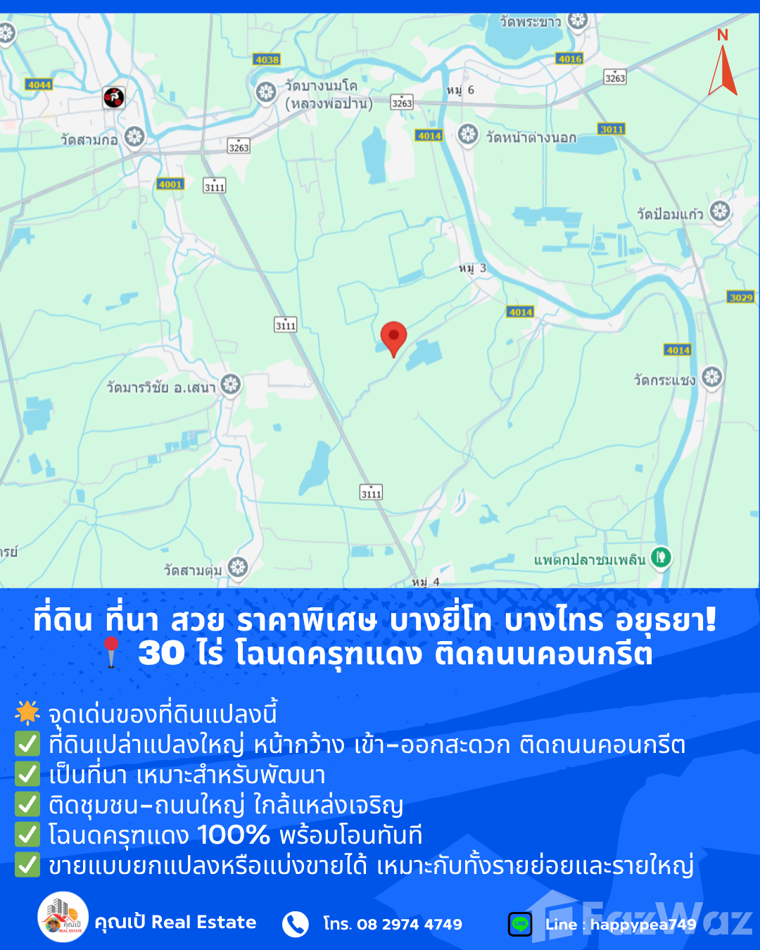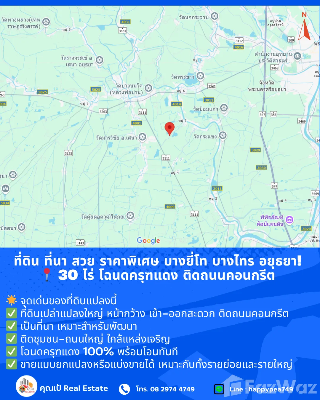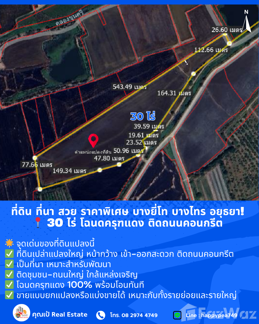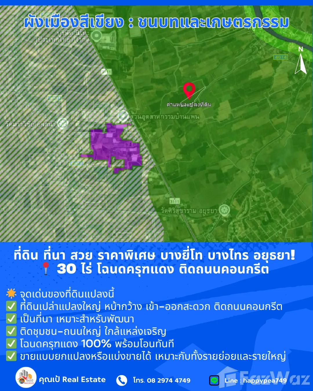 🚨 ที่ดิน ที่นา บางไทร อยุธยา! สวย ราคาพิเศษ  📍 ขนาด 30 ไร่ โฉนดครุฑแดง ติดถนนคอนกรีต 🔥 ขายถูกที่สุดในย่านนี้ เริ่มต้นเพียงไร่ละ 850,000 บาท!!🌟 จุดเด่นของที่ดินแปลงนี้✅ ที่ดินเปล่าแปลงใหญ่ หน้ากว้าง เข้า-ออกสะดวก อยู่ติดถนนคอนกรีตสาธารณะ✅ เป็นที่นา เหมาะสำหรับพัฒนา✅ ติดชุมชน-ถนนใหญ่ ใกล้แหล่งเจริญ✅ โฉนดครุฑแดง 100% พร้อมโอนทันที✅ ขายแบบยกแปลงหรือแบ่งขายได้ เหมาะกับทั้งรายย่อยและรายใหญ่📌 ที่ตั้งทำเลศักยภาพตำบลบางยี่โท อำเภอบางไทร จังหวัดพระนครศรีอยุธยา🧭 พิกัด Google Map: br />📍 สถานที่สำคัญใกล้เคียง    ถนนสายเอเชีย – ขับรถประมาณ 15 นาที    ตลาดน้ำบางไทร / ศูนย์ศิลปาชีพบางไทร – 6 กม.    โรงพยาบาลบางไทร – 5.5 กม.    มหาวิทยาลัยเทคโนโลยีราชมงคลสุวรรณภูมิ – 8 กม.    สถานีรถไฟฟ้าสายสีแดง (อนาคต) บางปะอิน – 17 กม.    อำเภอเมืองอยุธยา – 25 กม.    จ.ปทุมธานี – 20 กม.🗺️ ผังเมืองสีเขียว : พื้นที่ชนบทและเกษตรกรรมเหมาะสำหรับ:🌾 การเกษตร พื้นที่เพาะปลูก ฟาร์มเกษตรอินทรีย์🏠 พัฒนาเป็นรีสอร์ต โฮมสเตย์ พื้นที่พักผ่อนเชิงธรรมชาติ🚜 โกดัง เก็บสินค้า ฟาร์มสัตว์ ศูนย์เรียนรู้เกษตร💡 ซื้อเก็บรอเพิ่มมูลค่า หรือปั้นเป็นที่ดินจัดสรรเพื่ออนาคต📐 รายละเอียดที่ดิน    ขนาด: 30-0-0 ไร่ หรือ 12,000 ตร.วา    โฉนดครุฑแดง น.ส.4 พร้อมโอน    ติดถนนคอนกรีตสาธารณประโยชน์ หน้าแปลงกว้าง ใช้งานง่าย    แบ่งขายได้ขั้นต่ำ 3 ไร่ขึ้นไป💰 ราคาขายพิเศษ🔹 Option 1: ขายยกแปลง 30 ไร่➡️ ไร่ละ 850,000 บาท (เพียง 2,125 บาท/ตร.วา)➡️ รวมเป็นเงิน 25,500,000 บาท🔹 Option 2: แบ่งขายเริ่มที่ 3 ไร่ขึ้นไป➡️ ไร่ละ 1,000,000 บาท (2,500 บาท/ตร.วา)📌 พิเศษ! ผู้ขายออกค่าโอน-ค่าภาษีทั้งหมด!!💼 เหมาะกับใคร?✔️ นักลงทุนอสังหาฯ ระยะกลาง-ยาว✔️ ผู้ประกอบการด้านเกษตรหรือโลจิสติกส์✔️ ผู้ที่มองหาที่ดินเงียบสงบใกล้กรุงเทพฯ✔️ คนที่ต้องการเก็บที่ดินรอ Capital Gain ในอนาคต🌿 โอกาสทองแบบนี้ ไม่ได้มีทุกวัน!ที่ดินทำเลดี ใกล้กรุงเทพฯ ราคายังไม่สูงมาก💥 อย่ารอให้ราคาขึ้น รีบจับจองก่อนคนอื่น!!📞 ติดต่อโดยตรงกับนายหน้าผู้เชี่ยวชาญ🤵‍♂️ คุณเป้ ชัยพร | Real Estate Agentรับฝาก ซื้อ-ขาย ที่ดินสวย เพื่อการลงทุน ธุรกิจ การเกษตร อุตสาหกรรม และอยู่อาศัย📞Tel. 08 2974 4749 📟 Line : happypea749  คลิก br />🎉ดูที่ดินแปลงอื่นๆbr />📘Facebooksbr />#ที่ดินอยุธยา #ที่ดินบางไทร #ขายที่ดินเปล่า #ที่ดินราคาถูก #ที่ดินเพื่อการลงทุน#ที่ดินเกษตรกรรม #ที่ดินแปลงใหญ่ #โฉนดครุฑแดง #ที่ดินติดถนน #ที่ดินแบ่งขาย#ที่ดินใกล้กรุงเทพ #อสังหาริมทรัพย์เพื่ออนาคต #ลงทุนที่ดิน #บางไทรอยุธยา#RealEstateThailand #นายหน้ามืออาชีพ #ที่ดินราคาดี