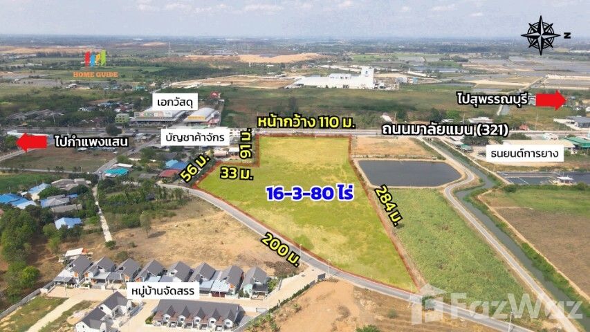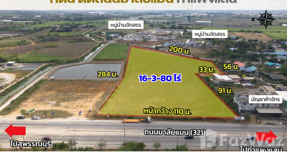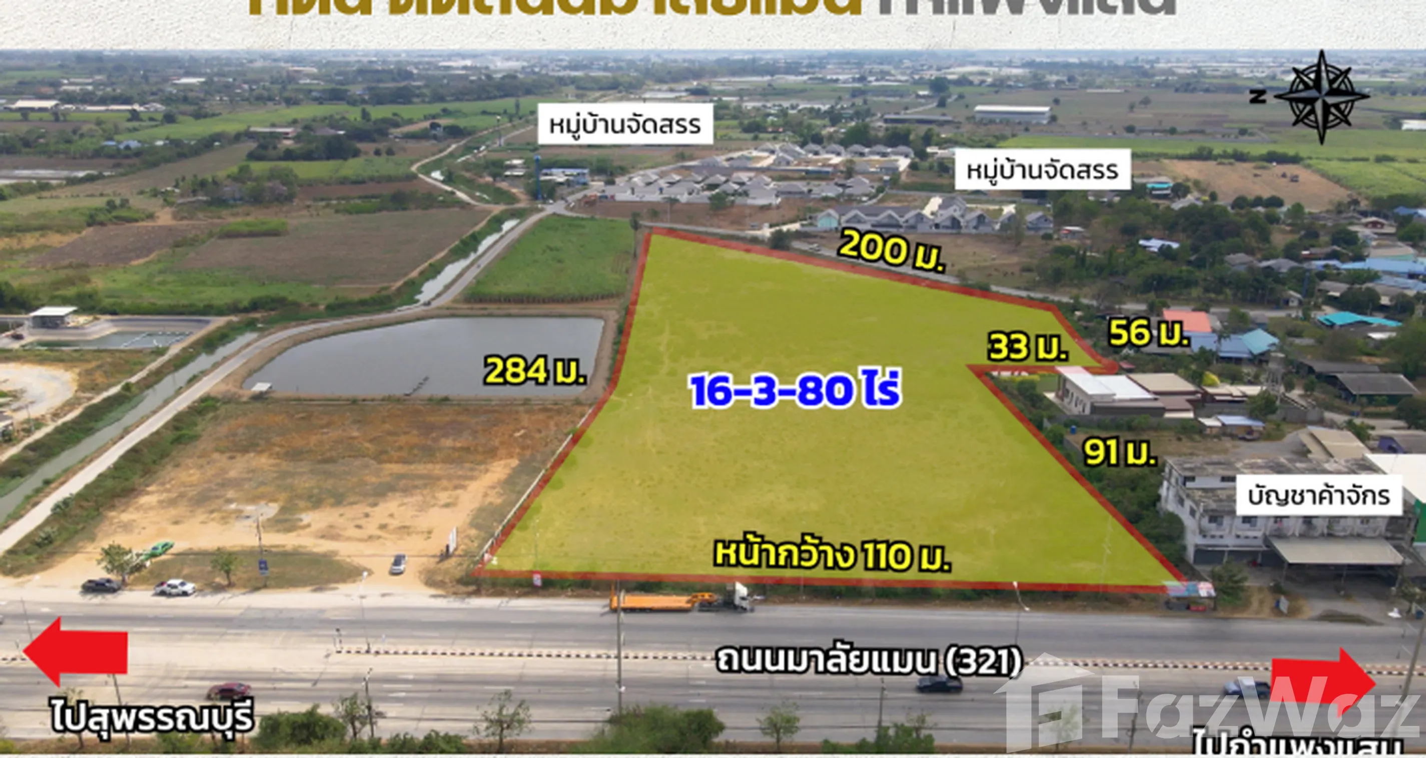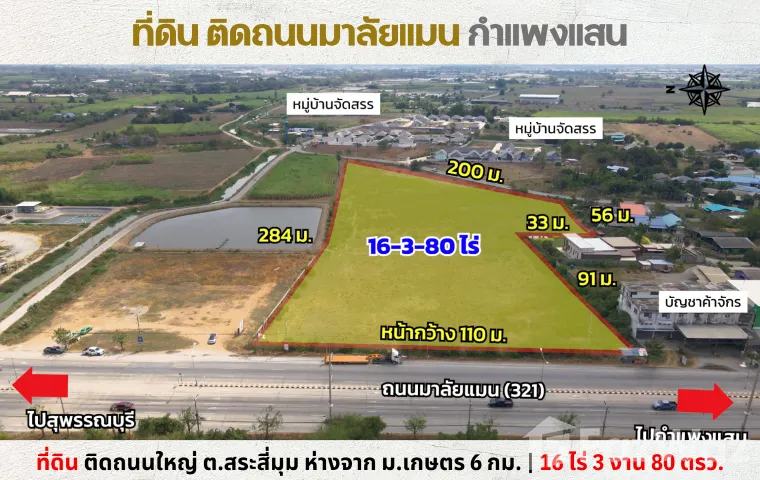 ที่ดินติดถนนใหญ่ 4 เลน ทางหลวง 321 มาลัยแมน เส้นเชื่อมต่อนครปฐม-สุพรรณบุรี ต.สระสี่มุม อ.กำแพงแสน จ.นครปฐม เนื้อที่ 16 ไร่ 3 งาน 80 ตารางวา หน้ากว้าง 110 เมตร ลึก 284 เมตร ด้านหลังชนถนนลาดยางกว้าง 6 เมตร ห่างจากมหาวิทยาลัยเกษตรกำแพงแสนเพียง 6 กิโลเมตร อยู่เยื้องร้านเอกวัสดุ ใกล้โรงเรียนหนอกพงนก วัดหนอกพงนก อบต.สระพัฒนา และโรงเรียนการบิน เหมาะทำกิจการร้านค้า โกดัง โรงงานขนาดเล็ก หรือปั้มน้ำมัน