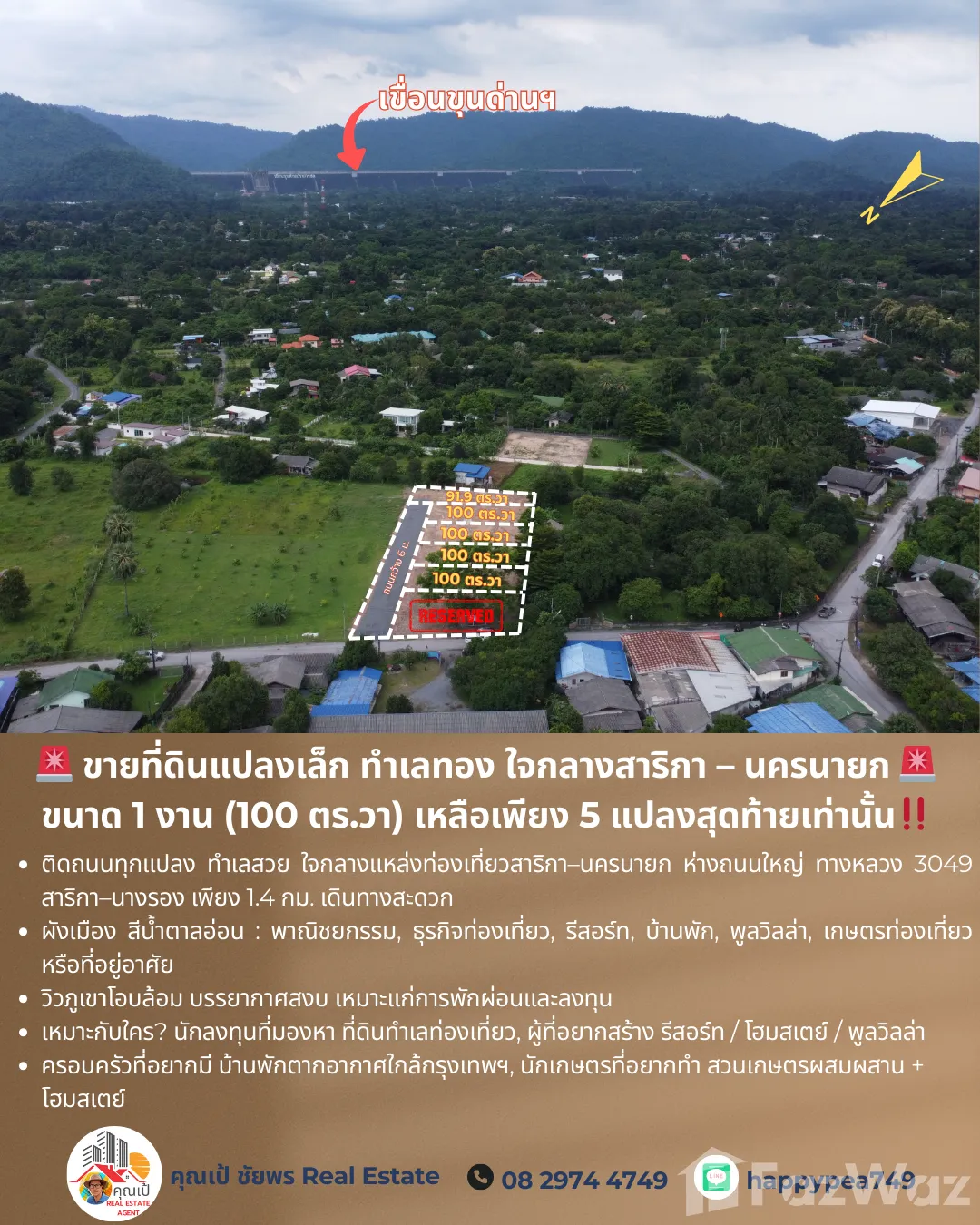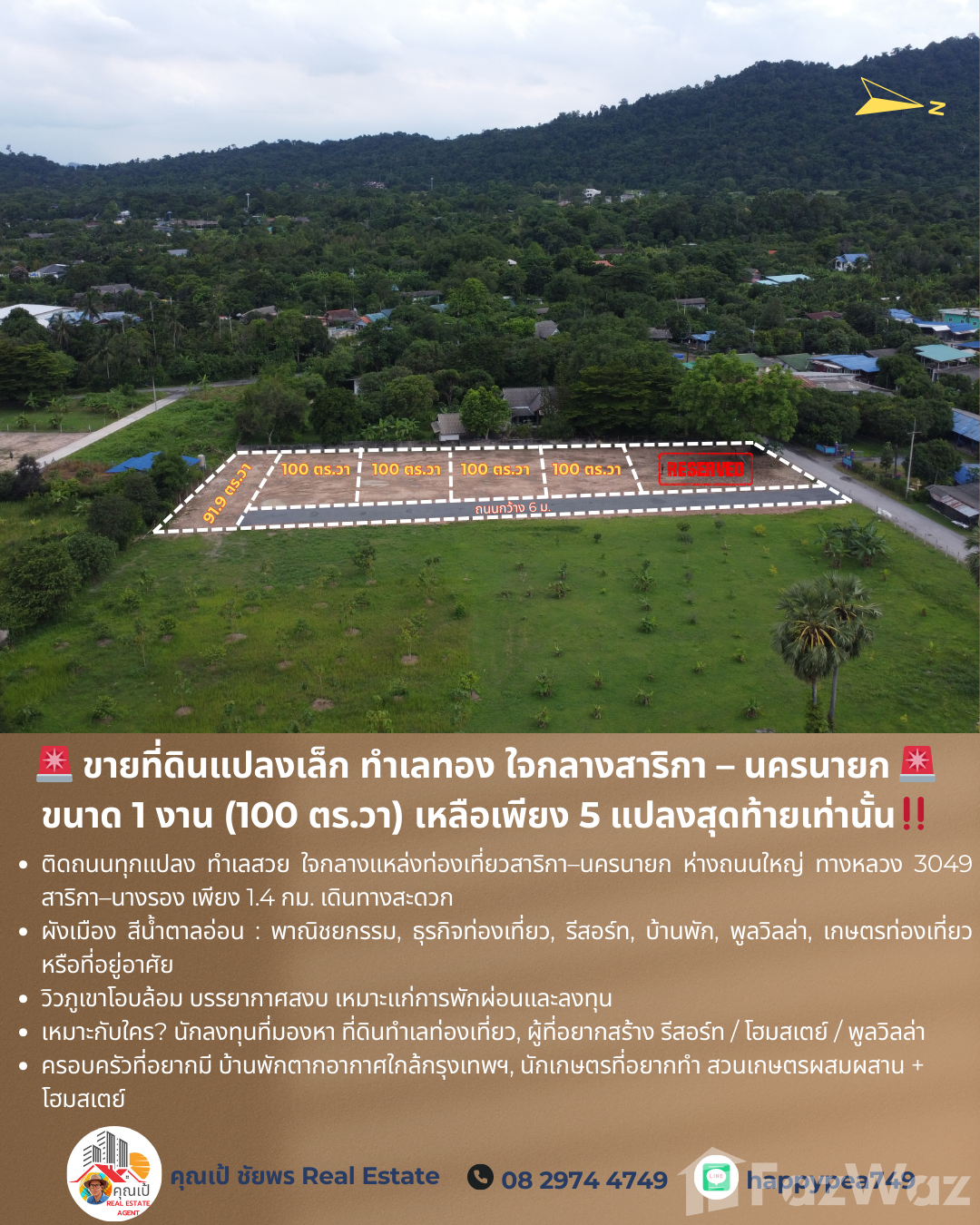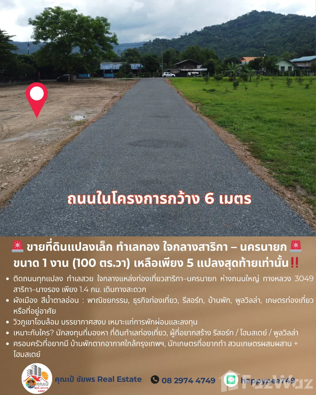 🚨 ขายที่ดินแปลงเล็ก ทำเลทอง ใจกลางสาริกา – นครนายก 🚨 ขนาด 1 งาน (100 ตร.วา) เหลือเพียง 5 แปลงสุดท้ายเท่านั้น‼️🌟 จุดเด่นของที่ดินแปลงนี้ทำเลสวย ใจกลางแหล่งท่องเที่ยวสาริกา–นครนายกห่างถนนใหญ่เพียง 1.4 กม. (ทางหลวง 3049 สาริกา–นางรอง) เดินทางสะดวกผังเมือง สีน้ำตาลอ่อน : พาณิชยกรรม, ธุรกิจท่องเที่ยว, รีสอร์ท, บ้านพัก, พูลวิลล่า, เกษตรท่องเที่ยว หรือที่อยู่อาศัยวิวภูเขาโอบล้อม บรรยากาศสงบ เหมาะแก่การพักผ่อนและลงทุนทางเข้าอยู่ใกล้โรงเรียนบ้านดงวิทยาคาร และทางเข้าวัดบ้านดง ตรงข้าม ดงช้างคาเฟ่📌 ที่ตั้งทำเลศักยภาพ : ถนนบ้านดง 2 ตำบล สาริกา อำเภอเมืองนครนายก นครนายก 26000🧭 พิกัด Google Map : br />📍 สถานที่สำคัญใกล้เคียง     อุทยานวังตะไคร้            2.7 ก.ม.     แก่งสามชั้น                   3.9 ก.ม.     น้ำตกนางรอง                4.4 ก.ม.     เขื่อนขุนด่านปราการชล   5.6 ก.ม.     พุทธอุทยานมาฆบูชาอนุสรณ์ สวนพุทธชยันตี      7.9 ก.ม.     น้ำตกสาริกา                  9.1 ก.ม.     อุทยานพระพิฆเนศ          9.9 ก.ม.     แม็คโคร นครนายก         15.8 ก.ม.     โรงพยาบาลนครนายก     17.8 ก.ม.🗺️ ผังเมือง : เขตสีน้ำตาลอ่อน ประเภทอนุรักษ์เพื่อส่งเสริมเอกลักษณ์ศิลปวัฒนธรรมไทย📐 รายละเอียดที่ดิน  :  แบ่งขายเริ่มต้นขนาด 1 งาน หรือ 100 ตร.วา ขึ้นไป     💰 ราคาพิเศษ 🔹 ราคา 15,900 บาท/ตร.วา รวมเป็นเงิน 1,5900,000 บาท📌 พิเศษ! ผู้ขายออกค่าโอน-ค่าภาษีทั้งหมด!!🌟 ขั้นตอนการซื้อง่าย ๆ : วางจองแปลงที่ถูกใจ → เข้าชื่อแบ่งโฉนด → ได้โฉนดภายใน 3 เดือน💼 เหมาะกับใคร?นักลงทุนที่มองหา ทำเลท่องเที่ยวผู้ที่อยากสร้าง รีสอร์ท / โฮมสเตย์ / พูลวิลล่าครอบครัวที่อยากมี บ้านพักตากอากาศใกล้กรุงเทพฯนักเกษตรที่อยากทำ สวนเกษตรผสมผสาน + โฮมสเตย์🌿 โอกาสทองที่ไม่ควรพลาด! ที่ดินเล็ก ๆ ในทำเลท่องเที่ยวสาริกาแบบนี้ หายากมาก 💥📢สอบถามรายละเอียดเพิ่มเติม ติดต่อ 🤵‍♂️ คุณเป้ ชัยพร | Real Estate Agentรับฝาก ซื้อ-ขาย ที่ดินสวย เพื่อการลงทุน ธุรกิจ การเกษตร อุตสาหกรรม และอยู่อาศัย📞Tel. 08 2974 4749 📟 Line : happypea749  คลิก br />🎉ดูที่ดินแปลงอื่นๆbr />📘Facebooksbr />#ที่ดินนครนายก #ที่ดินสาริกา #ขายที่ดินวิวเขา #ที่ดินแปลงเล็ก #บ้านพักตากอากาศ #ลงทุนรีสอร์ท #พูลวิลล่า #บ้านสวนใกล้กรุงเทพ #ลงทุนอสังหาฯ #ลงทุนที่ดิน