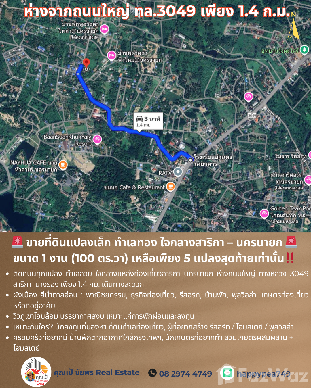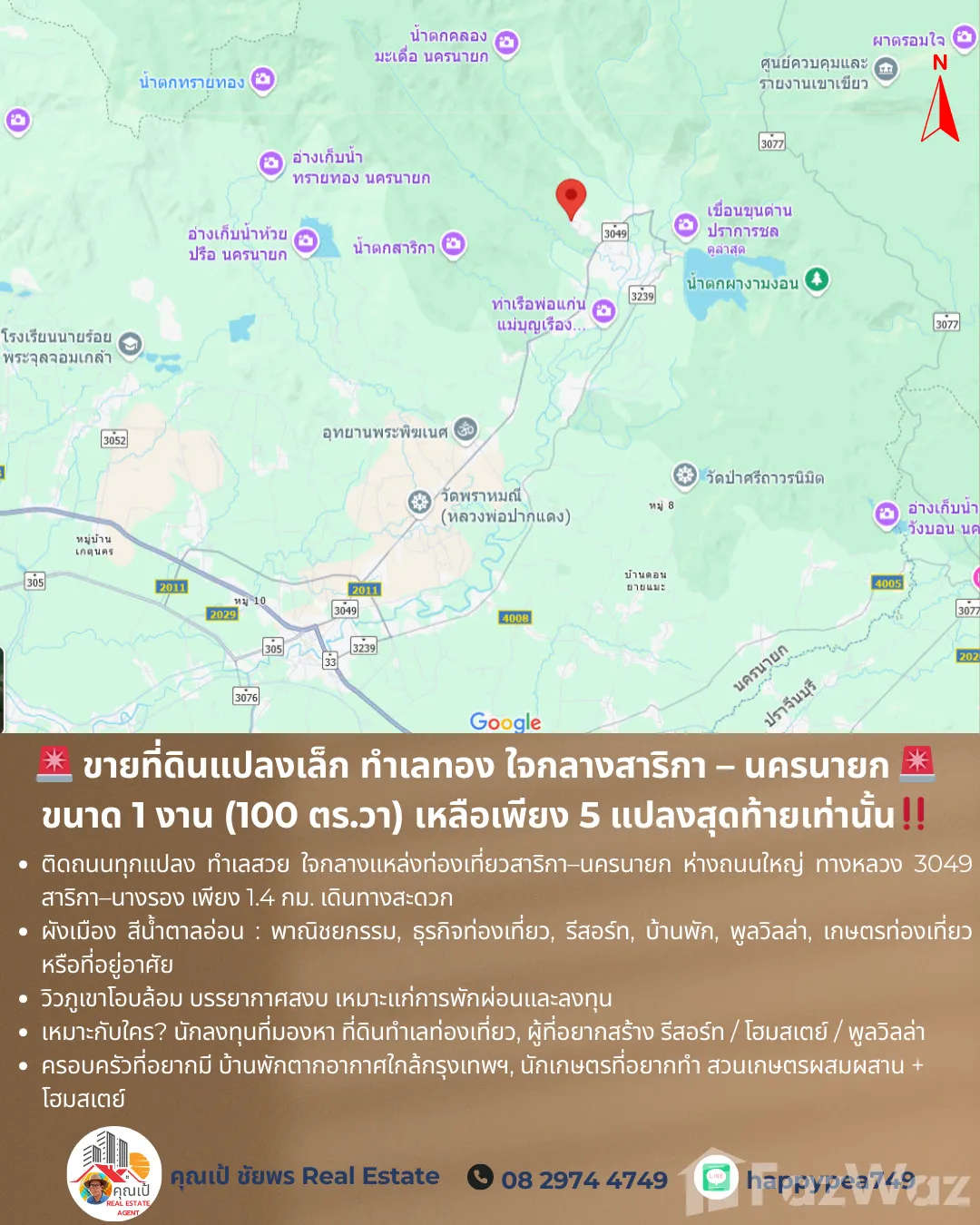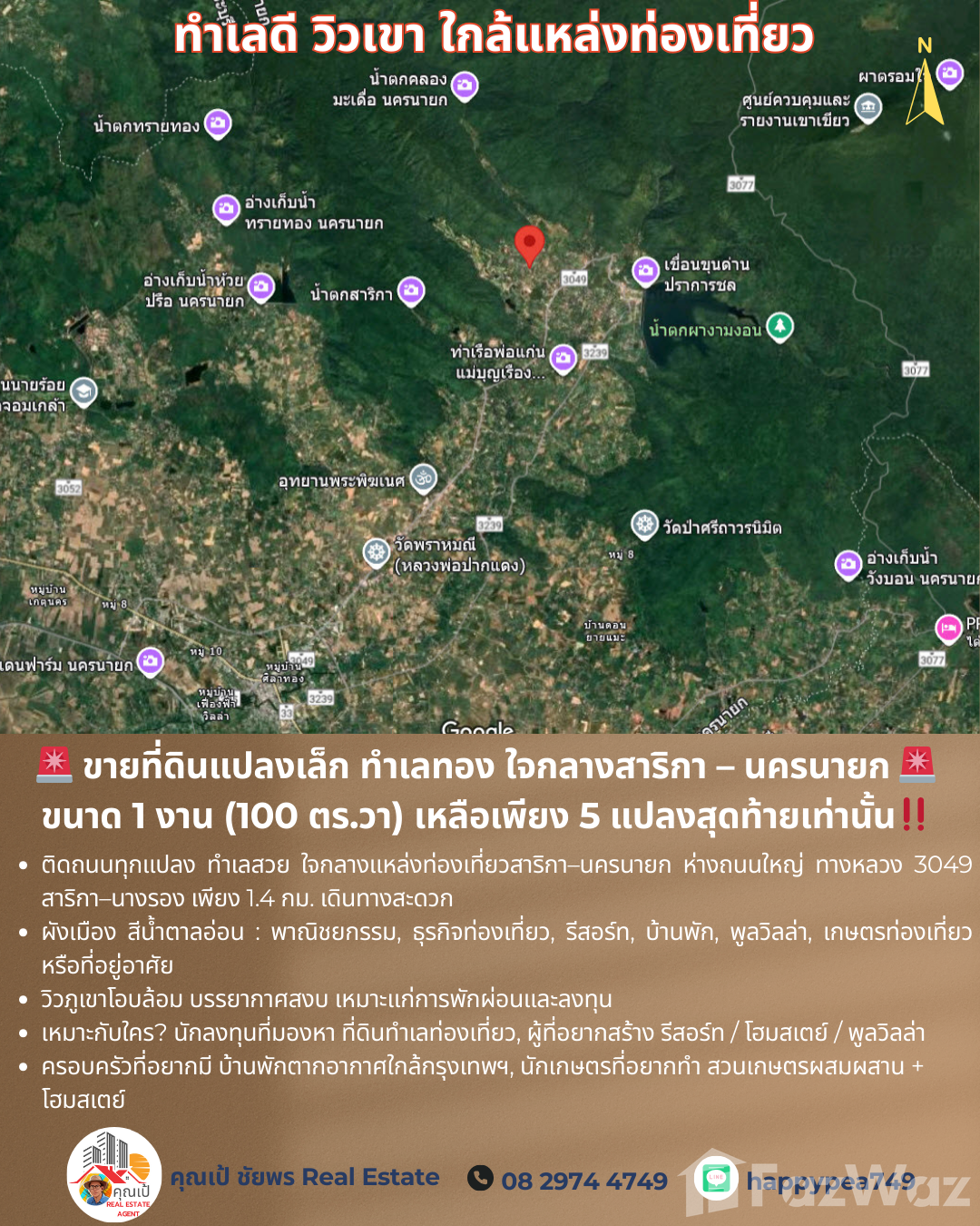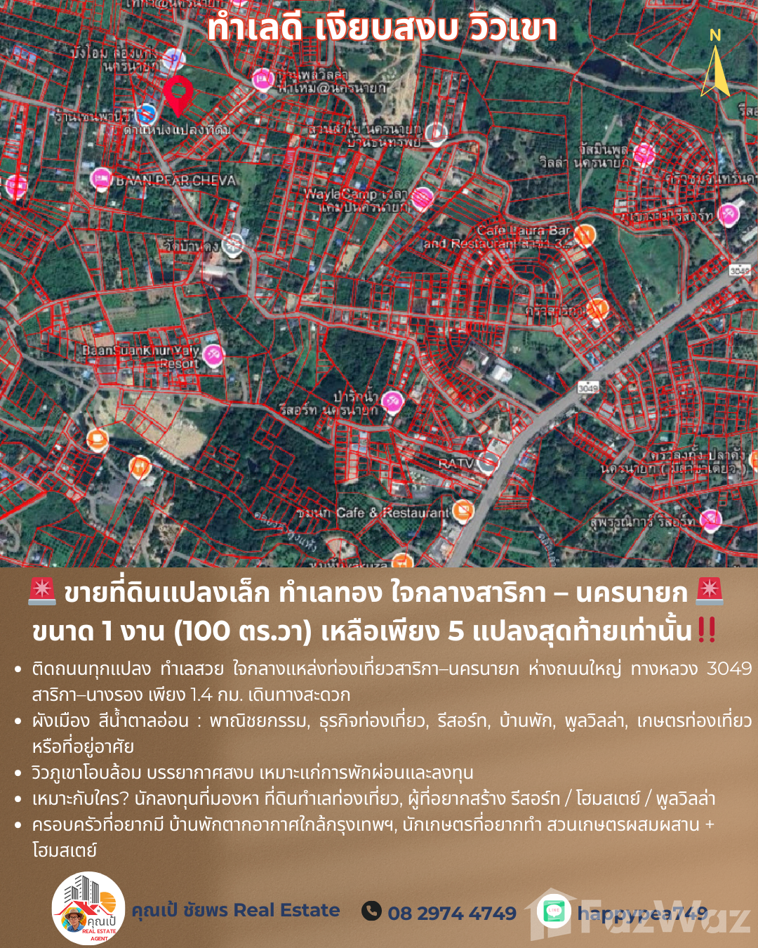 🚨 ขายที่ดินแปลงเล็ก ทำเลทอง ใจกลางสาริกา – นครนายก 🚨 ขนาด 1 งาน (100 ตร.วา) เหลือเพียง 5 แปลงสุดท้ายเท่านั้น‼️🌟 จุดเด่นของที่ดินแปลงนี้ทำเลสวย ใจกลางแหล่งท่องเที่ยวสาริกา–นครนายกห่างถนนใหญ่เพียง 1.4 กม. (ทางหลวง 3049 สาริกา–นางรอง) เดินทางสะดวกผังเมือง สีน้ำตาลอ่อน : พาณิชยกรรม, ธุรกิจท่องเที่ยว, รีสอร์ท, บ้านพัก, พูลวิลล่า, เกษตรท่องเที่ยว หรือที่อยู่อาศัยวิวภูเขาโอบล้อม บรรยากาศสงบ เหมาะแก่การพักผ่อนและลงทุนทางเข้าอยู่ใกล้โรงเรียนบ้านดงวิทยาคาร และทางเข้าวัดบ้านดง ตรงข้าม ดงช้างคาเฟ่📌 ที่ตั้งทำเลศักยภาพ : ถนนบ้านดง 2 ตำบล สาริกา อำเภอเมืองนครนายก นครนายก 26000🧭 พิกัด Google Map : br />📍 สถานที่สำคัญใกล้เคียง     อุทยานวังตะไคร้            2.7 ก.ม.     แก่งสามชั้น                   3.9 ก.ม.     น้ำตกนางรอง                4.4 ก.ม.     เขื่อนขุนด่านปราการชล   5.6 ก.ม.     พุทธอุทยานมาฆบูชาอนุสรณ์ สวนพุทธชยันตี      7.9 ก.ม.     น้ำตกสาริกา                  9.1 ก.ม.     อุทยานพระพิฆเนศ          9.9 ก.ม.     แม็คโคร นครนายก         15.8 ก.ม.     โรงพยาบาลนครนายก     17.8 ก.ม.🗺️ ผังเมือง : เขตสีน้ำตาลอ่อน ประเภทอนุรักษ์เพื่อส่งเสริมเอกลักษณ์ศิลปวัฒนธรรมไทย📐 รายละเอียดที่ดิน  :  แบ่งขายเริ่มต้นขนาด 1 งาน หรือ 100 ตร.วา ขึ้นไป     💰 ราคาพิเศษ 🔹 ราคา 15,900 บาท/ตร.วา รวมเป็นเงิน 1,5900,000 บาท📌 พิเศษ! ผู้ขายออกค่าโอน-ค่าภาษีทั้งหมด!!🌟 ขั้นตอนการซื้อง่าย ๆ : วางจองแปลงที่ถูกใจ → เข้าชื่อแบ่งโฉนด → ได้โฉนดภายใน 3 เดือน💼 เหมาะกับใคร?นักลงทุนที่มองหา ทำเลท่องเที่ยวผู้ที่อยากสร้าง รีสอร์ท / โฮมสเตย์ / พูลวิลล่าครอบครัวที่อยากมี บ้านพักตากอากาศใกล้กรุงเทพฯนักเกษตรที่อยากทำ สวนเกษตรผสมผสาน + โฮมสเตย์🌿 โอกาสทองที่ไม่ควรพลาด! ที่ดินเล็ก ๆ ในทำเลท่องเที่ยวสาริกาแบบนี้ หายากมาก 💥📢สอบถามรายละเอียดเพิ่มเติม ติดต่อ 🤵‍♂️ คุณเป้ ชัยพร | Real Estate Agentรับฝาก ซื้อ-ขาย ที่ดินสวย เพื่อการลงทุน ธุรกิจ การเกษตร อุตสาหกรรม และอยู่อาศัย📞Tel. 08 2974 4749 📟 Line : happypea749  คลิก br />🎉ดูที่ดินแปลงอื่นๆbr />📘Facebooksbr />#ที่ดินนครนายก #ที่ดินสาริกา #ขายที่ดินวิวเขา #ที่ดินแปลงเล็ก #บ้านพักตากอากาศ #ลงทุนรีสอร์ท #พูลวิลล่า #บ้านสวนใกล้กรุงเทพ #ลงทุนอสังหาฯ #ลงทุนที่ดิน