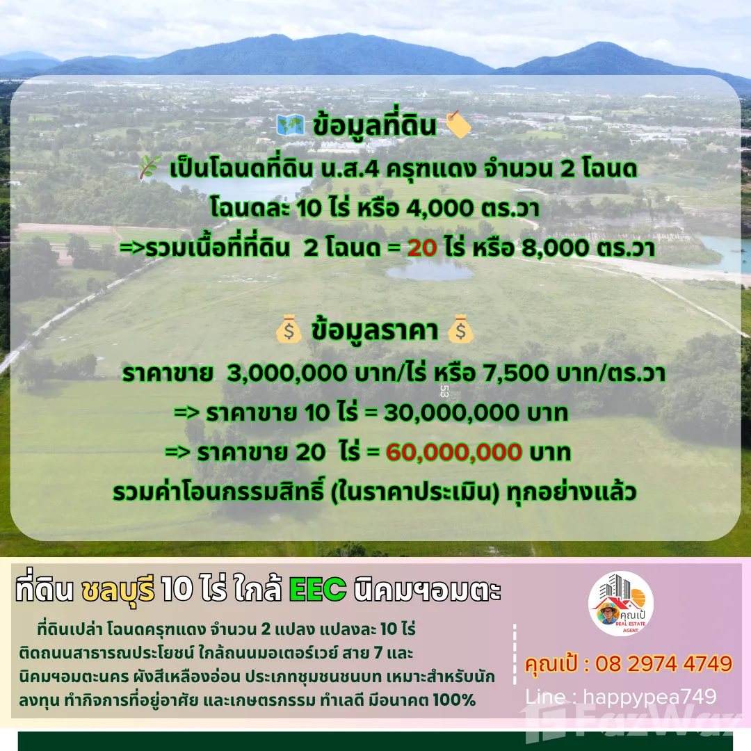 💰 ที่ดินที่ชลบุรีแปลงนี้ เป็นที่ดินเปล่า โฉนดครุฑแดง น.ส.4 ขนาด 10 ไร่ จำนวน 2 แปลงทำเลอยู่ใกล้นิคมอุตสาหกรรมอมตะนคร อยู่ในเขต EEC และอยู่ห่างจากถนนมอเตอร์เวย์ สาย 7 เพียง 5.6 ก.ม.ที่ดินติดถนนสาธารณประโยชน์ มีหน้ากว้างติดถนน ประมาณ 270 เมตร เข้าออกสะดวก น้ำ ไฟ ใกล้ๆแล้ว ขอขยายเขตได้เลยผังเมืองสีเหลืองอ่อน ประเภทชุมชนชนบท ให้ใช้ประโยชน์ในที่ดินเพื่อการอยู่อาศัย เกษตรกรรมที่ดินแปลงนี้เหมาะสำหรับนักลงทุน สำหรับทำการเกษตร บ้านสวน จัดสรรเชิงเกษตร ถ้ามีกำลังอยากให้รีบเก็บไว้ อนาคตมีกำไรแน่นอนครับ🚧 ที่ตั้ง      ตำบล สำนักบก อำเภอเมืองชลบุรี ชลบุรี 20000 📍การปักหมุดนำทาง      พิกัด แปลงที่ดิน br />📍 สถานที่สำคัญใกล้เคียง     ห่างจาก ถนนมอเตอร์เวย์ สาย 7 (ด่านพนัสนิคม)      5.6 กิโลเมตร     ห่างจาก นิคมอุตสาหกรรมอมตะนคร                        8  กิโลเมตร     ห่างจาก โรงพยาบาลชลบุรี                                   13 กิโลเมตร     ห่างจาก โรงพยาบาลสมิติเวชชลบุรี                     13.6 กิโลเมตร     ห่างจาก เซ็นทรัล ชลบุรี                                       16 กิโลเมตร     ห่างจาก แม็คโคร ชลบุรี                                       16 กิโลเมตร     ห่างจาก สะพานชลมารควิถี                                 13.6 กิโลเมตร🧶 ผังเมือง เป็นสีเหลืองอ่อน ประเภทชุมชนชนบท🗺️ ข้อมูลที่ดิน     🌿 เป็นโฉนดที่ดิน น.ส.4 ครุฑแดง จำนวน 2 โฉนด ติดถนนสาธารณประโยชน์ หน้ากว้าง 270 เมตร 🏷️      =>ที่ดิน เนื้อที่ 10-0-0.0 ไร่ หรือ 4,000 ตร.วา   💰 ข้อมูลราคา      ราคาขาย  3,000,000 บาท/ไร่ หรือ 7,500 บาท/ตร.วา=> ราคาขาย 10 ไร่ = 30,000,000 บาท  รวมค่าโอนกรรมสิทธิ์ (ในราคาประเมิน) ทุกอย่างแล้ว🌟 โอกาสดีในการลงทุนที่คุณไม่ควรพลาด! 🔑ผมเป็นนายหน้าอิสระ รู้จักกับเจ้าของที่ดินแปลงนี้ 100% ราคาจากเจ้าของ ไม่ได้ผ่านใคร สายสั้นที่สุด ปรึกษาพูดคุยกันได้ครับ📢สอบถามรายละเอียดเพิ่มเติม พูดคุยได้ สบายๆ เป็นกันเอง ติดต่อ 🤵คุณเป้ ชัยพรรับฝาก ซื้อ-ขาย ที่ดินสวย เพื่อการลงทุน ธุรกิจ การเกษตร อุตสาหกรรม และอยู่อาศัย📞Tel. 08 2974 4749 📟 Line : happypea749  คลิก br />🎉ดูที่ดินแปลงอื่นๆbr />#ที่ดินชลบุรี #ที่ดินพนัสนิคม #ที่ดินพานทอง #อมตะนคร #สำนักบก #ลำลูกกาคลอง12 #ชลบุรี #ศุขประยูร #พานทอง #พนัสนิคม #20ไร่ #นักลงทุน #ที่ดิน10ไร่ #ที่ดินโฉนด #ที่ดินติดถนน #ถนนคอนกรีต #โอกาสการลงทุน #อสังหาริมทรัพย์ #ที่ดินเปล่า #ที่นา #ดอนหัวฬ่อ#นายหน้า #ภาษีที่ดิน #พูลวิลล่า #สวนเกษตร #ร้านอาหาร #คาเฟ่ #รีสอร์ต #การลงทุน #EEC #ครุฑแดง