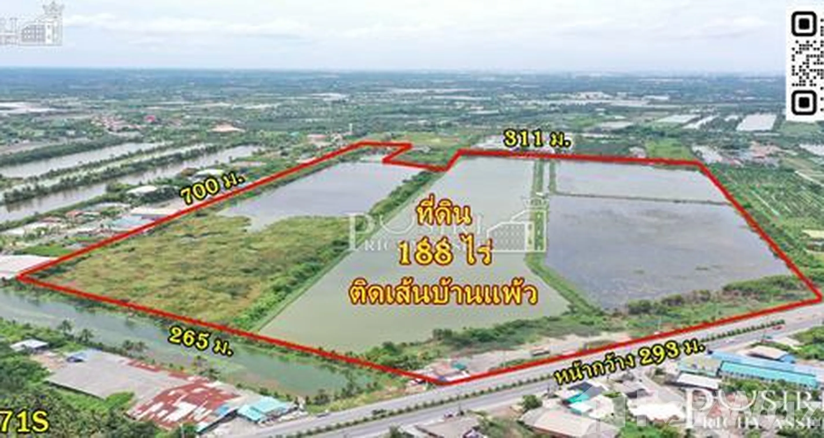 เป็นไปไม่ได้ที่จะมองไม่เห็น ที่สวยเด่น สะดุดตา ติดถนนบ้านแพ้ว หน้ากว้างมหาศาล เกือบ 300 เมตร รูปทรงเป็นเหลี่ยมใช้ได้ทุกด้าน ไม่หยักไม่โค้ง รับประกันว่าคุณจะไม่เสียประโยชน์ต่อพื้นที่การใช้สอยไปสักตารางนิ้วเดียว แถมใช้งานง่ายติดถนน 2 ด้านทั้งด้านหน้าและด้านหลัง