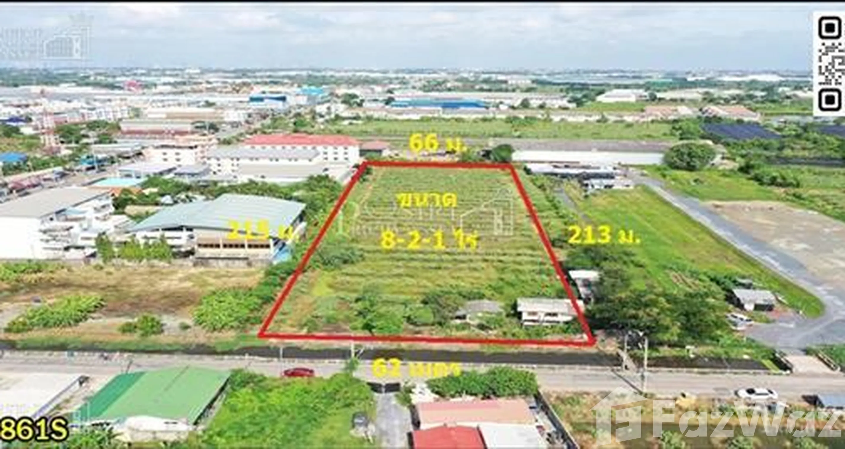 ที่ดินแปลงสวยรูปทรงสี่เหลี่ยมผืนผ้า ขนาด 8-2-1 ไร่ วางแปลนง่ายสร้างโรงงานขนาดใหญ่ได้ถึง 6,000ตารางเมตร อยู่ในตำบลแคราย ที่ดินด้านหน้ากว้าง 62 เมตร ติดคลองหมื่นปรารมย์ ติดถนนคอนกรีตกว้าง 8 เมตร เลียบคลองหมื่นปรารมย์