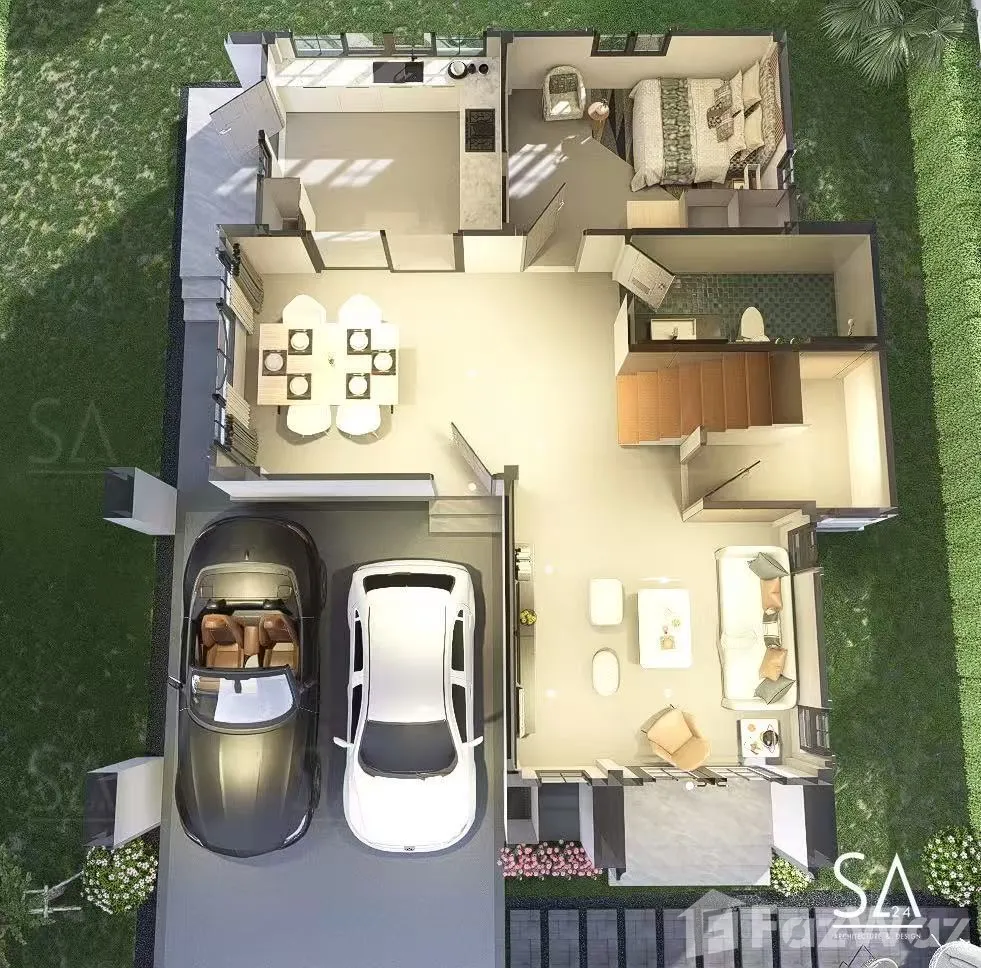 สวนส่วนตัวสวนส่วนตัว เข้าถึงสวนส่วนกลางได้เข้าถึงสวนส่วนกลางได้ ชานบ้านชานบ้าน ที่จอดรถที่จอดรถ ระเบียงระเบียง