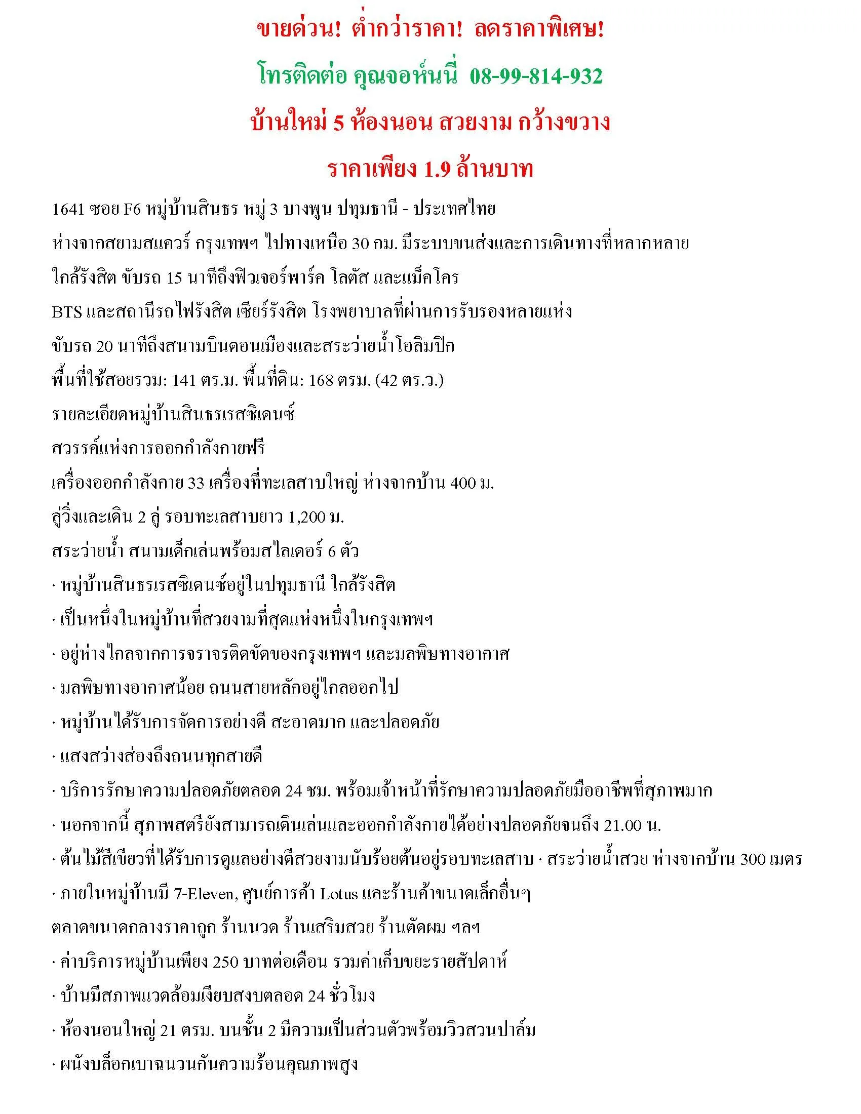 อสังหาริมทรัพย์นี้เป็น บ้านเดี่ยว สำหรับขาย ขนาด 5 ห้องนอน มีพื้นที่ใช้สอย 141 ตรม. อยู่ในทำเล บางพูน, ปทุมธานี และสร้างเสร็จแล้วเมื่อ มี.ค. 2568 ซึ่งคุณสามารถซื้อ บ้านเดี่ยว นี้ได้ที่ราคา ฿1,900,000 (฿13,475/ตรม.)
