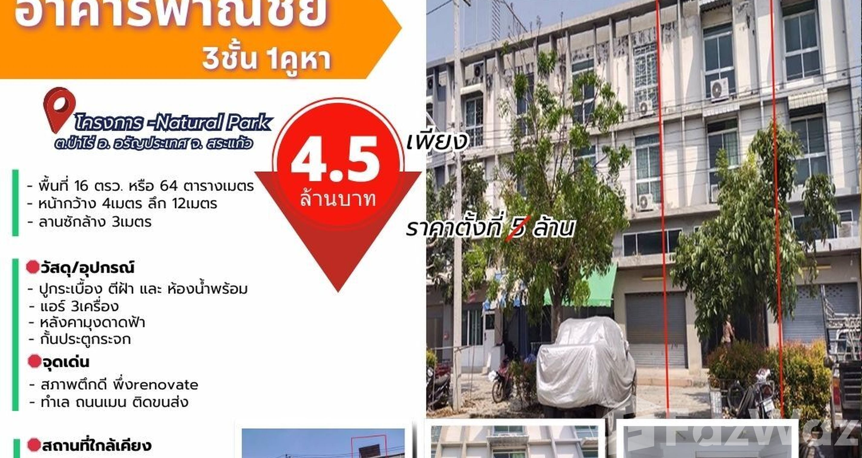 ด่วน!! ขาย ตึก อาคารพาณิชย์ 3ชั้น 1คูหา อ.อรัญประเทศ จ.สระแก้ว **ปล่อยขายใน ราคา 4,500,000 บาท** 📌พิกัด : ติดตลาดโรงเกลือ : โครงการ -Natural Park ต.ป่าไร่ อ. อรัญประเทศ จ. สระแก้ว 27120 🛑ลักษณะอาคาร - อาคารพานิชย์ 3ชั้น 1คูหา ⏭️หน้ากว้าง 4เมตร ลึก12เมตร ลานซักล้าง 3 เมตร พื้นที่ใช้สอย 16 ตารางวา หรือ 64 ตารางเมตร⏪ 🌿สิ่งอำนวยความสะดวก🌿 - 2ห้องน้ำ - 3ห้องนอน - 1ดาดฟ้า มุงหลังคาเรียบร้อย - 1แท็งค์น้ำ - แอร์ 3เครื่อง - กั้นประตูกระจก - ปูกระเบื้อง/ตีฝ้า และ ห้องน้ำพร้อม 🛑จุดเด่น - สภาพตึกดี พึ่ง Renovateใหม่ - ทำเลดี ถนนเมน ติดขนส่ง 🌿🌿 อาคารใหม่ สะอาด ปลอดภัย 🌿🌿 🛑สถานที่ใกล้เคียง - ติดตลาดโรงเกลือ - ตลาดรัตนธรรม - ตลาดโกลเด้น เกด พลาซ่า - ตลาดหลังคาฟ้า - ตลาดเบญจวรรณ - ด่านศุลกากร - สถานีรถไฟอรัญประเทศ ****ทำเลดี อยู่แหล่งชุมชน เหมาะ เปิดหน้าร้านขายของ หรือที่สต๊อก สินค้า สะดวกในการ ขนส่ง สินค้า**** **อยู่แล้วเฮง อยู่แล้วดี อยู่แล้วรวยยย** 👉 ราคาไม่แพง ☎️📞 สนใจติดต่อ 063-824-2415 หรือ@LINE : @853vgaln #ขายอาคารพาณิชย์อรัญประเทศ #ขายอาคารพาณิชย์สระแก้ว #อาคารพาณิชย์ปล่อยขาย #หาที่ขายของ #อรัญประเทศ #สระแก้ว #ตึกปล่อยขาย #อาคารพาณิชย์ปล่อยขาย #เปิดร้านขายของ #ออฟฟิศสำนักงาน