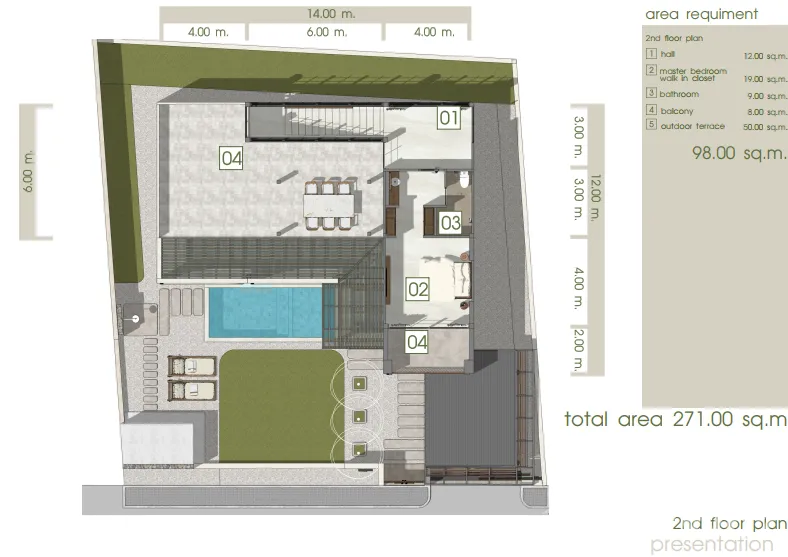 เป็นการรวมขนาดของพื้นที่ก่อสร้างภายนอก เช่น สระว่ายน้ำ, ชานบ้าน, ที่จอดรถ และ ศาลา แต่จะไม่รวมพื้นที่สวนเข้าไปด้วย