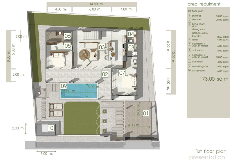 อสังหาริมทรัพย์นี้เป็น วิลล่า สำหรับขาย ขนาด 2 ห้องนอน มีพื้นที่ใช้สอย 110 ตรม. อยู่ในทำเล ตลิ่งงาม, สุราษฎร์ธานี และมีแผนการก่อสร้างให้แล้วเสร็จใน ต.ค. 2569 ซึ่งคุณสามารถซื้อ วิลล่า นี้ได้ที่ราคา ฿6,900,000 (฿62,727/ตรม.)