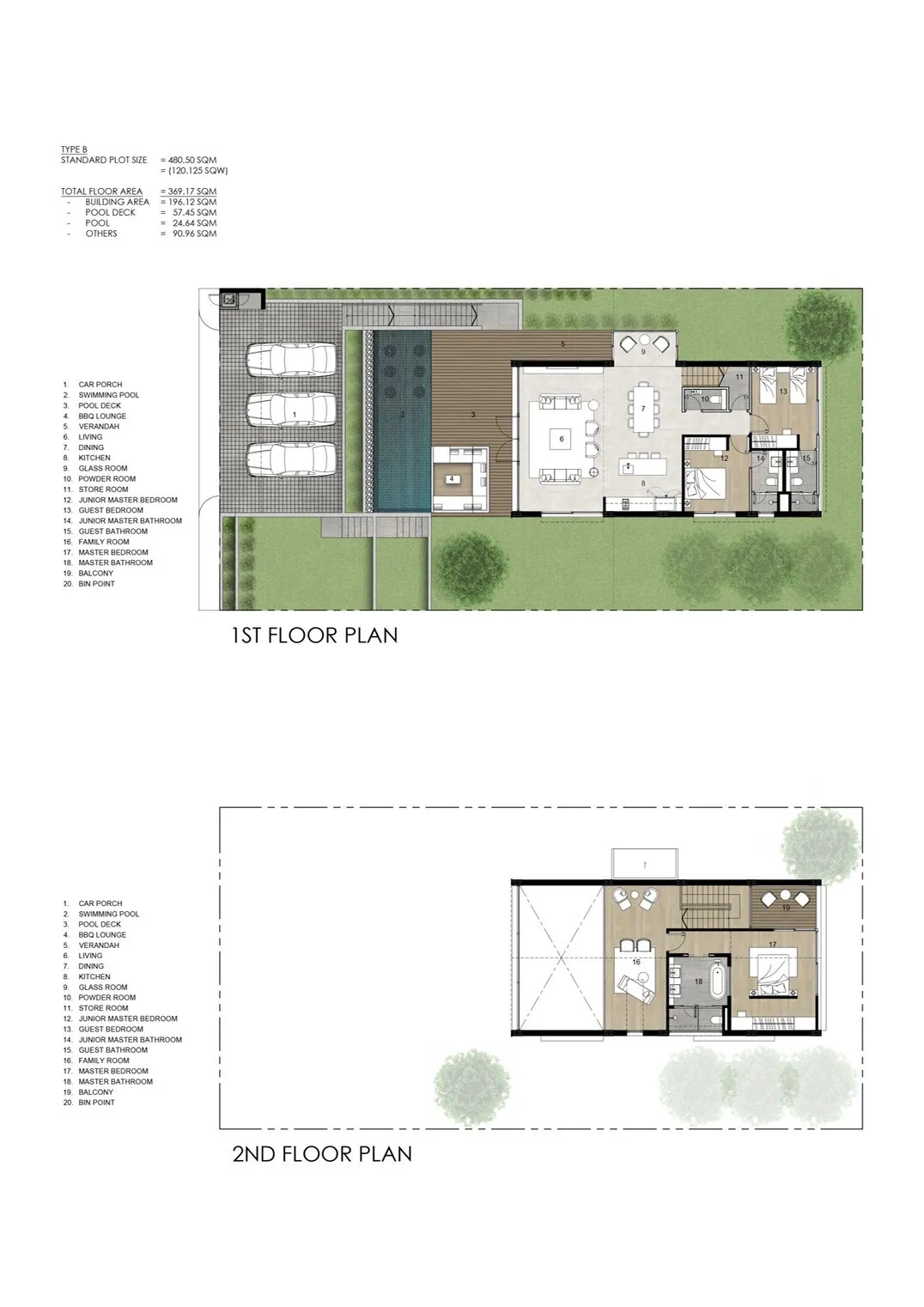 เป็นการรวมขนาดของพื้นที่ก่อสร้างภายนอก เช่น สระว่ายน้ำ, ชานบ้าน, ที่จอดรถ และ ศาลา แต่จะไม่รวมพื้นที่สวนเข้าไปด้วย