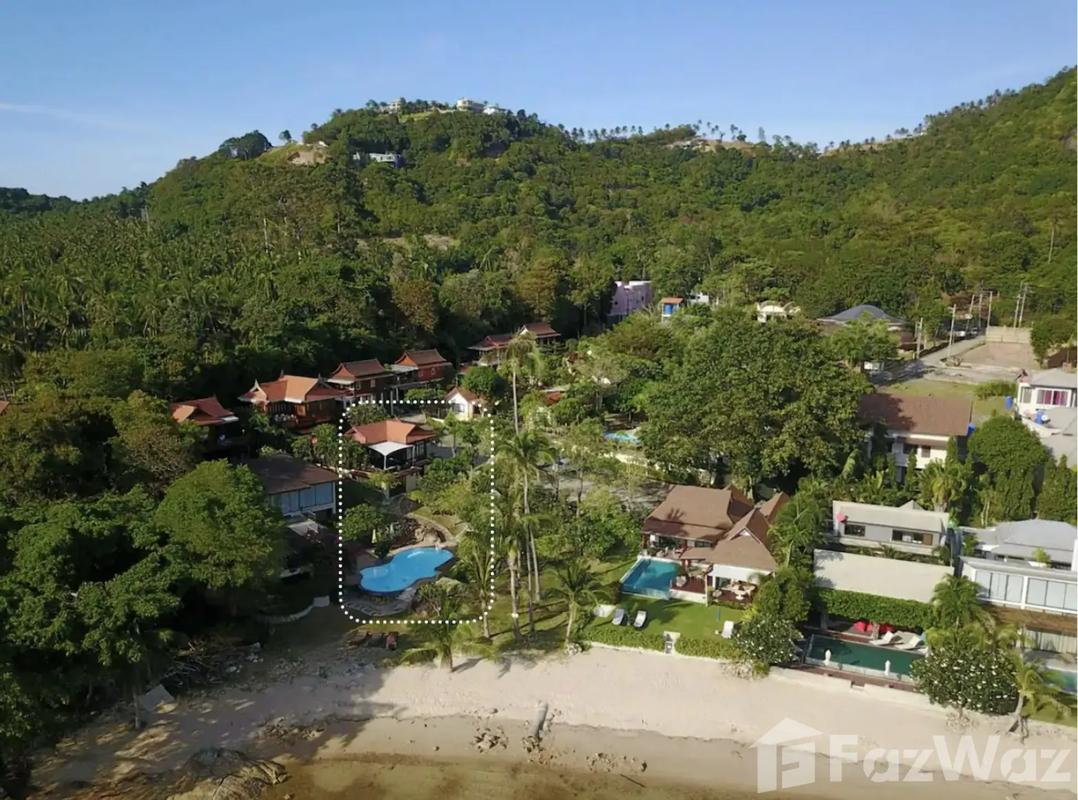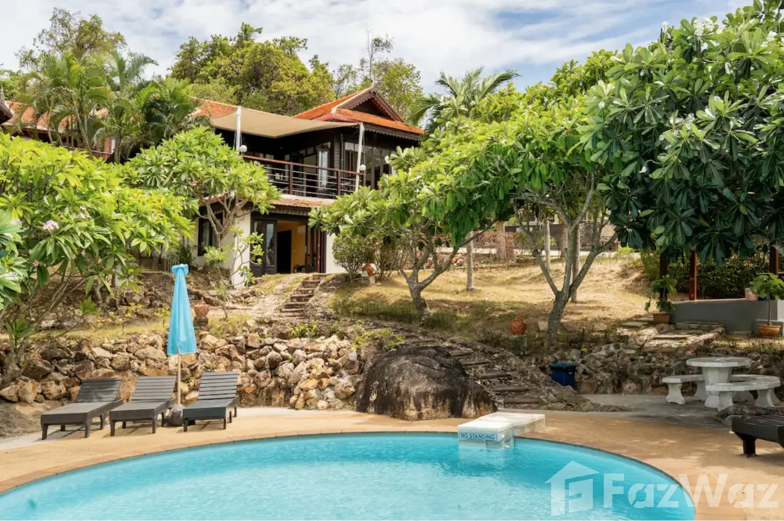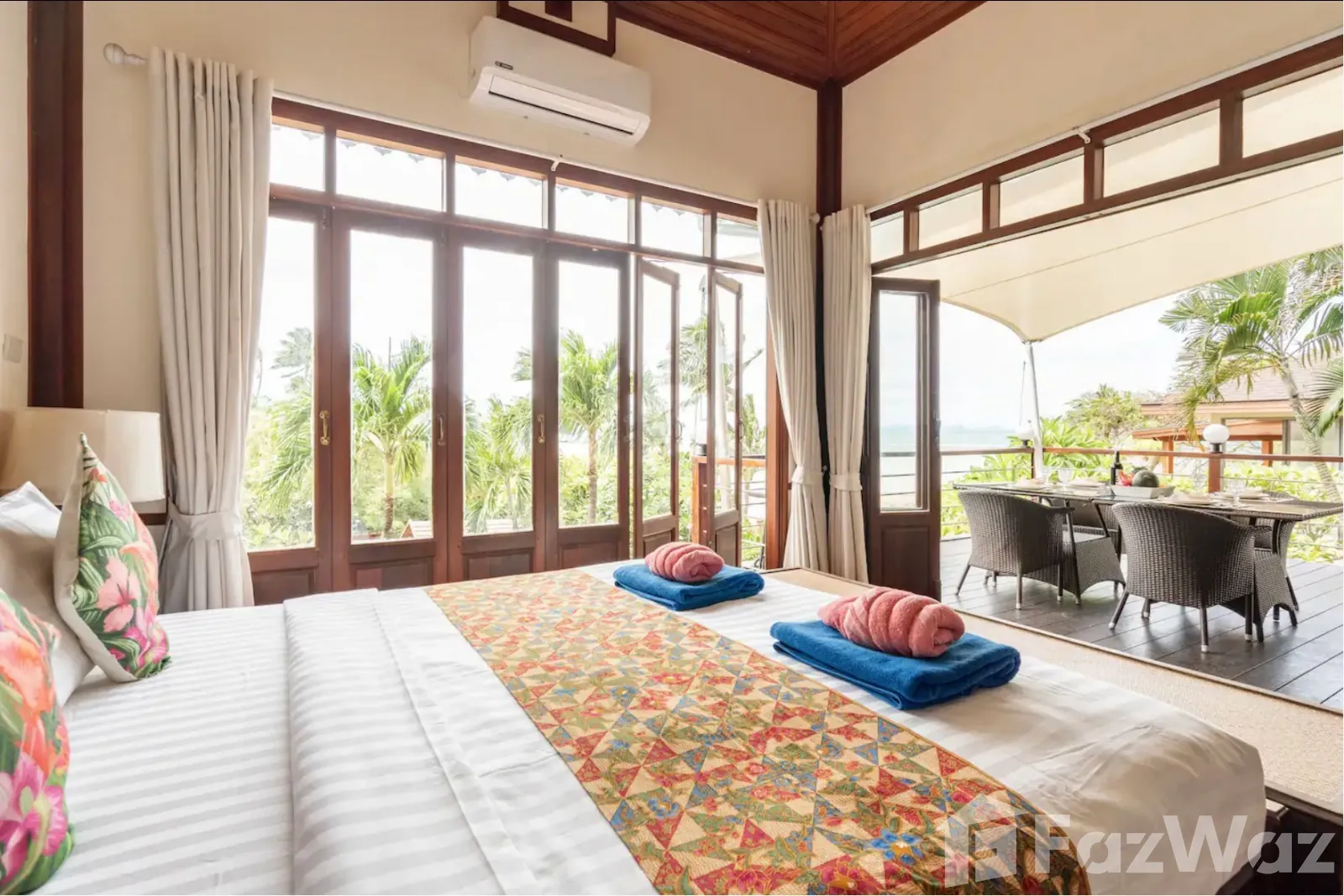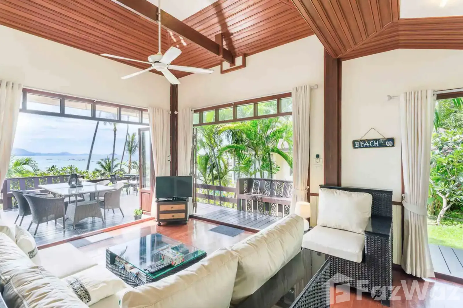 ที่พักติดหาด ในสไตล์ไทย ๆ ทั้งการออกแบบวิลล่าและการตกแต่ง เน้นการใช้วัสดุจากไม้ ให้กลิ่นอายที่แสดงถึงความเป็นไทยมาก ๆ บรรยากาศดีและเป็นส่วนตัว เหมาะกับการพักผ่อนกับครอบครัวในวันที่พิเศษ เพราะมีห้องถึง 3 ห้องนอน ภายในกว้างขวาง มีสระว่ายน้ำส่วนตัวและพื้นที่พักผ่อนริมสระ ชิลล์มาก ๆ และห่างจากท่าเรือหน้าทอนเพียง 4 กิโลเมตรเท่านั้