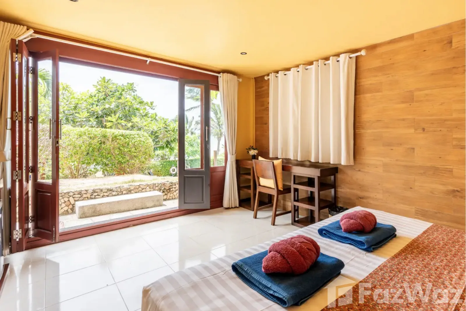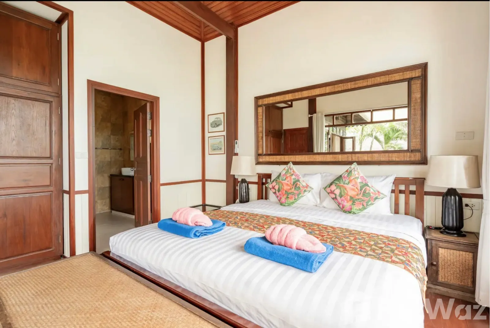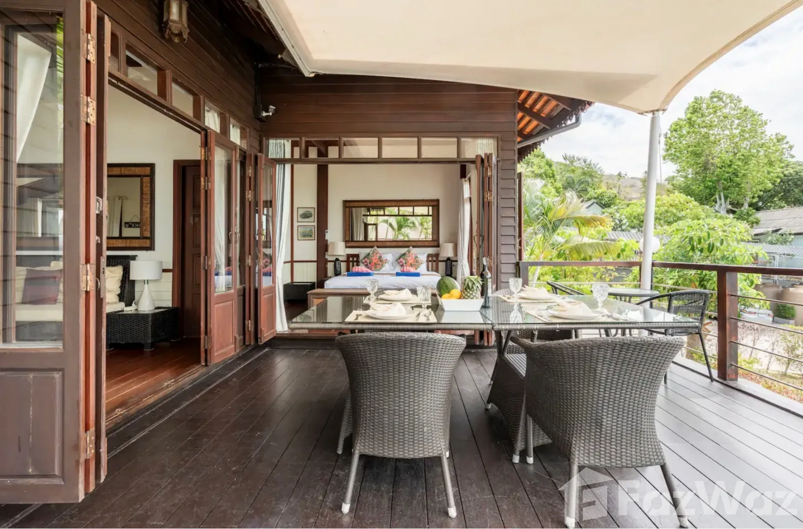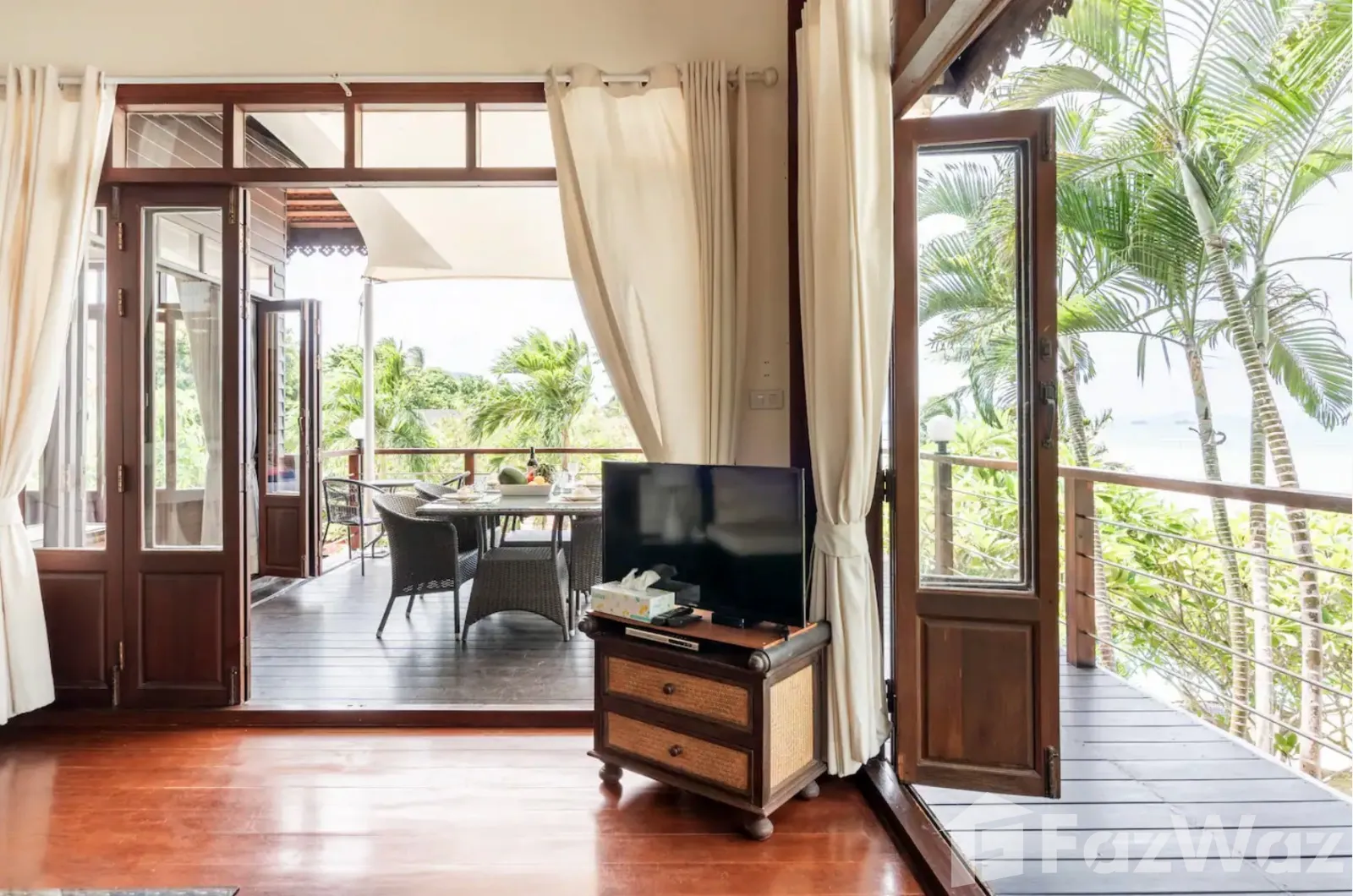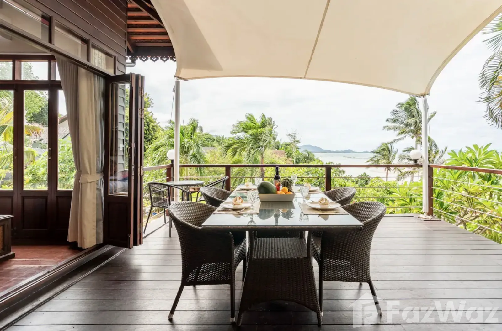 ที่พักติดหาด ในสไตล์ไทย ๆ ทั้งการออกแบบวิลล่าและการตกแต่ง เน้นการใช้วัสดุจากไม้ ให้กลิ่นอายที่แสดงถึงความเป็นไทยมาก ๆ บรรยากาศดีและเป็นส่วนตัว เหมาะกับการพักผ่อนกับครอบครัวในวันที่พิเศษ เพราะมีห้องถึง 3 ห้องนอน ภายในกว้างขวาง มีสระว่ายน้ำส่วนตัวและพื้นที่พักผ่อนริมสระ ชิลล์มาก ๆ และห่างจากท่าเรือหน้าทอนเพียง 4 กิโลเมตรเท่านั้