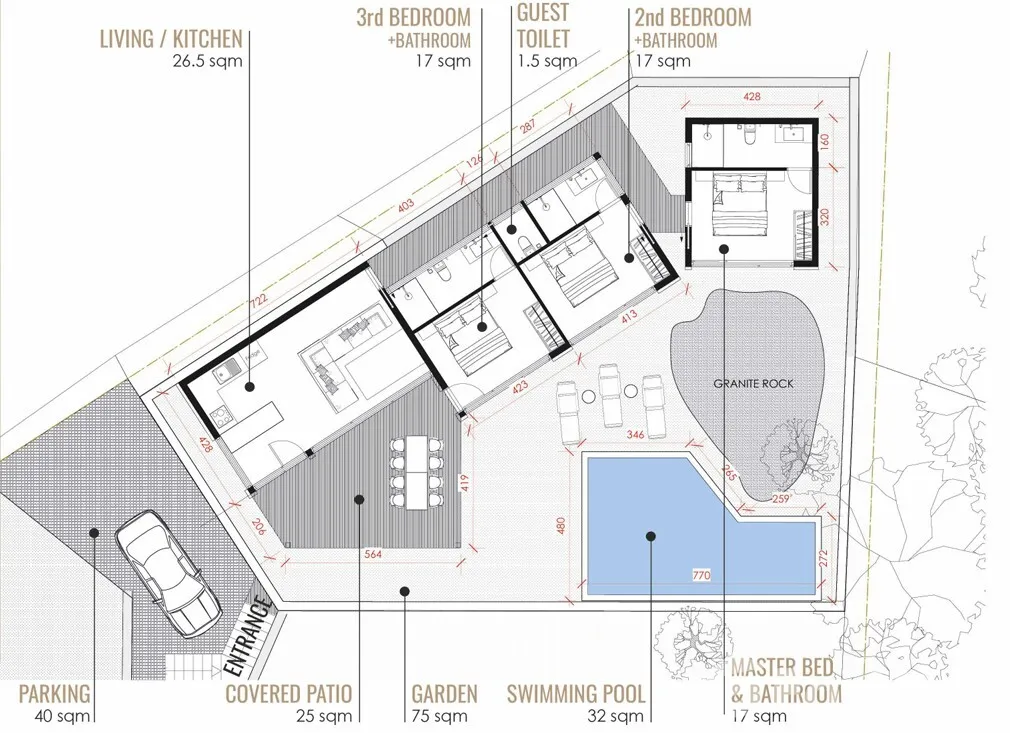 เป็นการรวมขนาดของพื้นที่ก่อสร้างภายนอก เช่น สระว่ายน้ำ, ชานบ้าน, ที่จอดรถ และ ศาลา แต่จะไม่รวมพื้นที่สวนเข้าไปด้วย