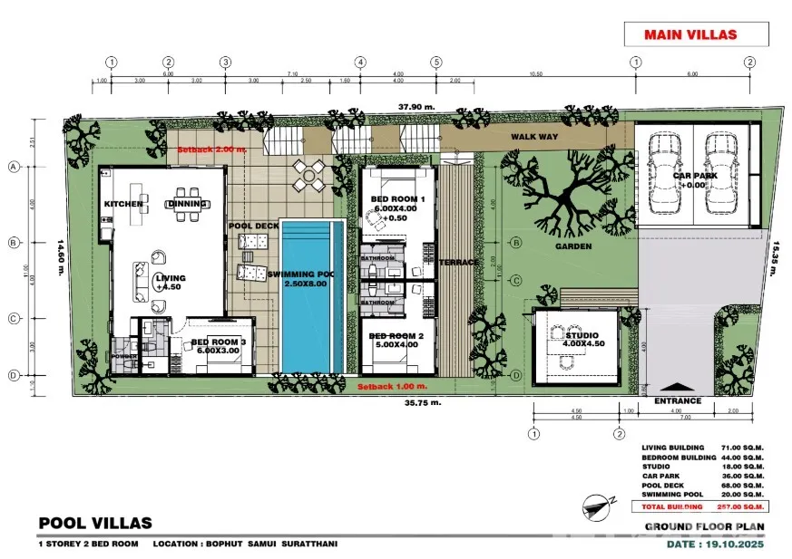 อสังหาริมทรัพย์นี้เป็น วิลล่า สำหรับขาย ขนาด 4 ห้องนอน มีพื้นที่ใช้สอย 240 ตรม. อยู่ในทำเล บ่อผุด, สุราษฎร์ธานี และมีแผนการก่อสร้างให้แล้วเสร็จใน ธ.ค. 2570 ซึ่งคุณสามารถซื้อ วิลล่า นี้ได้ที่ราคา ฿22,950,000 (฿95,625/ตรม.)