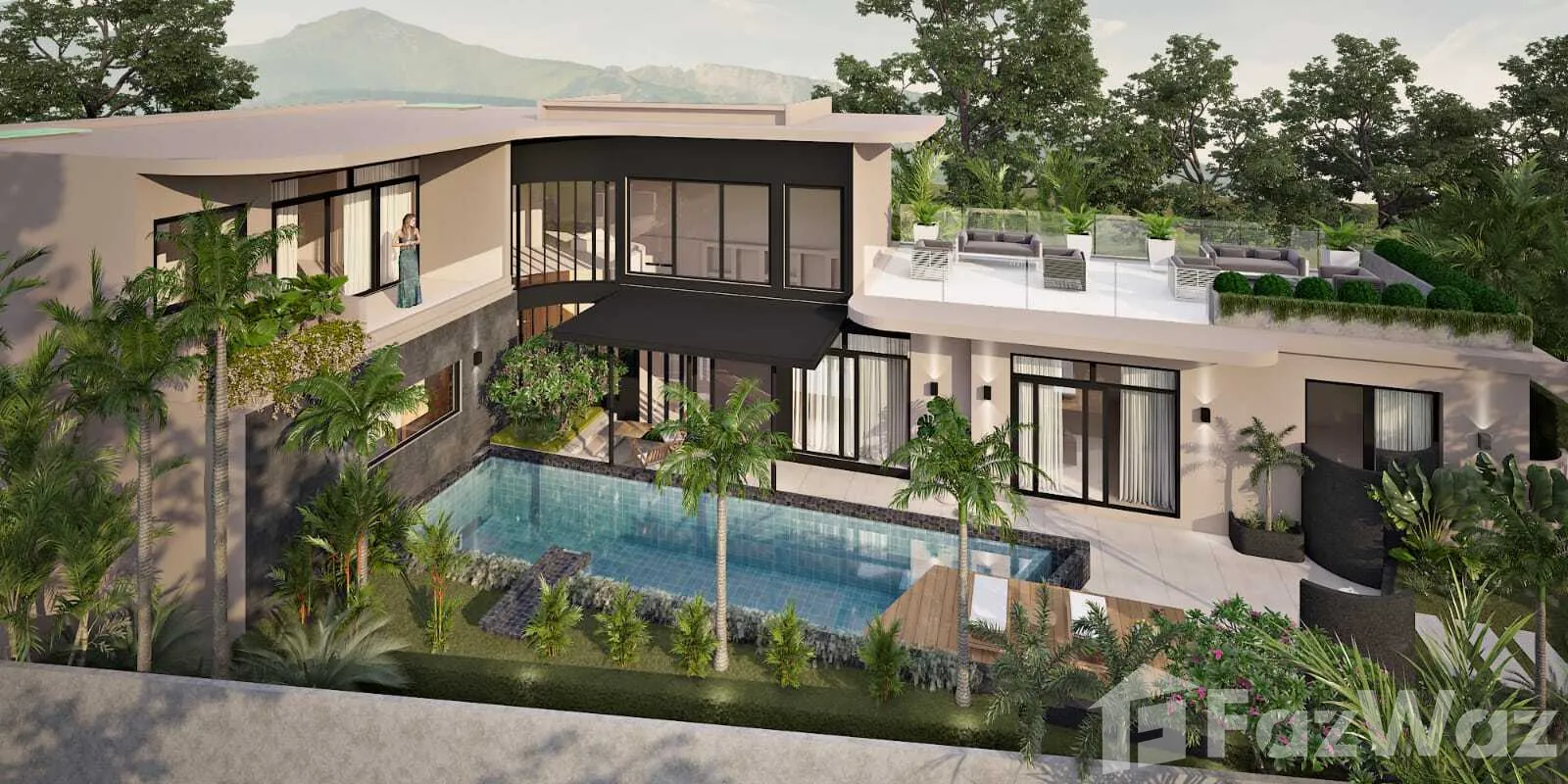 สระว่ายน้ำส่วนตัวสระว่ายน้ำส่วนตัว ดาดฟ้าดาดฟ้า ชานบ้านชานบ้าน ที่จอดรถที่จอดรถ ระเบียงระเบียง