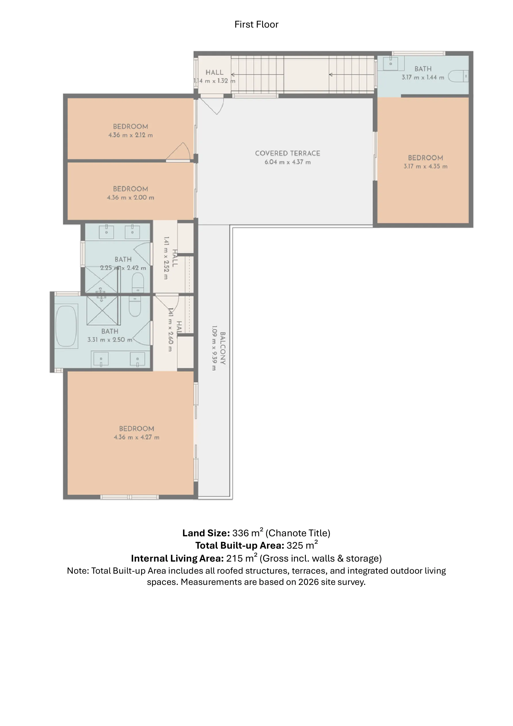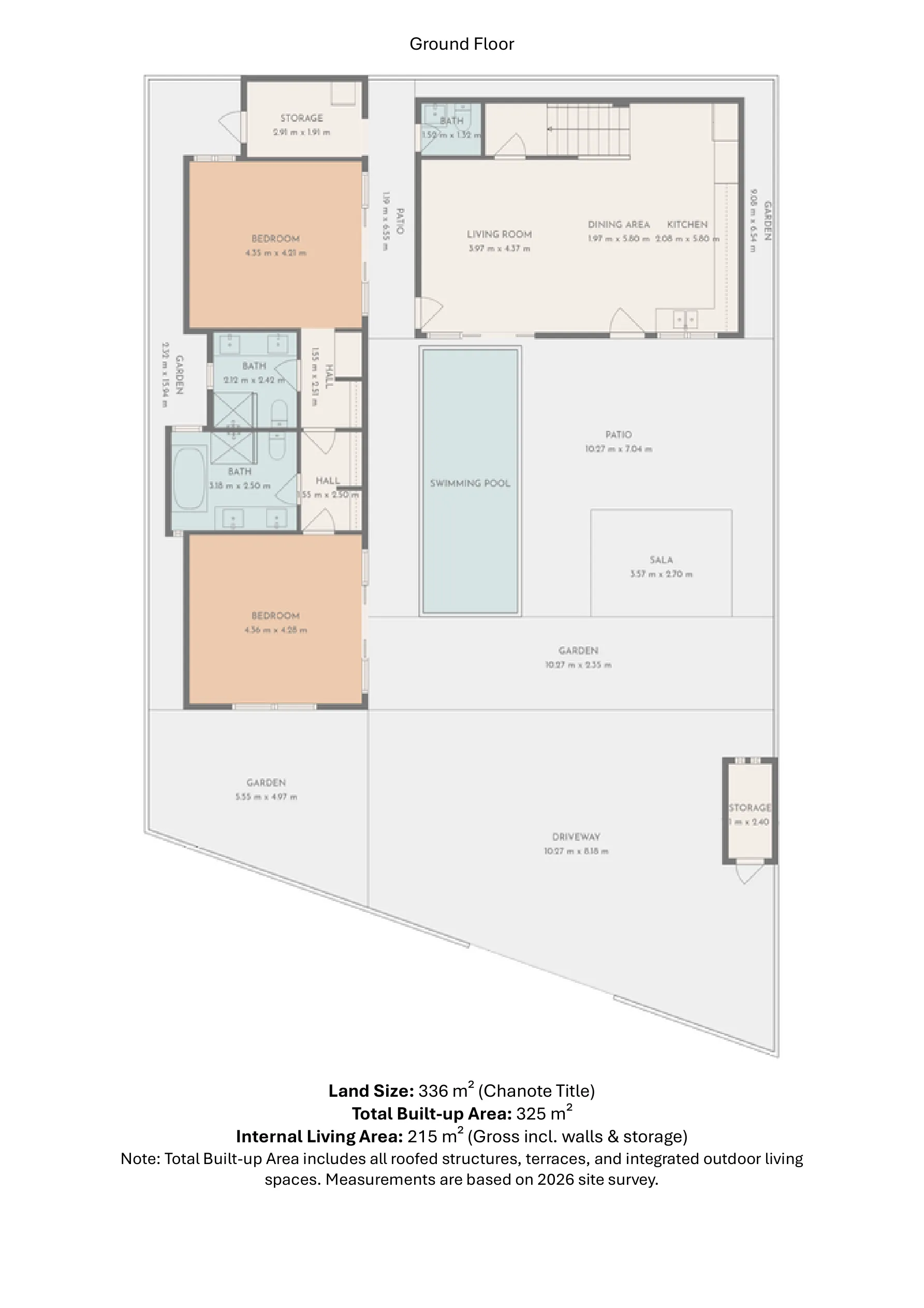 เป็นการรวมขนาดของพื้นที่ก่อสร้างภายนอก เช่น สระว่ายน้ำ, ชานบ้าน, ที่จอดรถ และ ศาลา แต่จะไม่รวมพื้นที่สวนเข้าไปด้วย