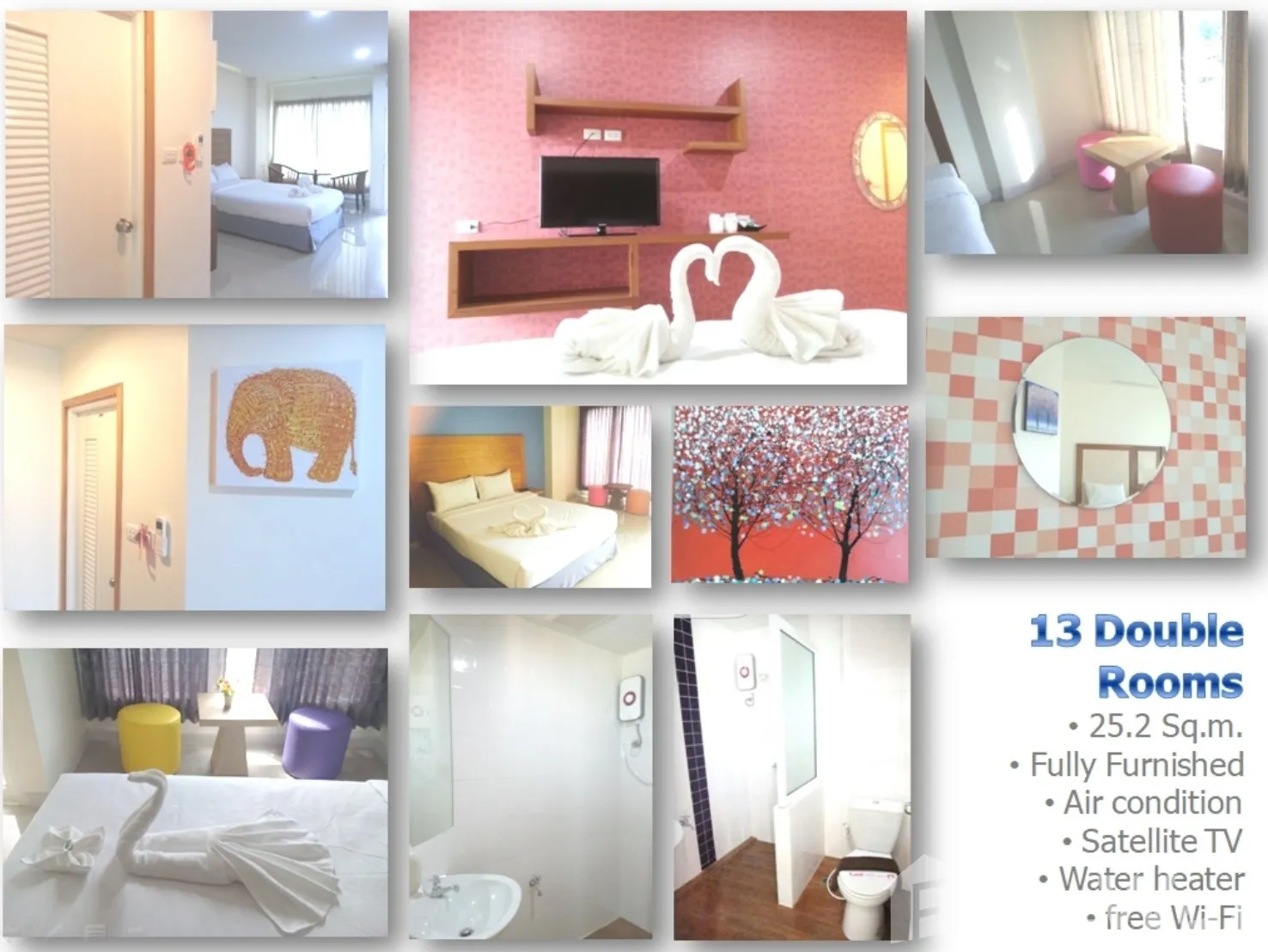 • ห้องพัก 33 ห้อง • มาตรฐาน 32 ห้อง (25.2 ตร.ม.) – เตียงเดี่ยว 13 / เตียงคู่ 19 • ห้องสูท 1 ห้อง (75.6 ตร.ม.) – ห้องนอน/นั่งเล่น/น้ำ/ระเบียง